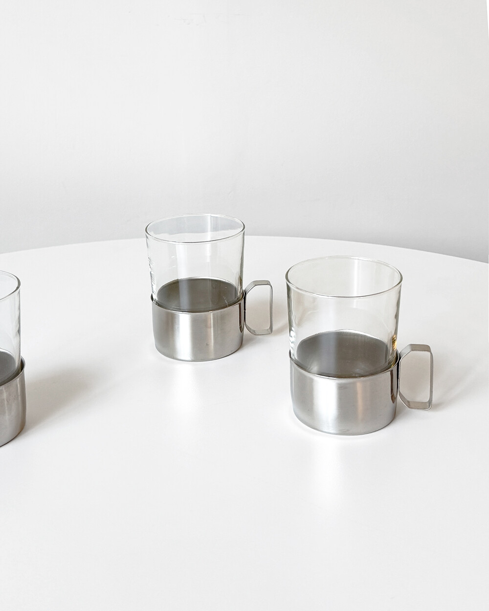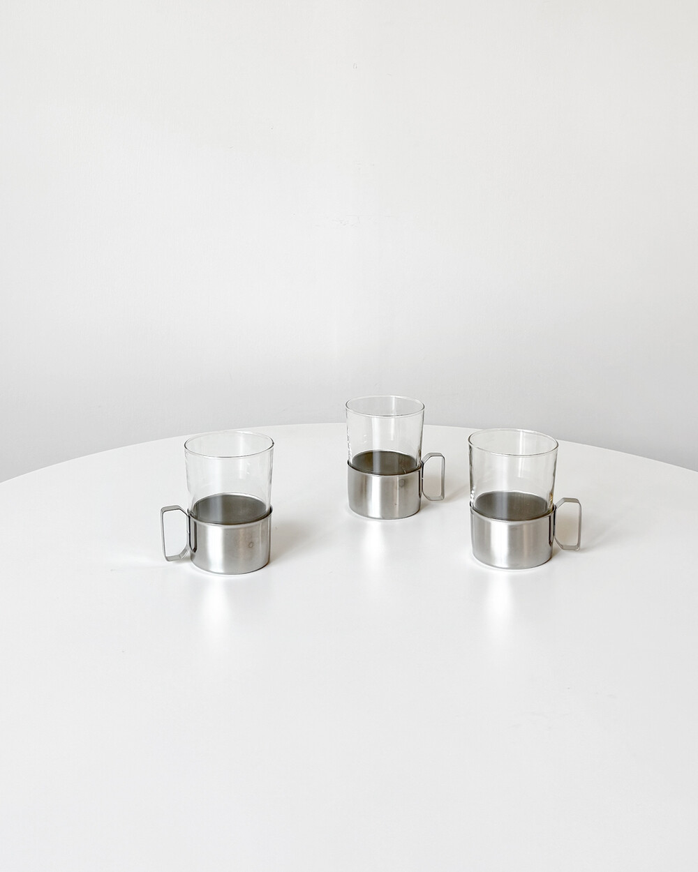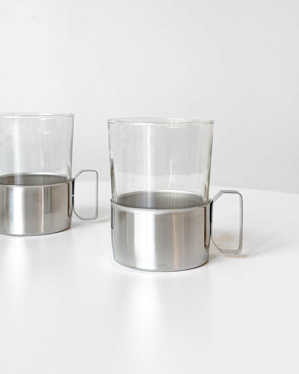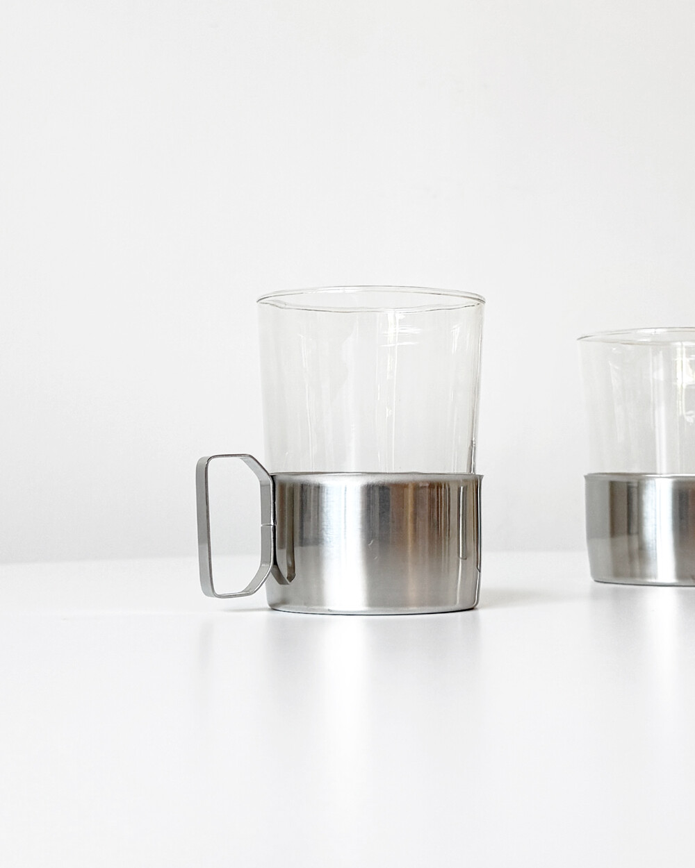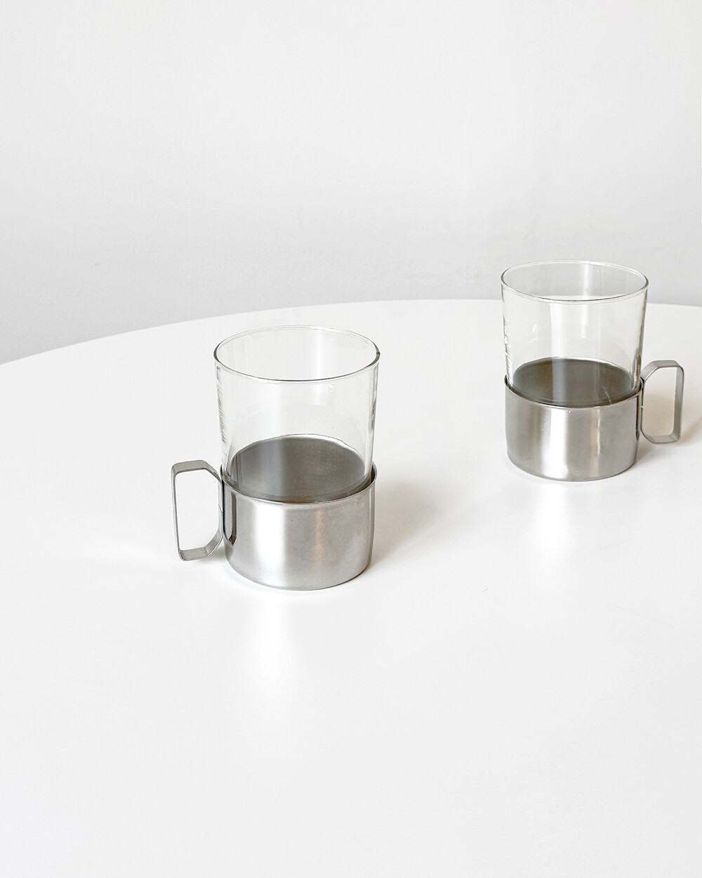 심플한 실루엣에 독특한 쉐입의 핸들이 더해진 70–80년대 Duralex의 빈티지 컵입니다. 직선적인 유리컵과 스테인리스 홀더가 조화를 이루는 모던한 디자인으로, 따뜻한 음료를 담을 수 있도록 내열유리가 사용되었습니다.