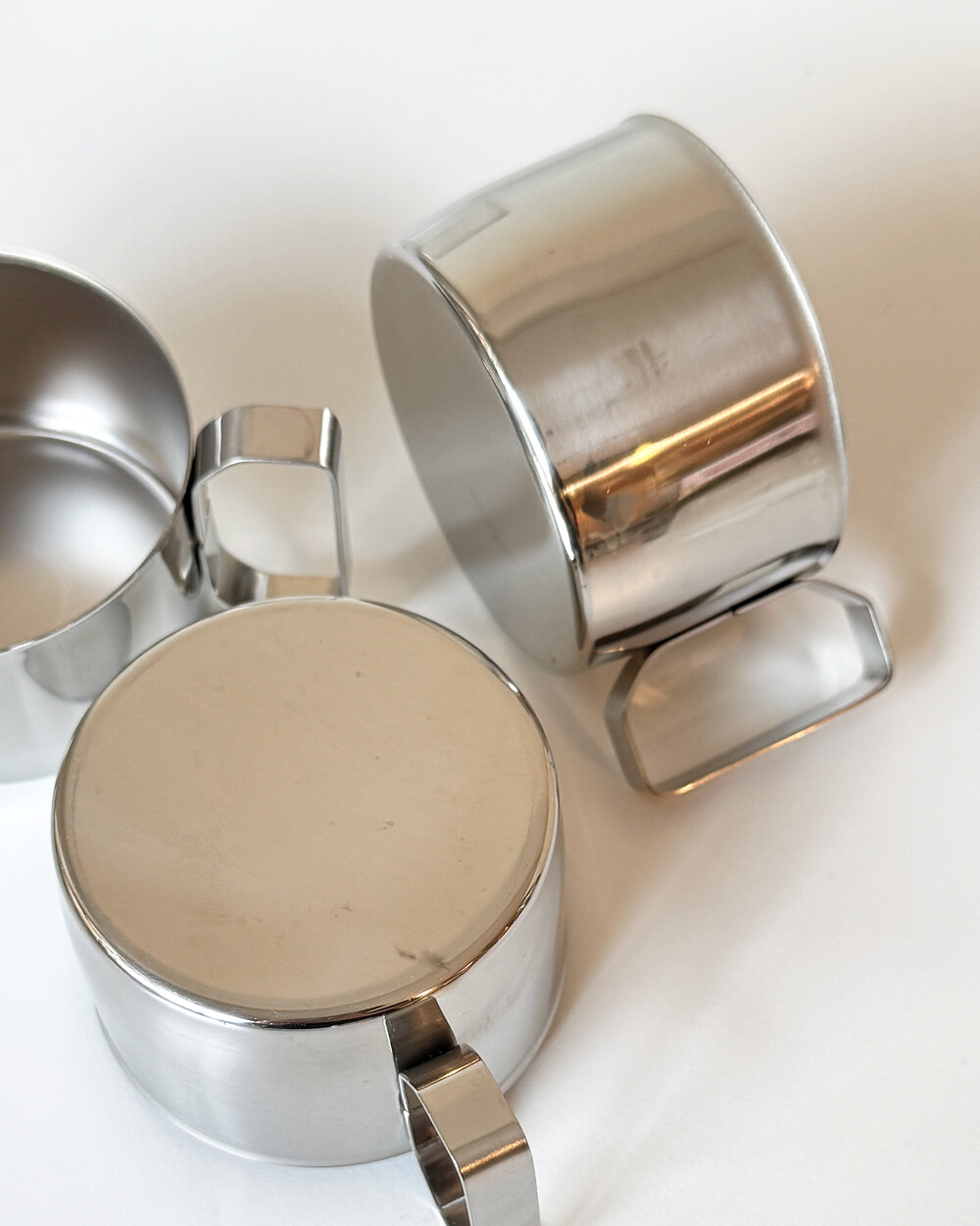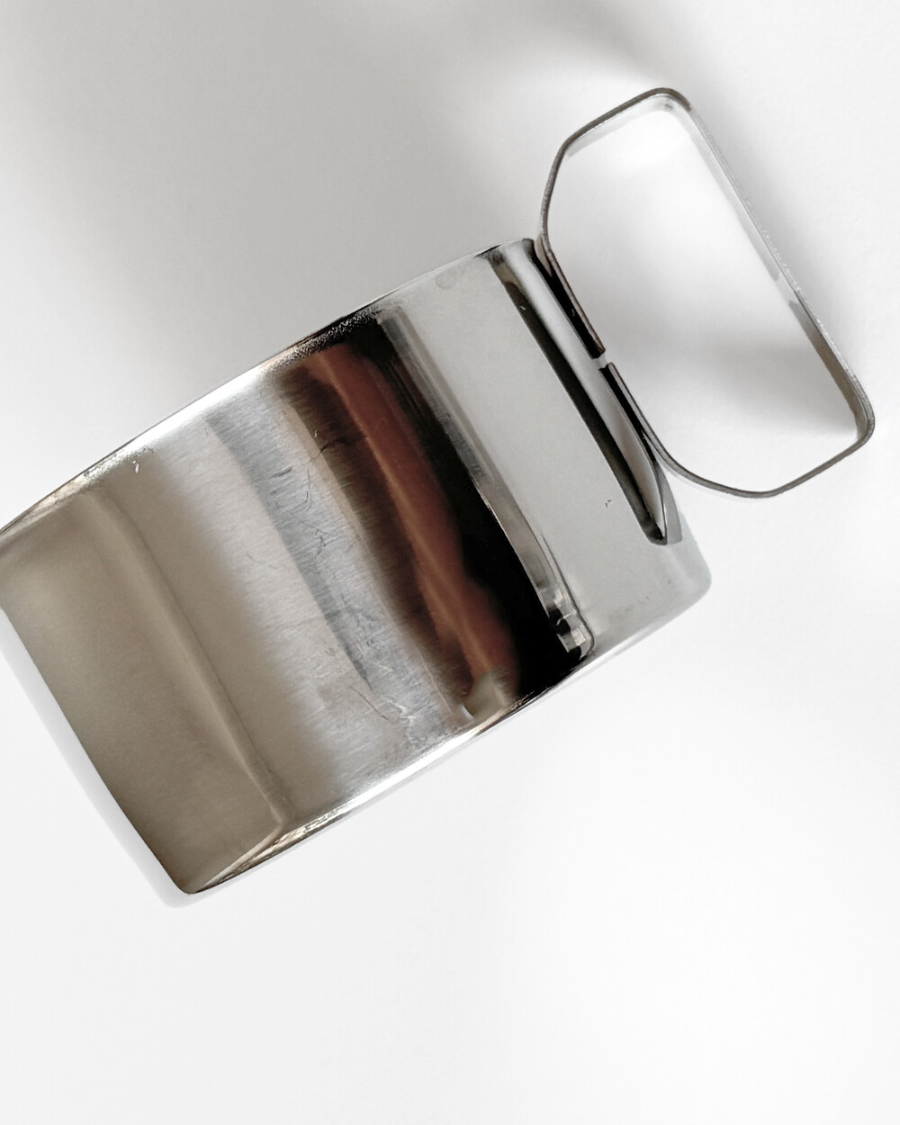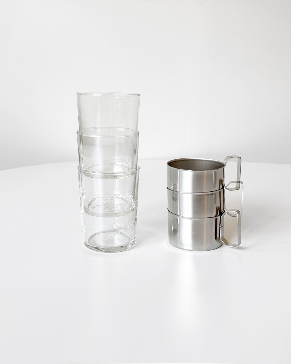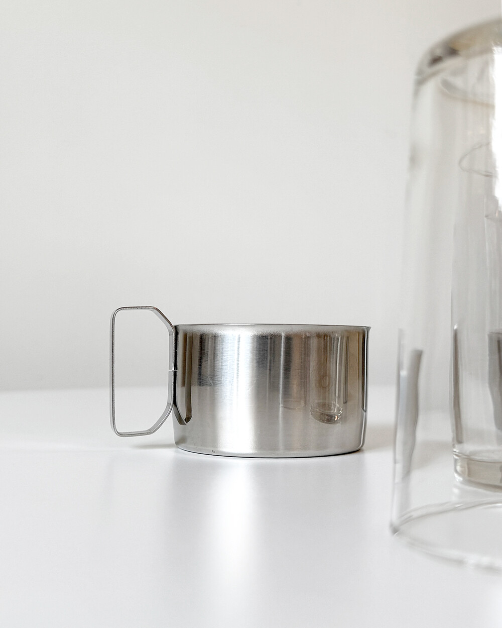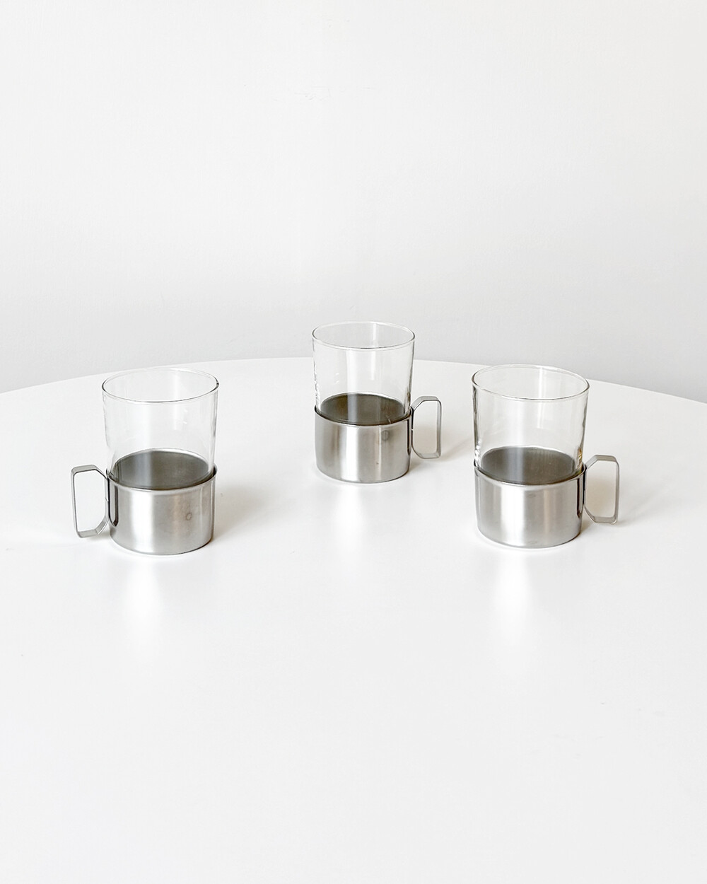 심플한 실루엣에 독특한 쉐입의 핸들이 더해진 70–80년대 Duralex의 빈티지 컵입니다. 직선적인 유리컵과 스테인리스 홀더가 조화를 이루는 모던한 디자인으로, 따뜻한 음료를 담을 수 있도록 내열유리가 사용되었습니다.