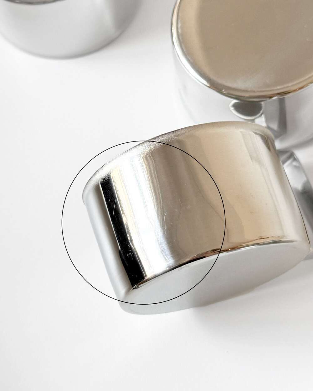 스테인리스 스틸 소재의 메탈 홀더는 전체적으로 좋은 컨디션을 유지하고 있습니다. 오랜 시간 보관되며 생긴 가는 선 형태의 스크래치와 소재 특성상 드러나는 옅은 얼룩 등 자연스러운 세월감이 있습니다.