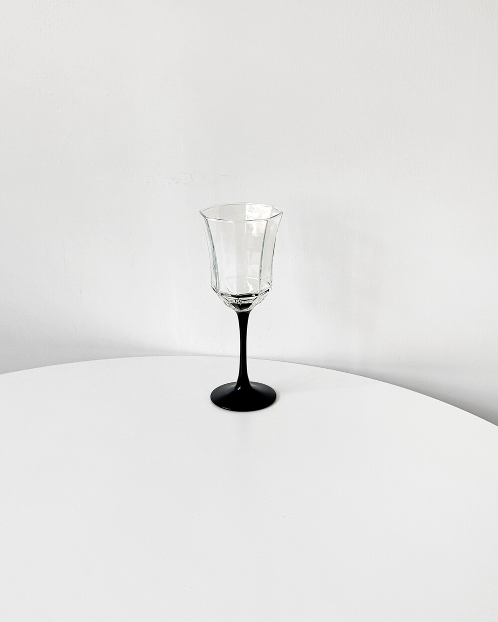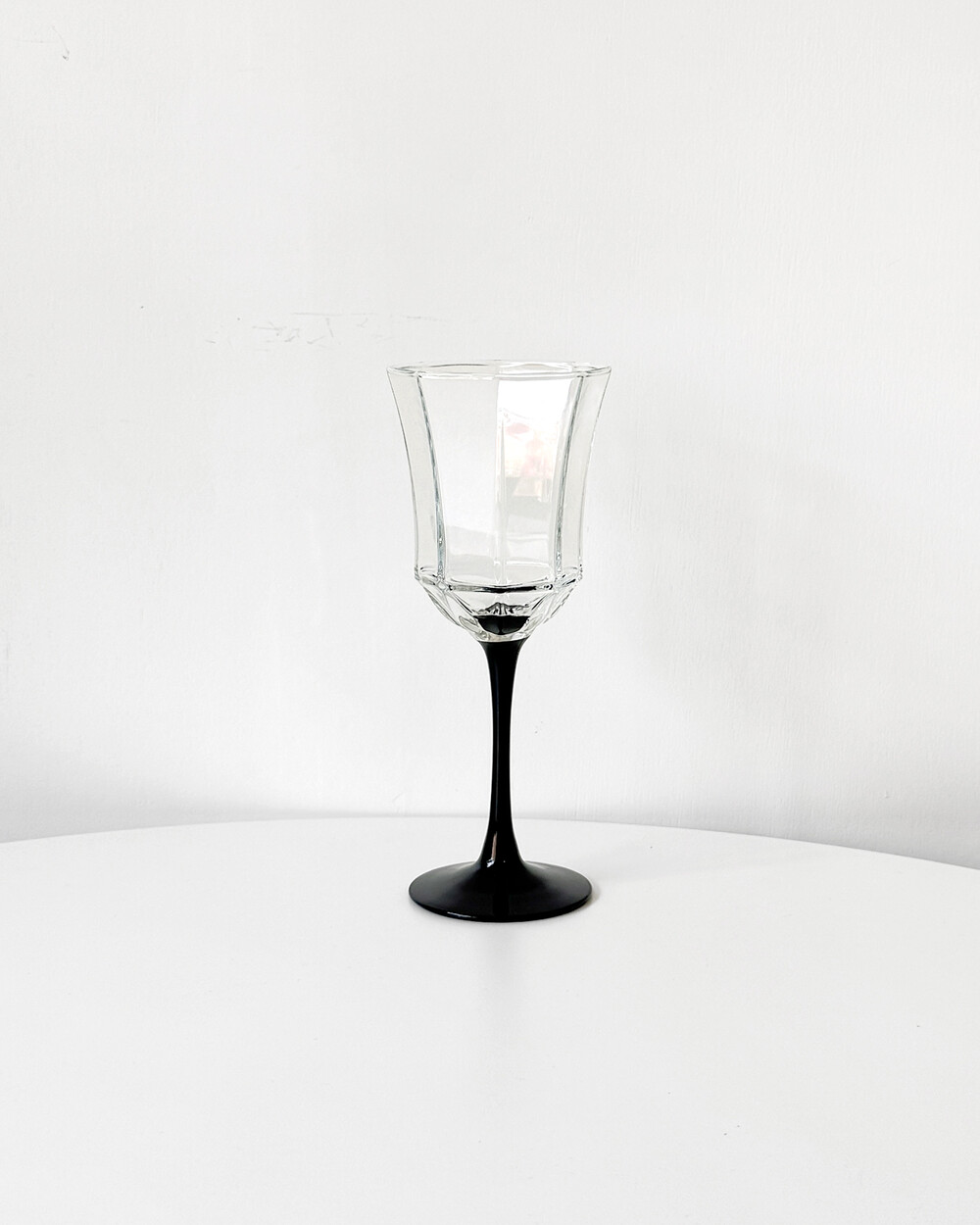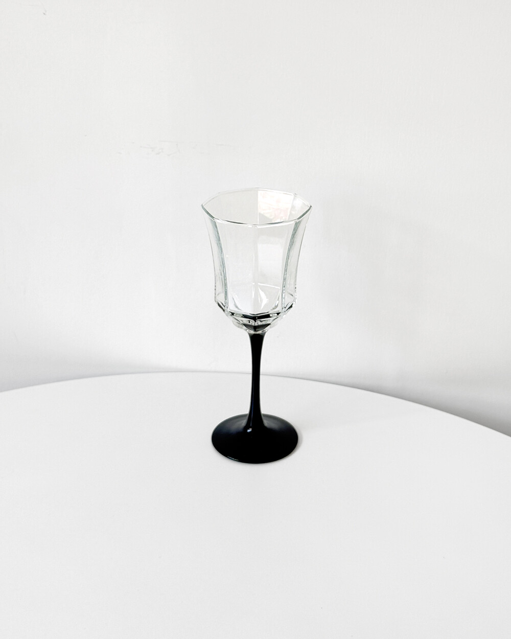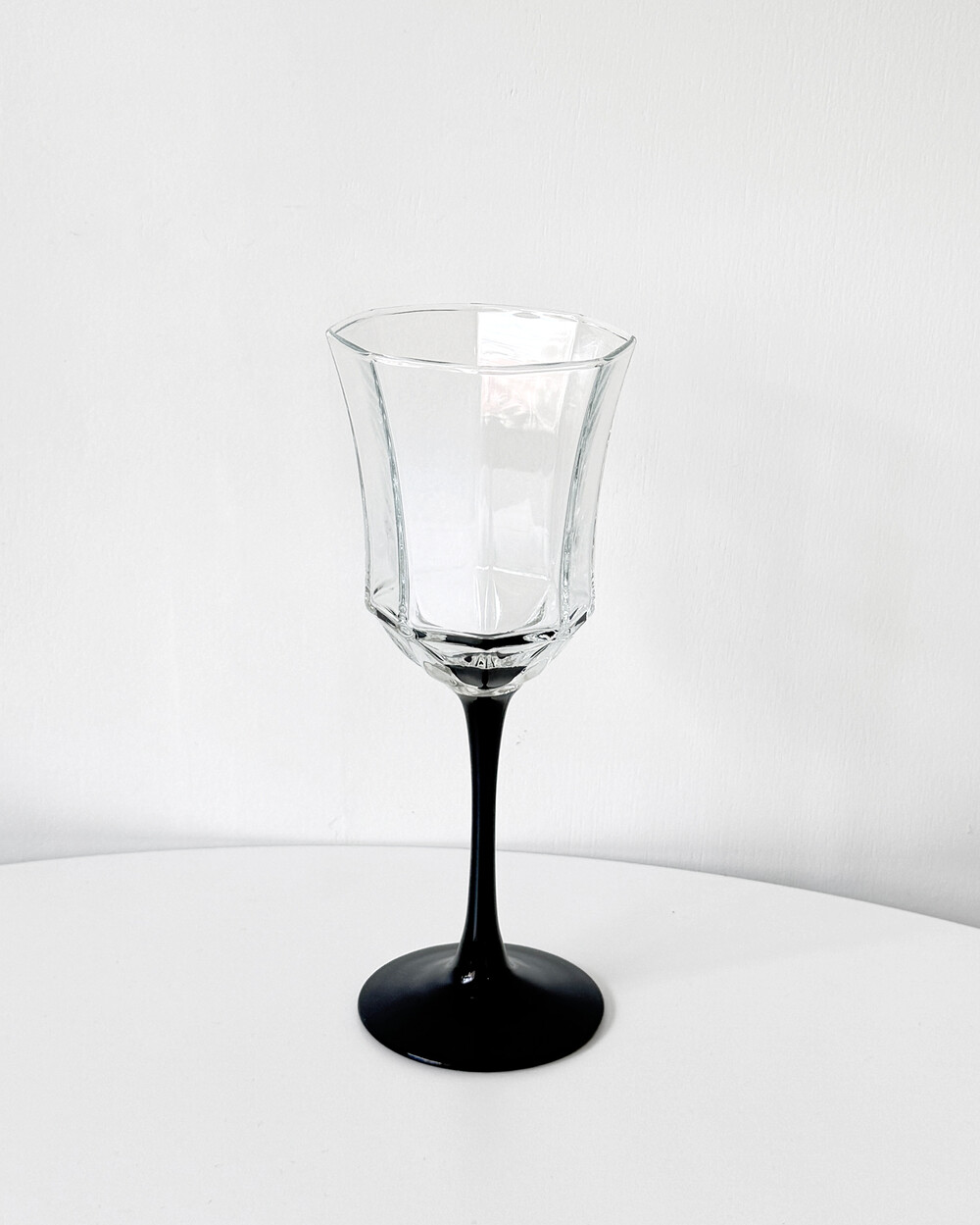 팔각 실루엣 글라스에 세련된 블랙 스템으로 이루어진 클래식한 무드의 프렌치 와인 글라스입니다.