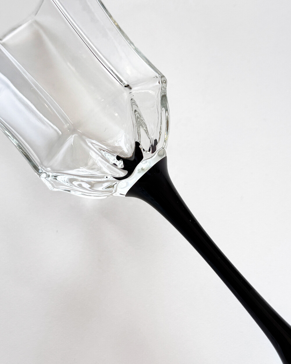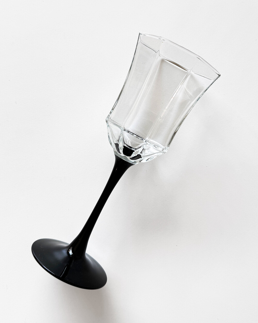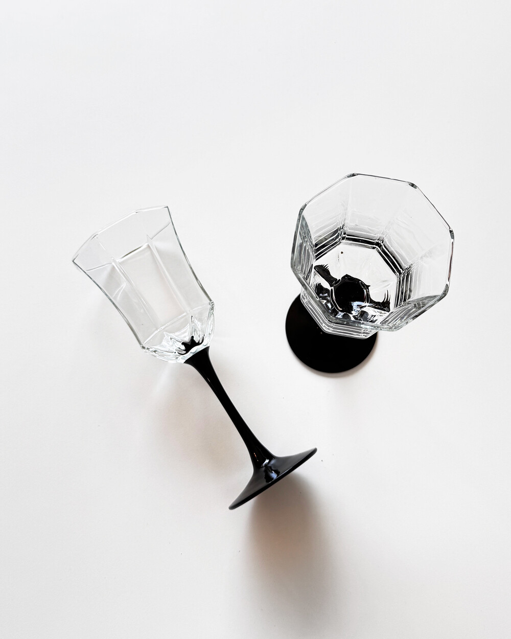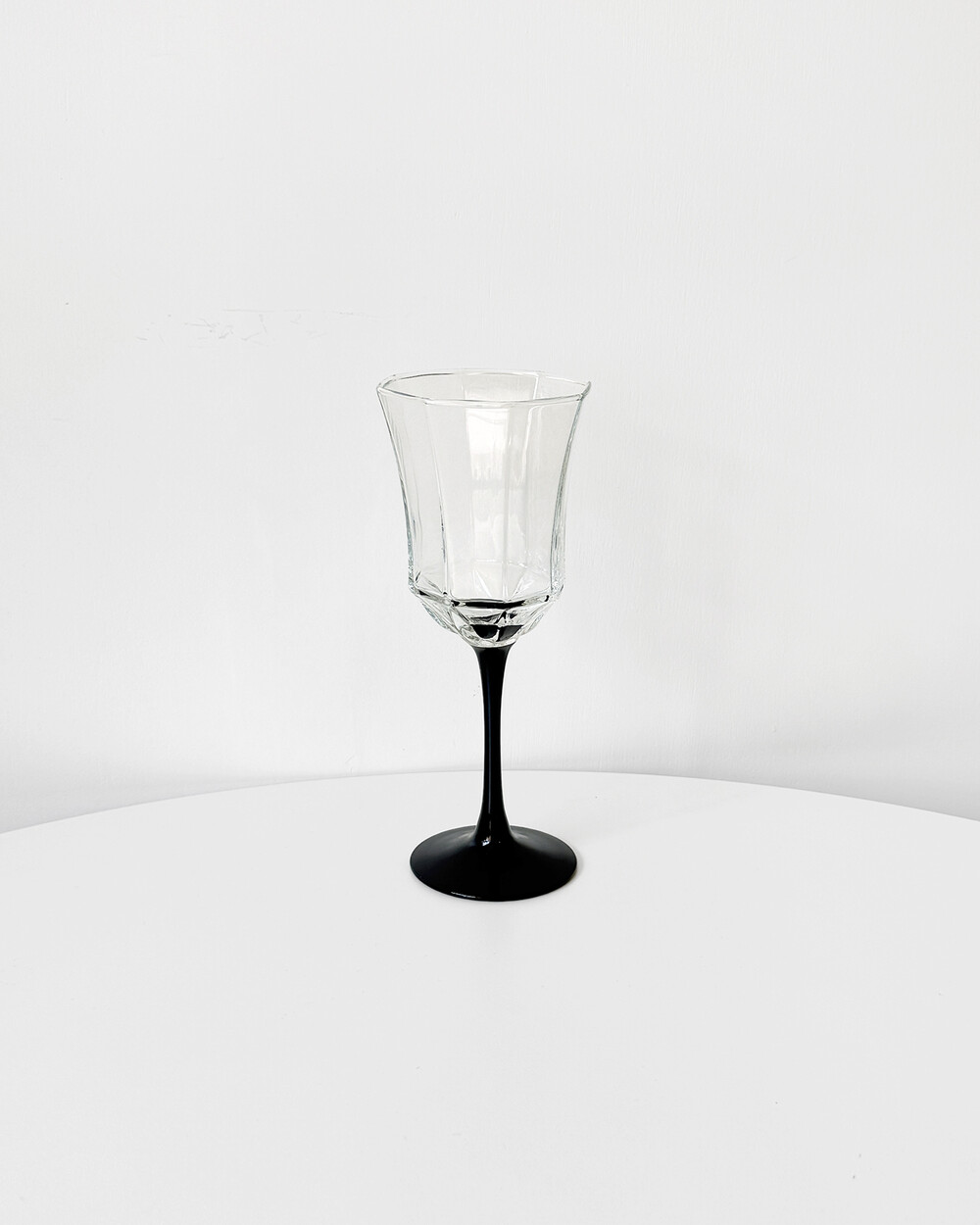팔각 실루엣 글라스에 세련된 블랙 스템으로 이루어진 클래식한 무드의 프렌치 와인 글라스입니다.