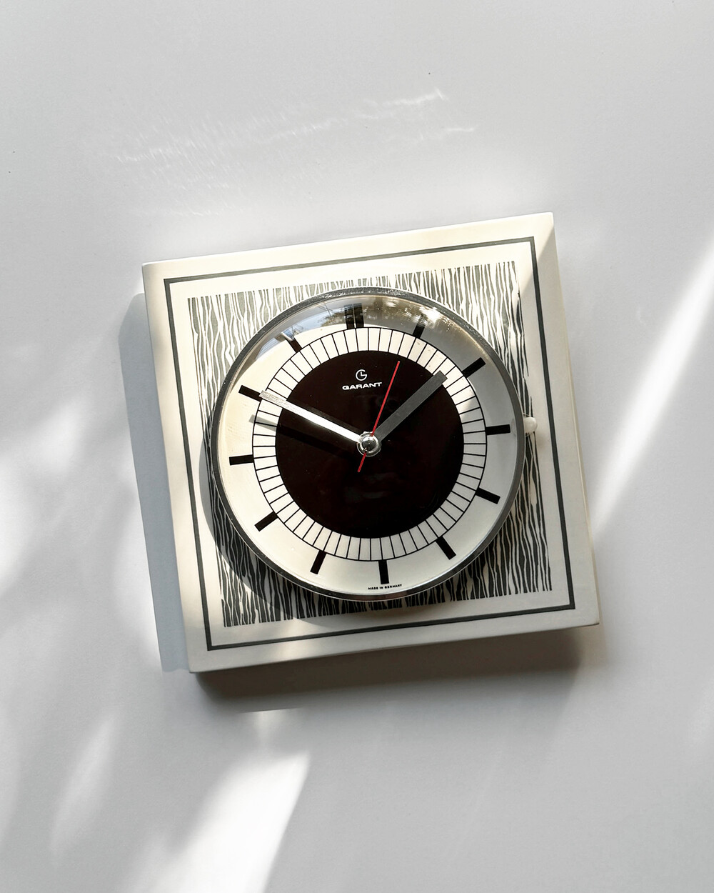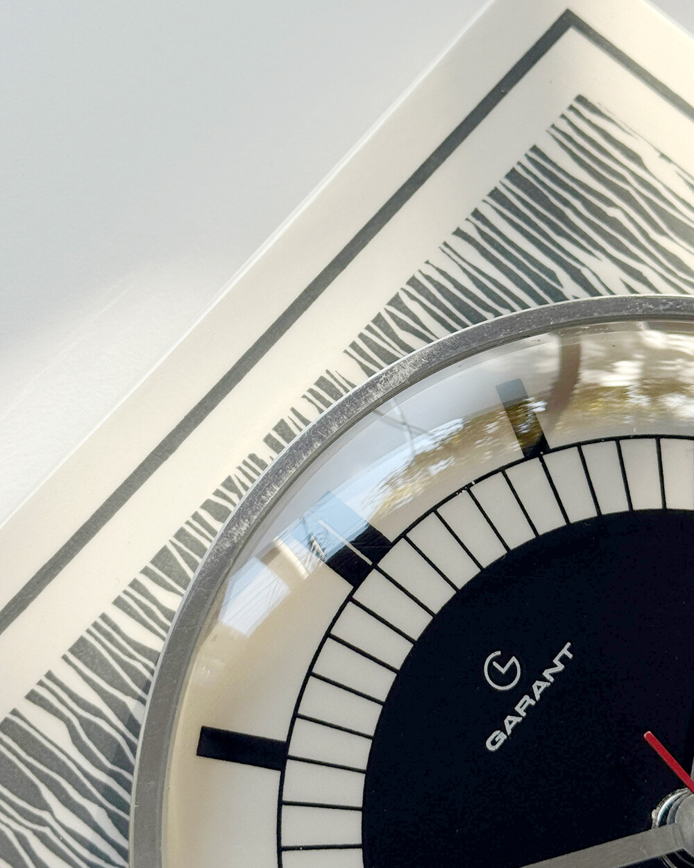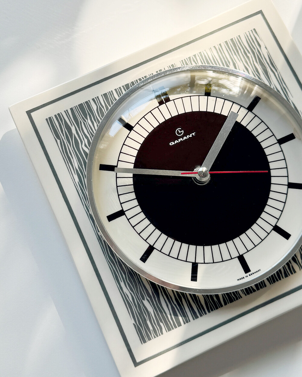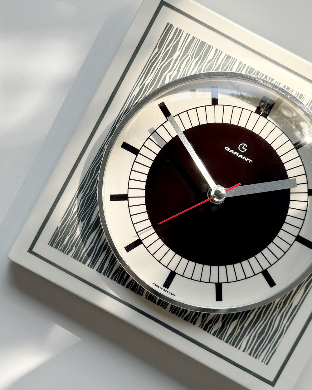 모노톤과 그래픽 패턴이 돋보이는 희소한 디자인의 1970년대 독일 GARANT 세라믹 벽시계입니다. 미니멀한 실루엣과 블랙·화이트 컬러 대비가 어우러져 공간에 세련된 감도를 더해줄 오브제로 추천 드립니다.