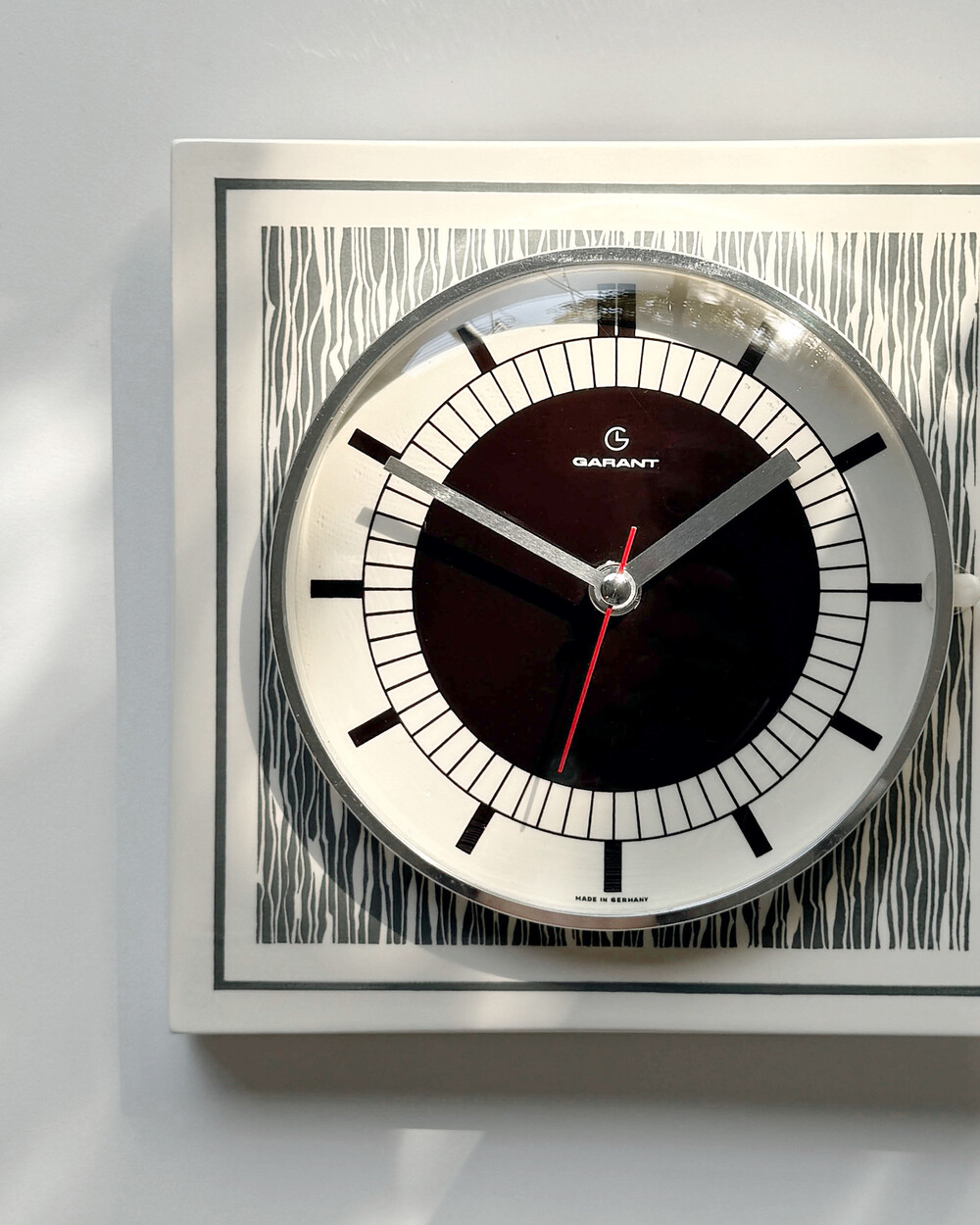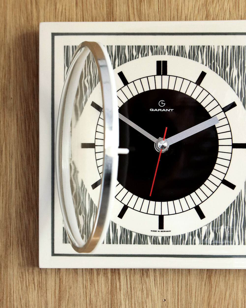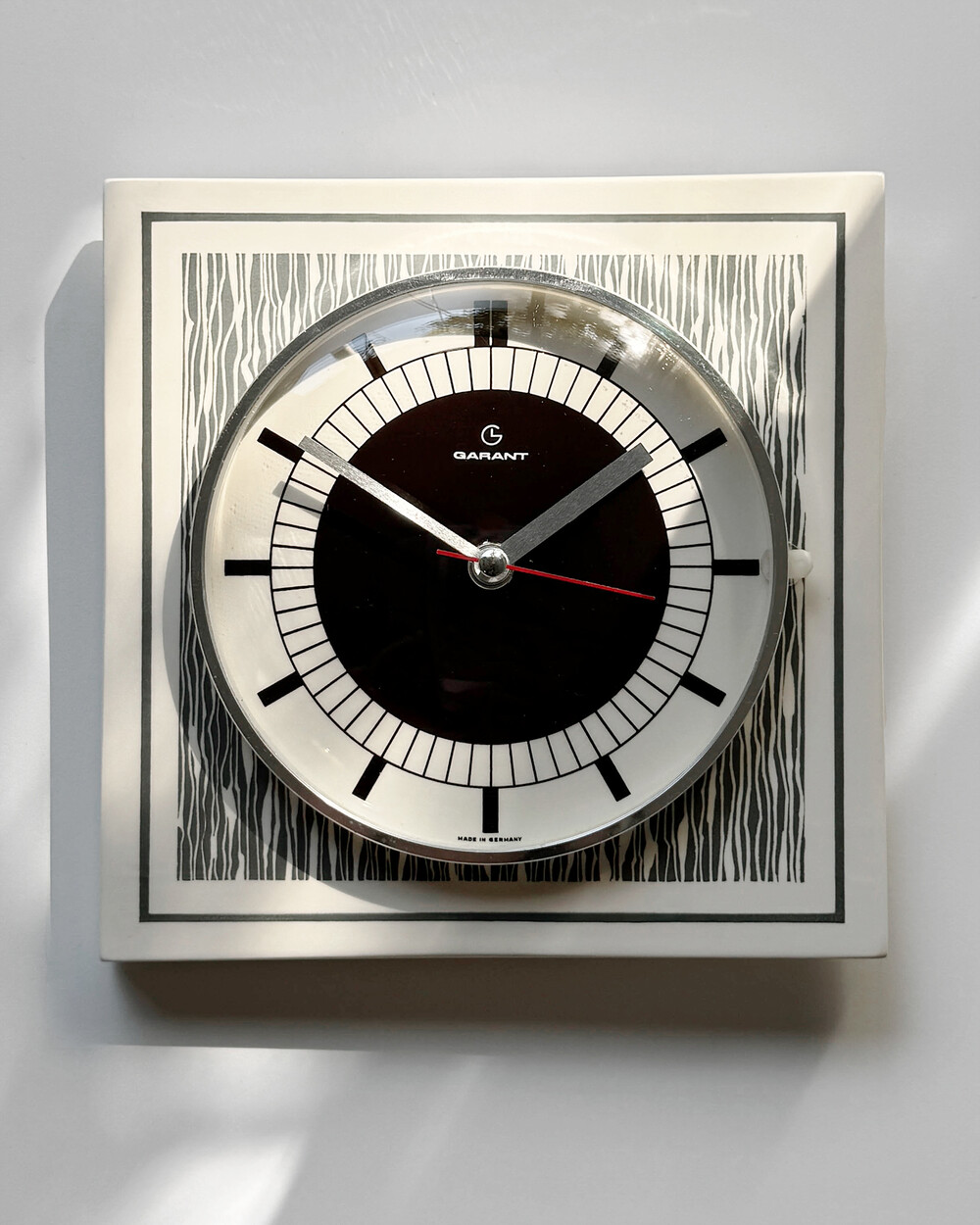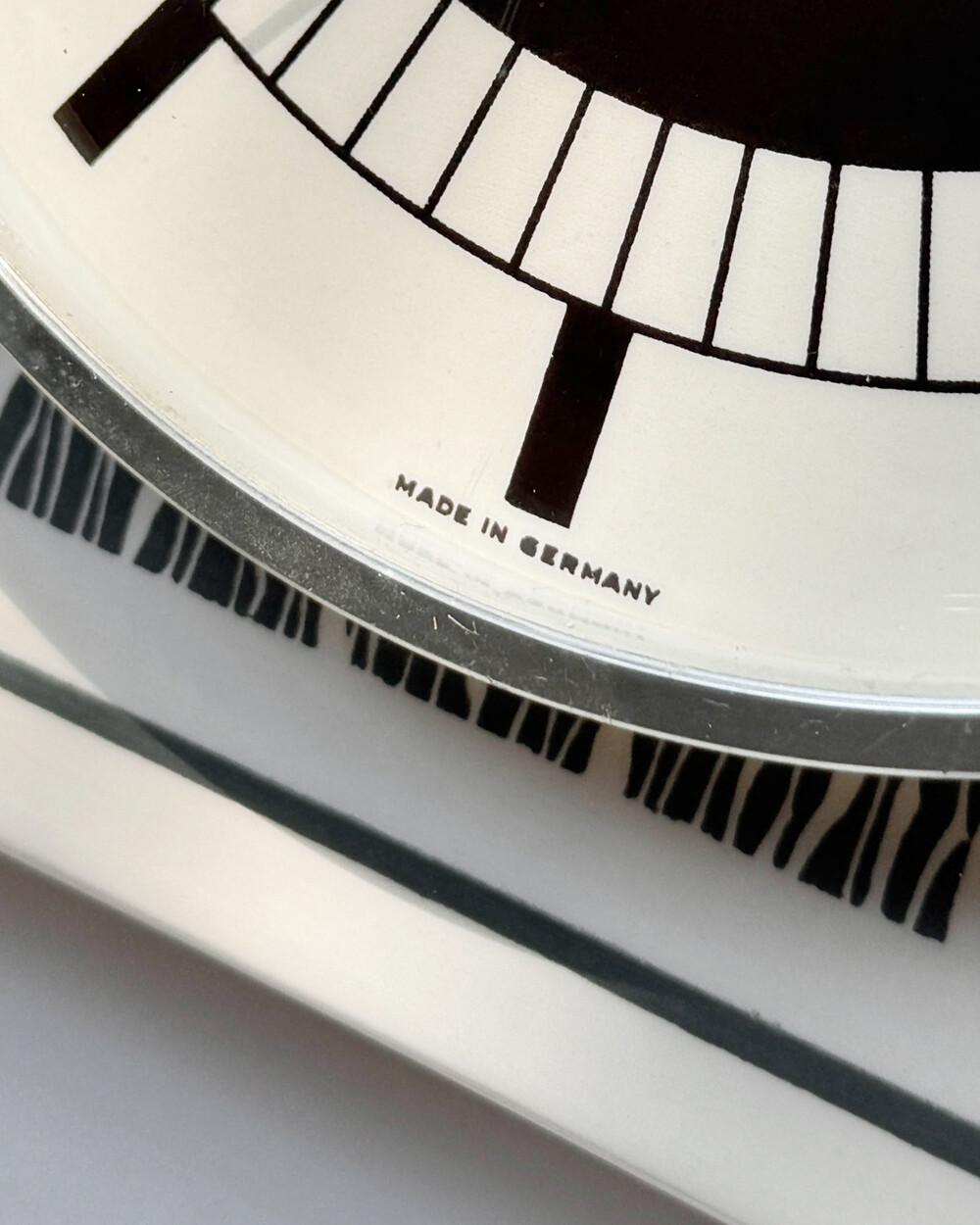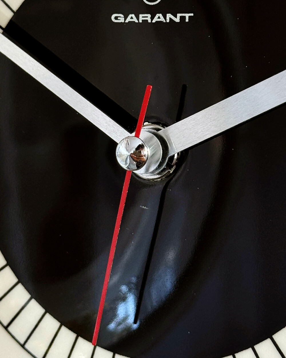 모노톤과 그래픽 패턴이 돋보이는 희소한 디자인의 1970년대 독일 GARANT 세라믹 벽시계입니다. 미니멀한 실루엣과 블랙·화이트 컬러 대비가 어우러져 공간에 세련된 감도를 더해줄 오브제로 추천 드립니다.