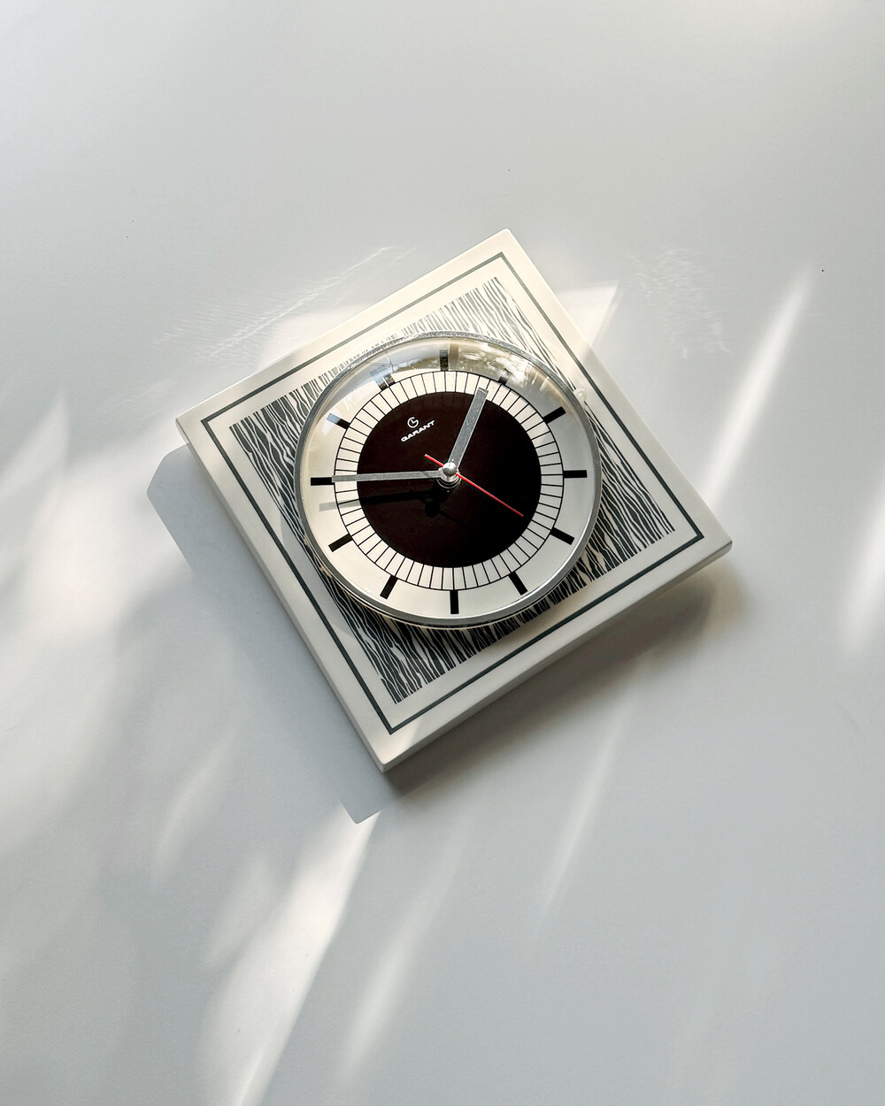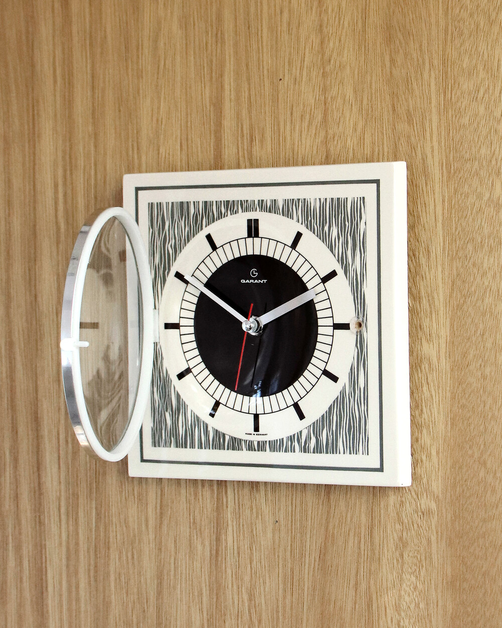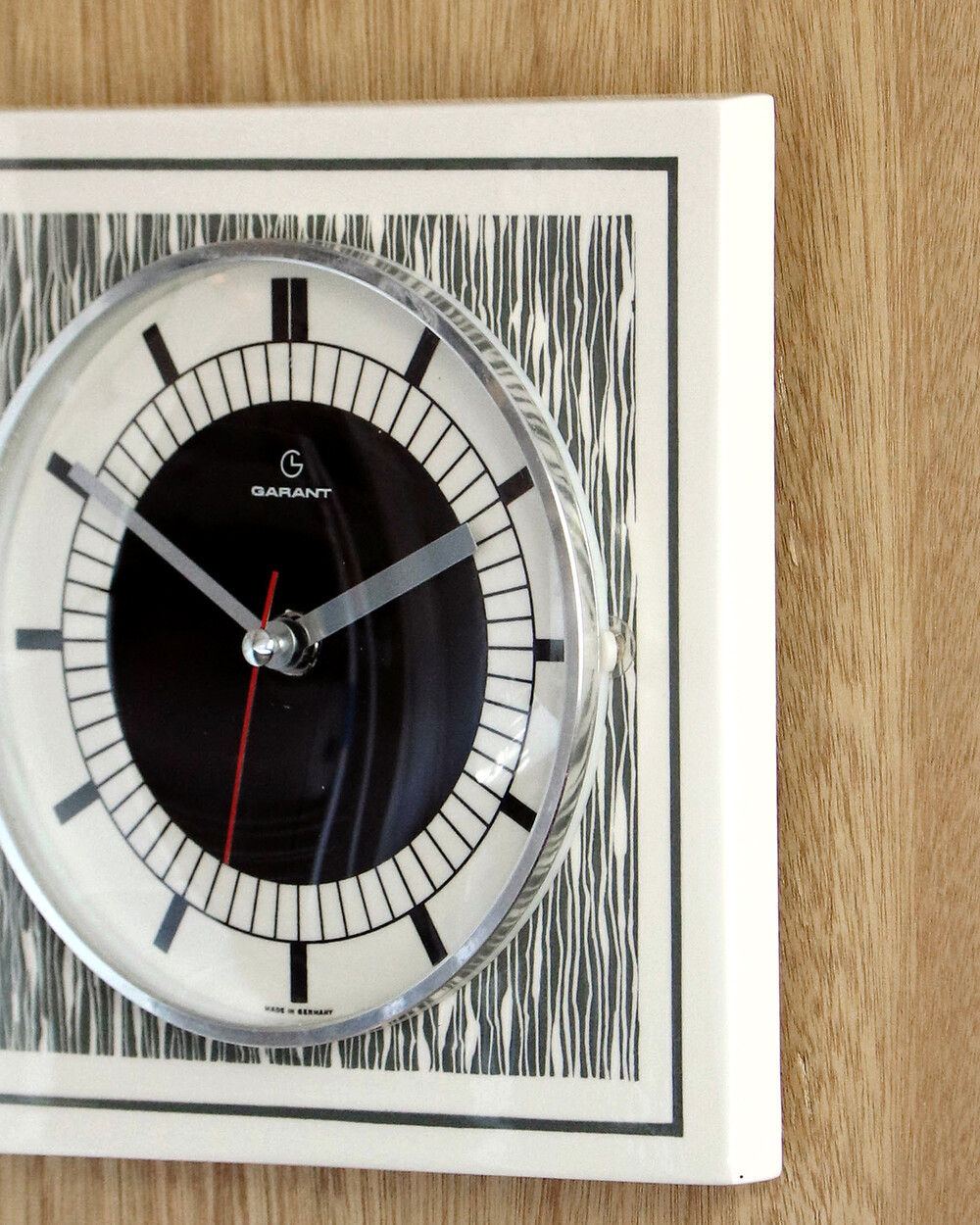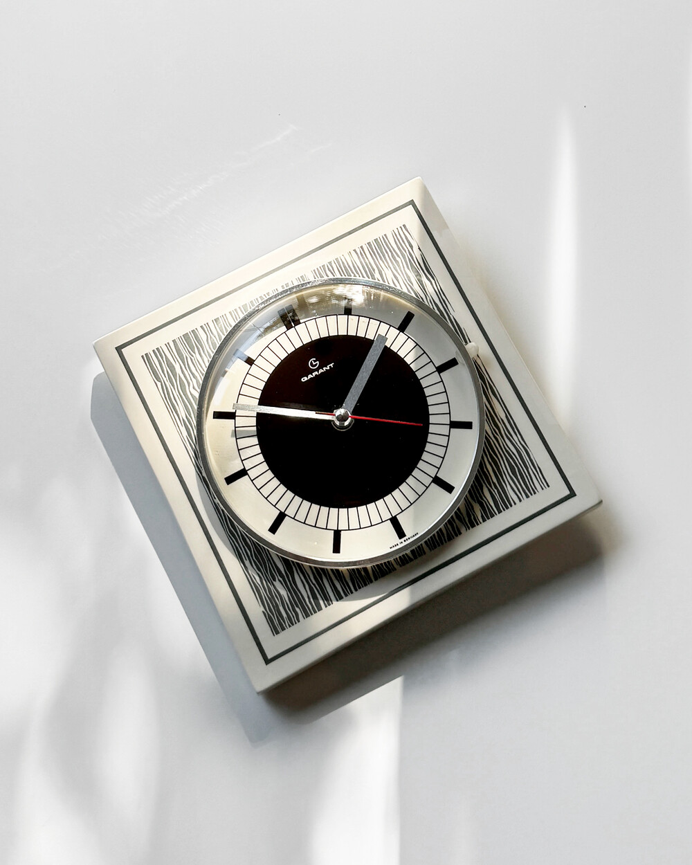 모노톤과 그래픽 패턴이 돋보이는 희소한 디자인의 1970년대 독일 GARANT 세라믹 벽시계입니다. 미니멀한 실루엣과 블랙·화이트 컬러 대비가 어우러져 공간에 세련된 감도를 더해줄 오브제로 추천 드립니다.
