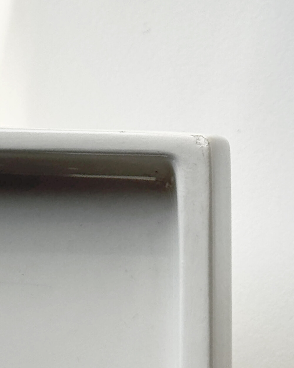 유리 도어에는 가까이에서 보았을 때 점 형태의 작은 찍힘과 가는 선 스크래치가 있습니다. 벽면에 설치하면 크게 도드라지지 않는 정도의 컨디션입니다.
