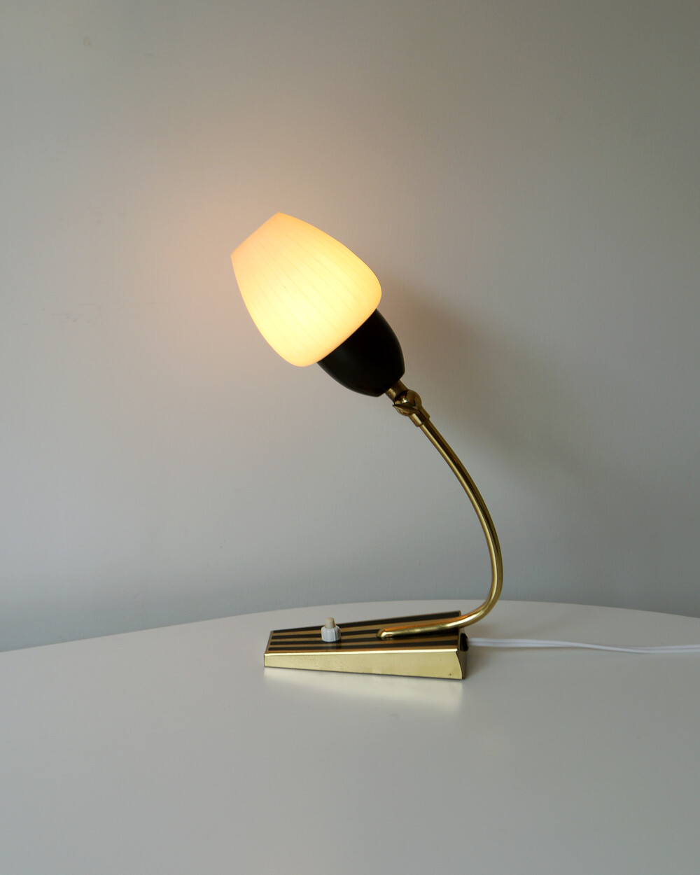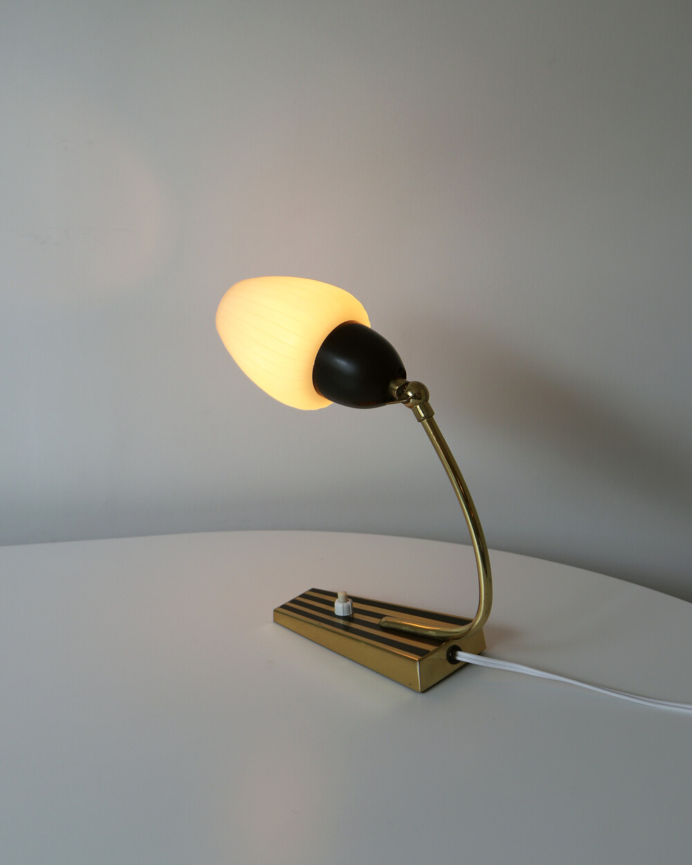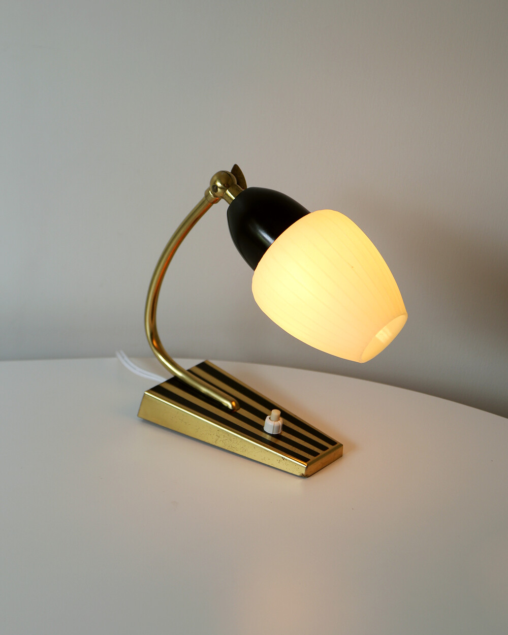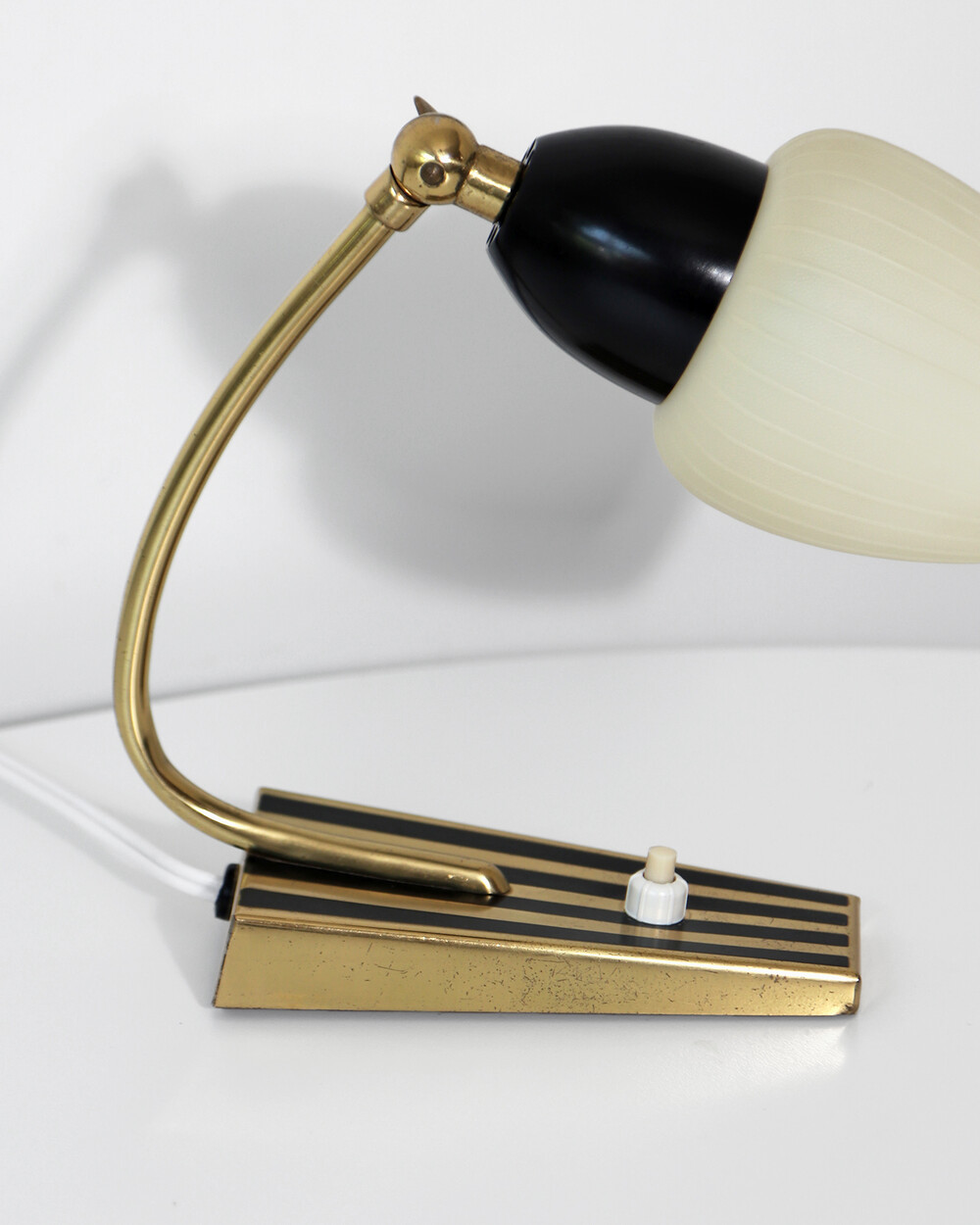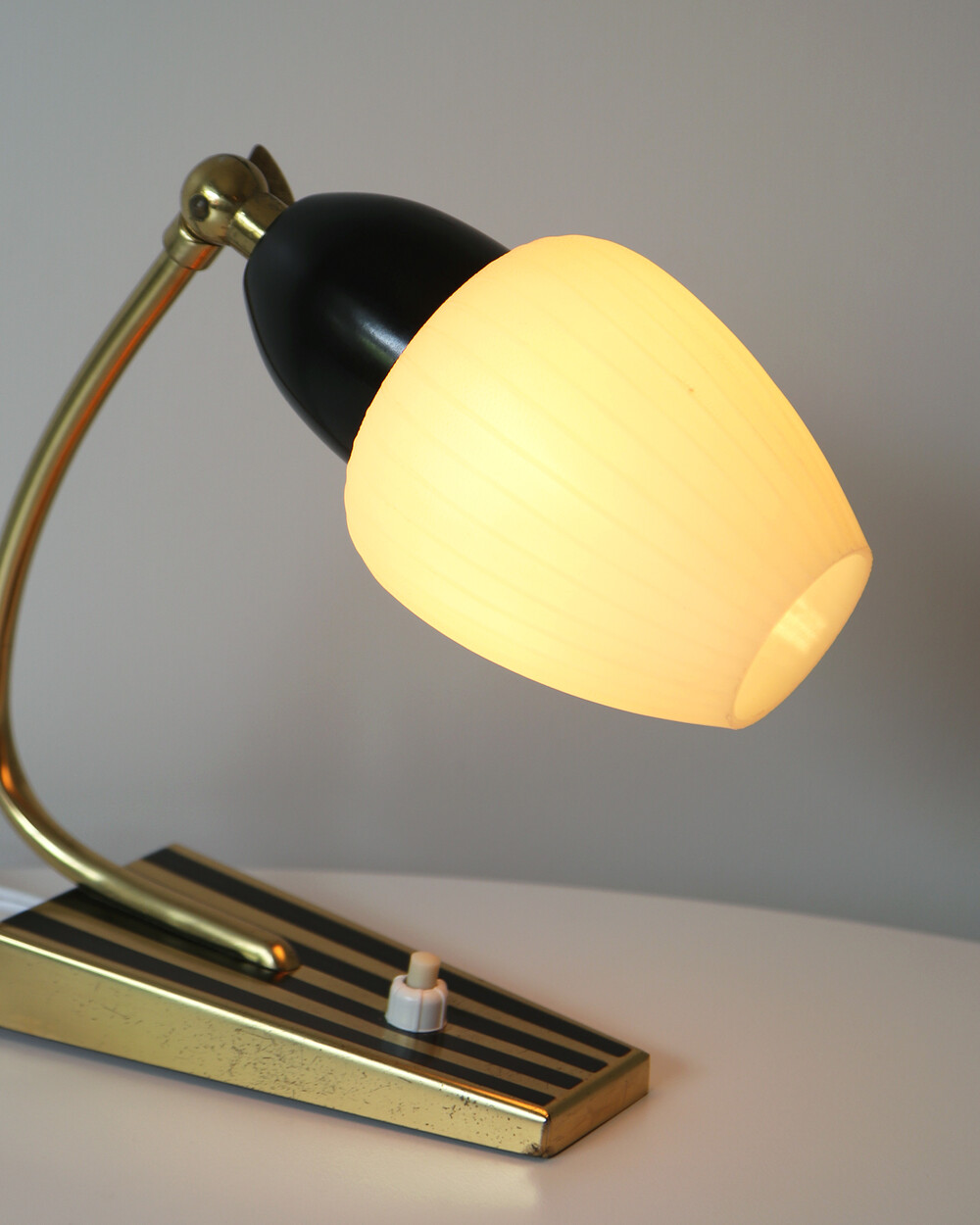 골드 메탈과 블랙 스트라이프 장식이 어우러진 클래식한 디자인의 1970년대 독일의 베드사이드 넥 램프입니다. 유연한 곡선의 메탈 넥에는 각도를 조절할 수 있는 셰이드가 연결되어 있으며, 플라스틱 소재로 만들어져 아늑하고 부드러운 빛을 공간에 확산합니다.