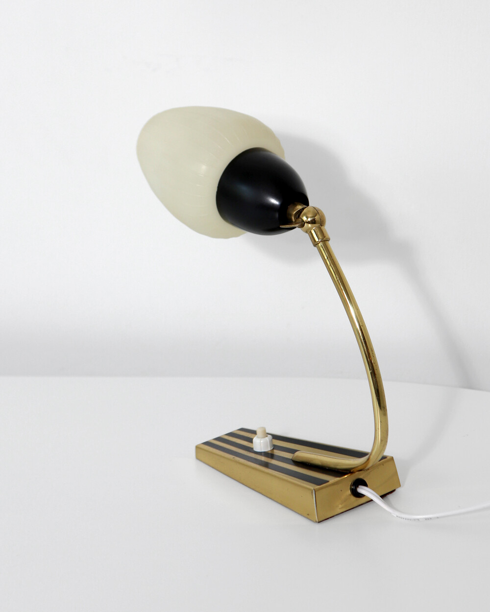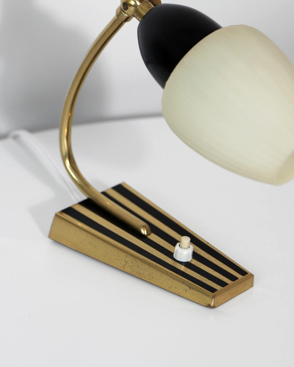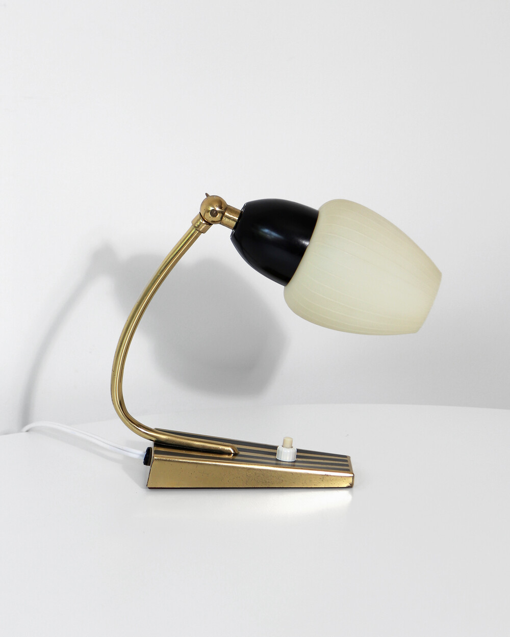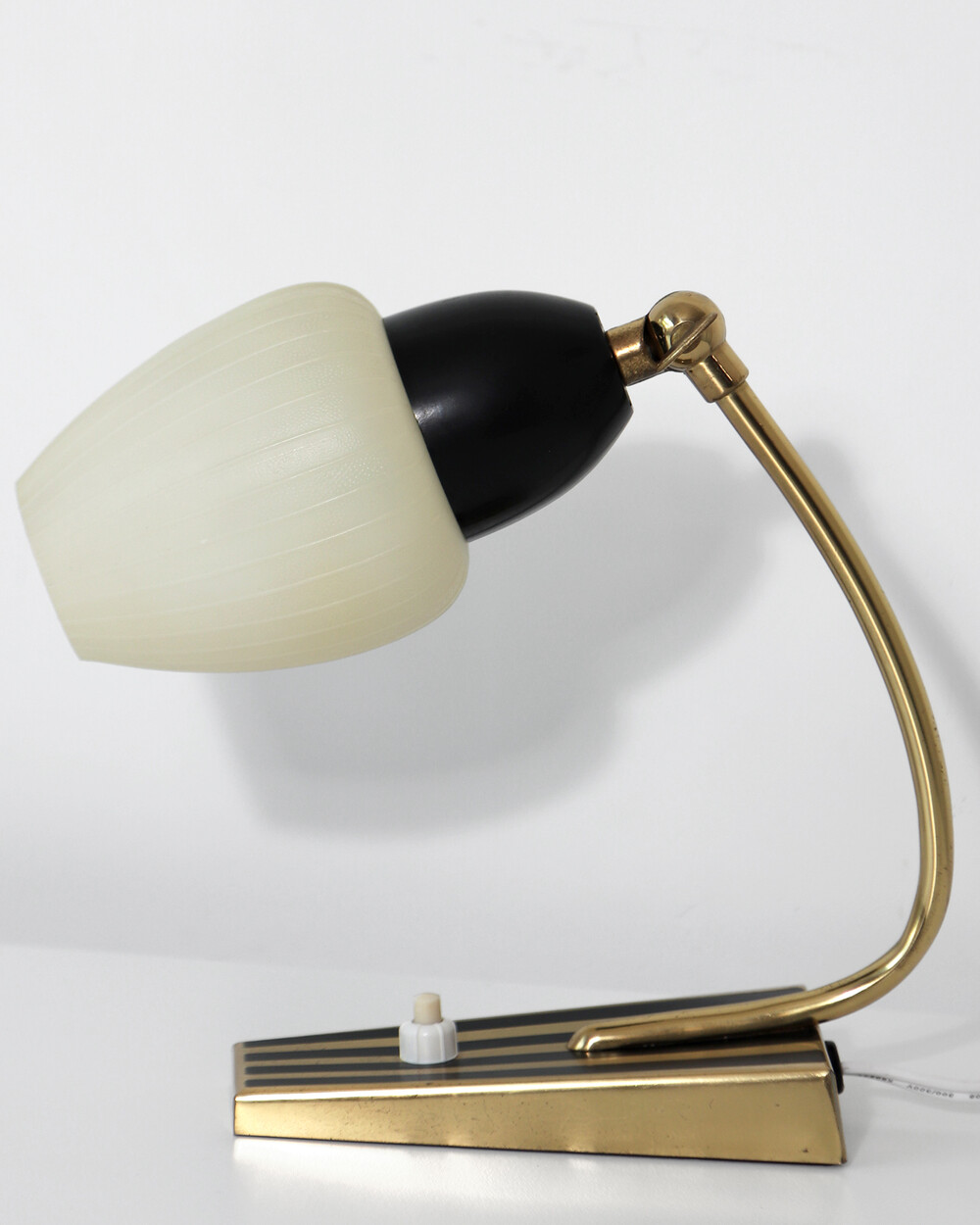 골드 메탈과 블랙 스트라이프 장식이 어우러진 클래식한 디자인의 1970년대 독일의 베드사이드 넥 램프입니다. 유연한 곡선의 메탈 넥에는 각도를 조절할 수 있는 셰이드가 연결되어 있으며, 플라스틱 소재로 만들어져 아늑하고 부드러운 빛을 공간에 확산합니다.