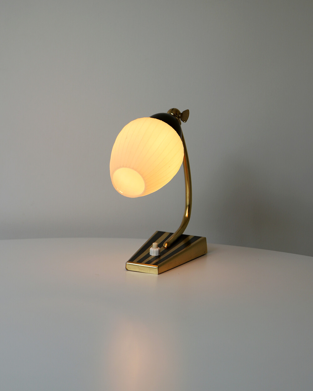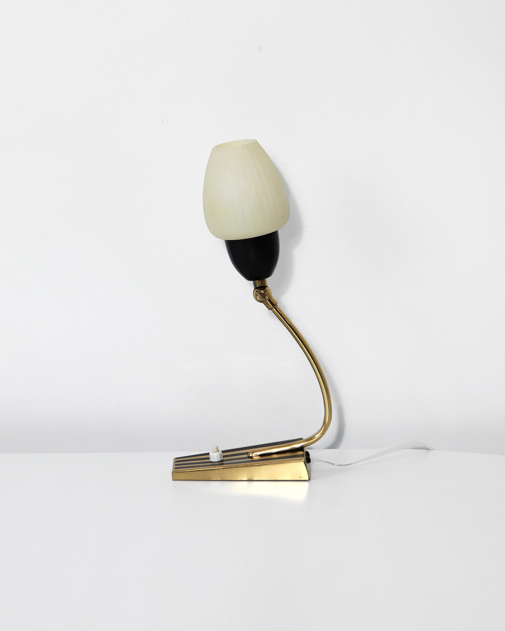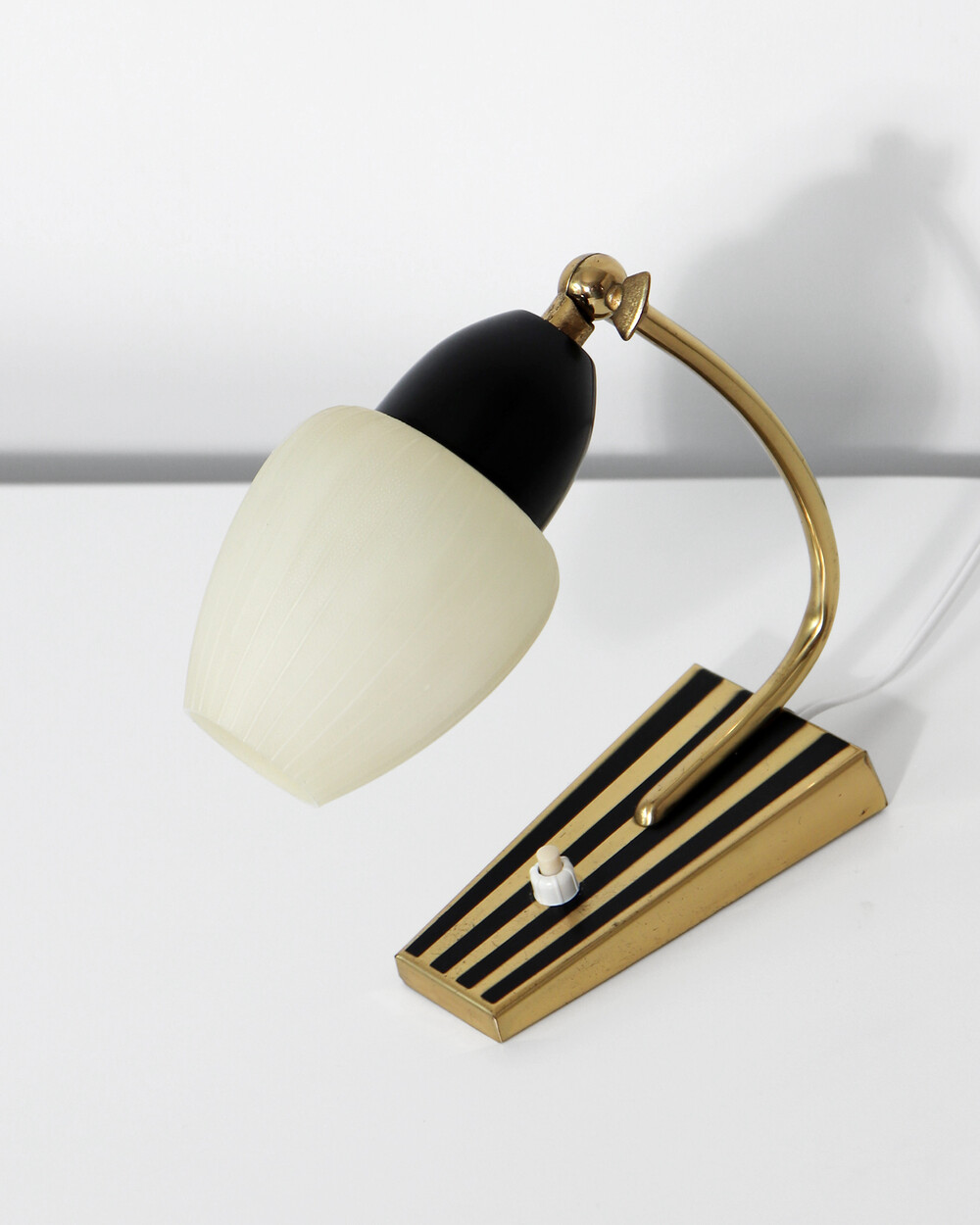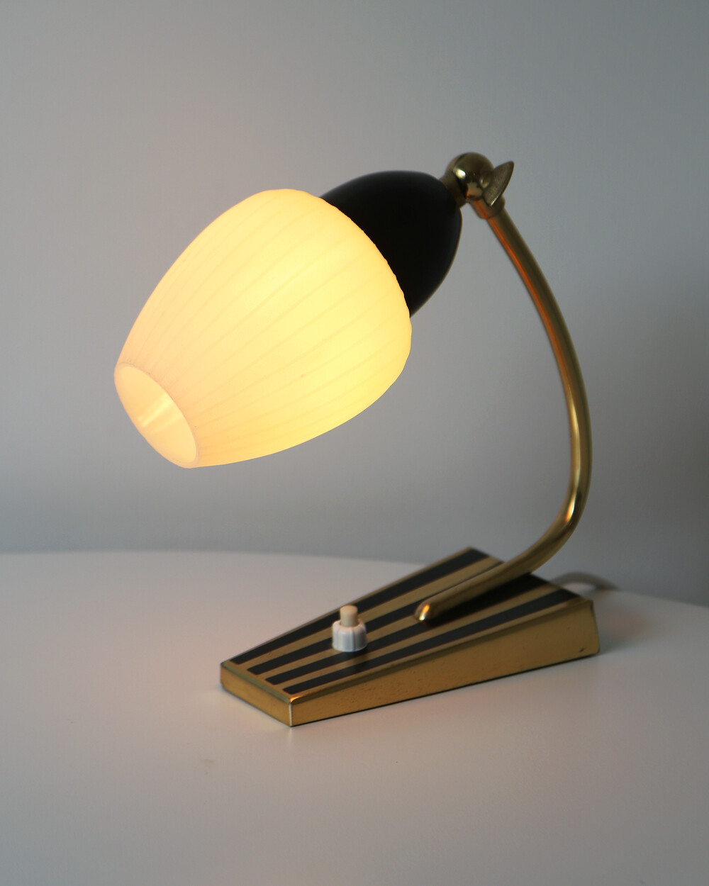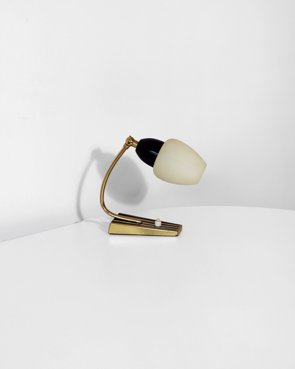 골드 메탈과 블랙 스트라이프 장식이 어우러진 클래식한 디자인의 1970년대 독일의 베드사이드 넥 램프입니다. 유연한 곡선의 메탈 넥에는 각도를 조절할 수 있는 셰이드가 연결되어 있으며, 플라스틱 소재로 만들어져 아늑하고 부드러운 빛을 공간에 확산합니다.
