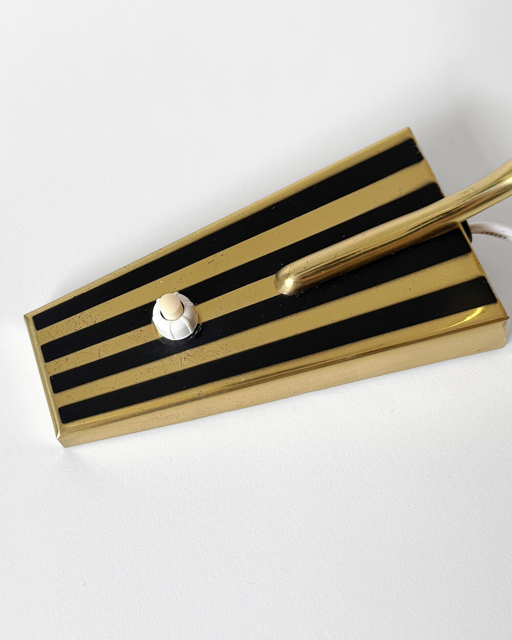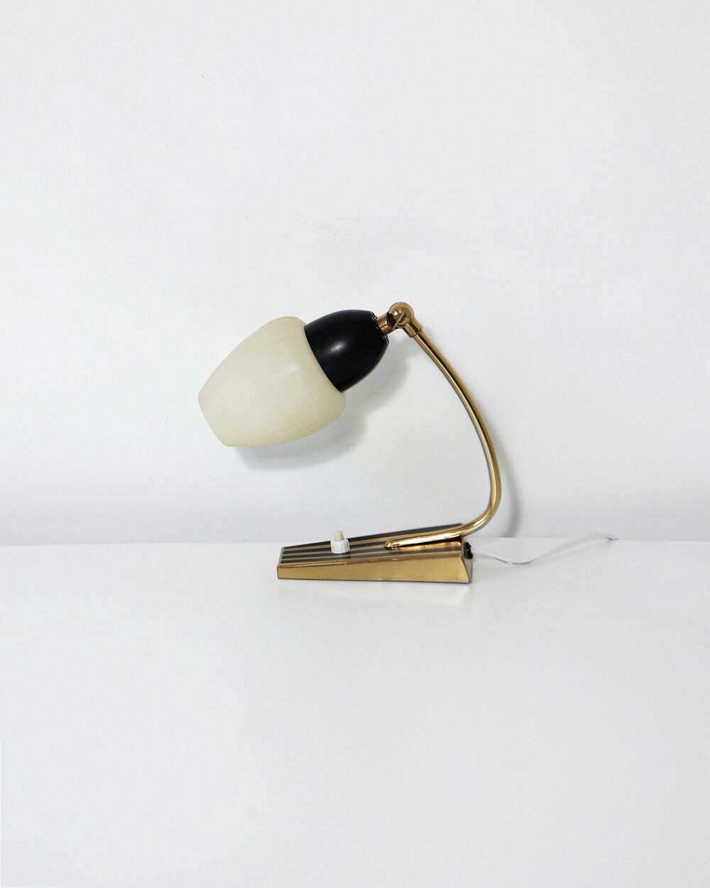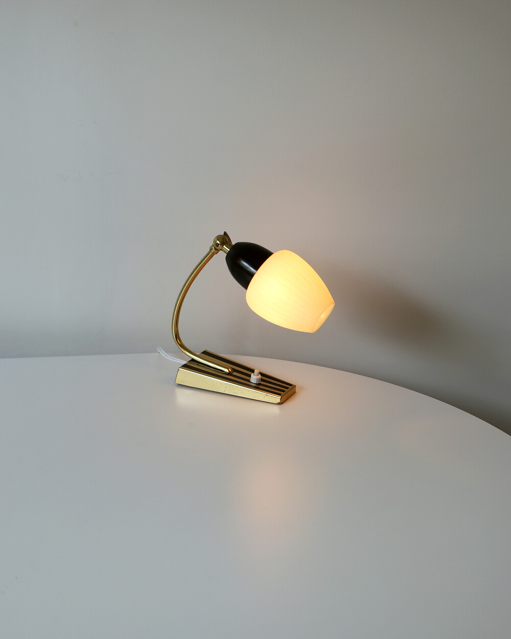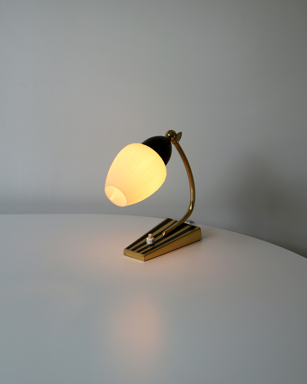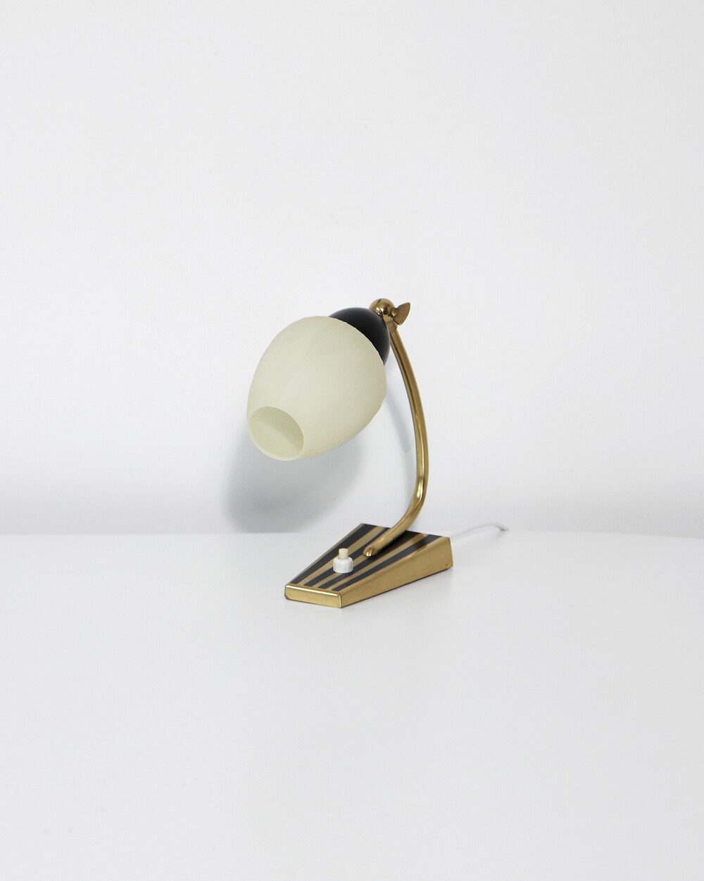 골드 메탈과 블랙 스트라이프 장식이 어우러진 클래식한 디자인의 1970년대 독일의 베드사이드 넥 램프입니다. 유연한 곡선의 메탈 넥에는 각도를 조절할 수 있는 셰이드가 연결되어 있으며, 플라스틱 소재로 만들어져 아늑하고 부드러운 빛을 공간에 확산합니다.