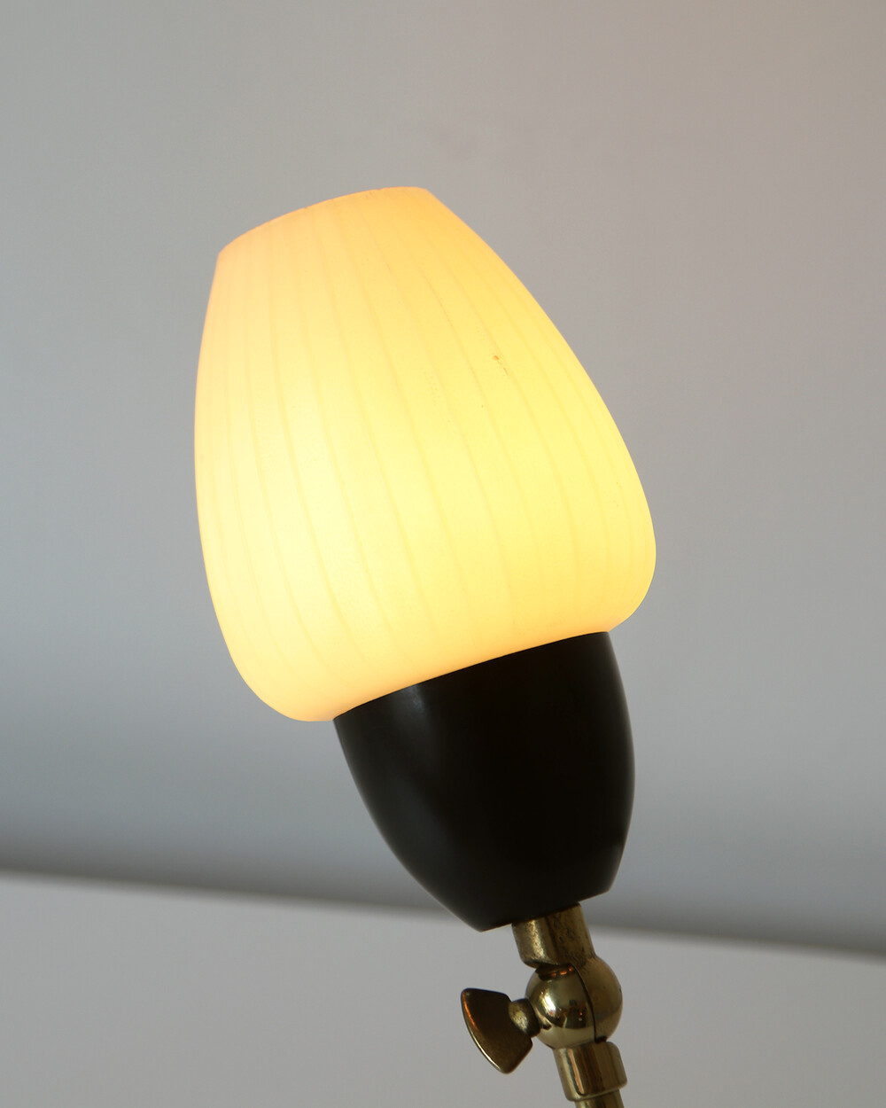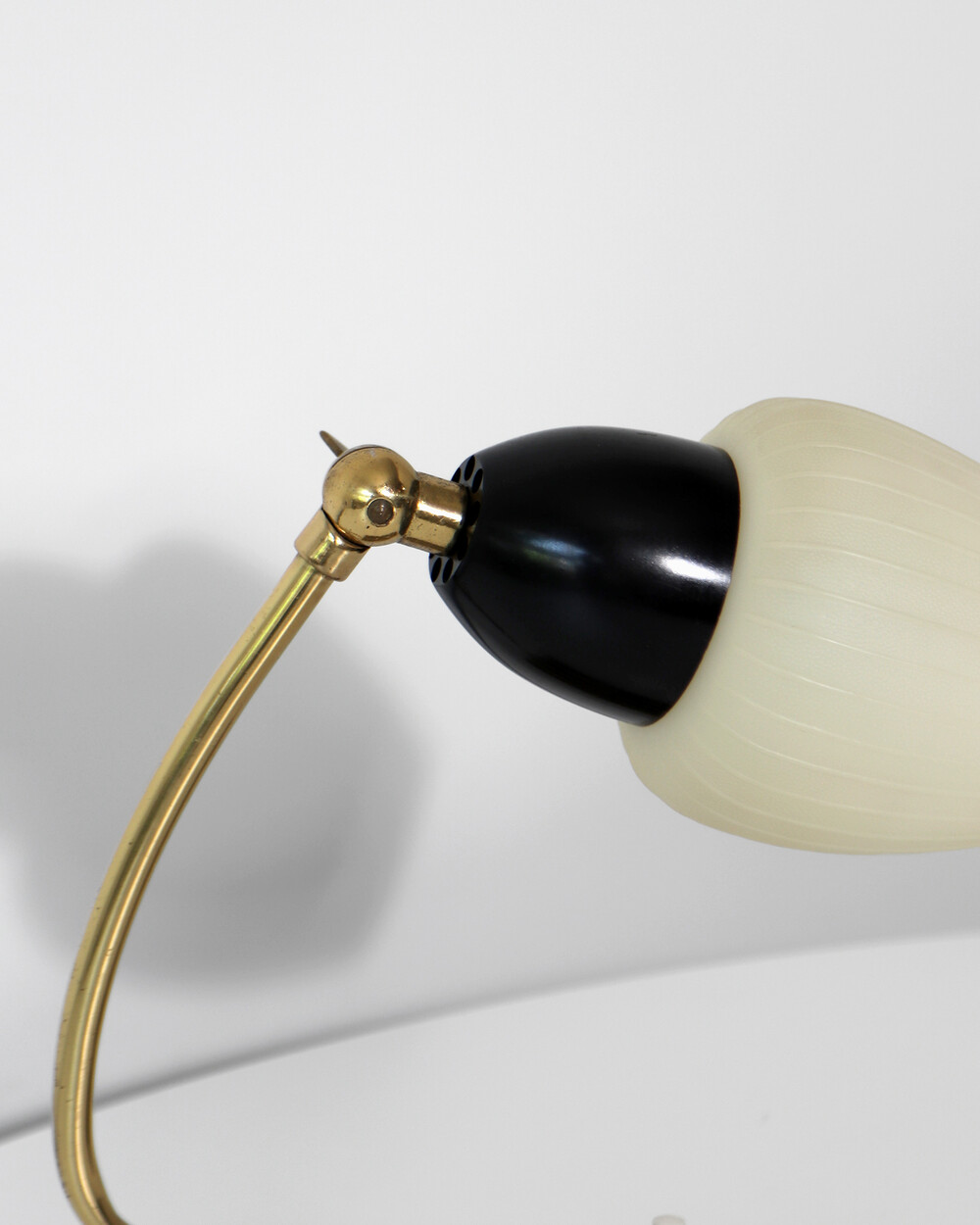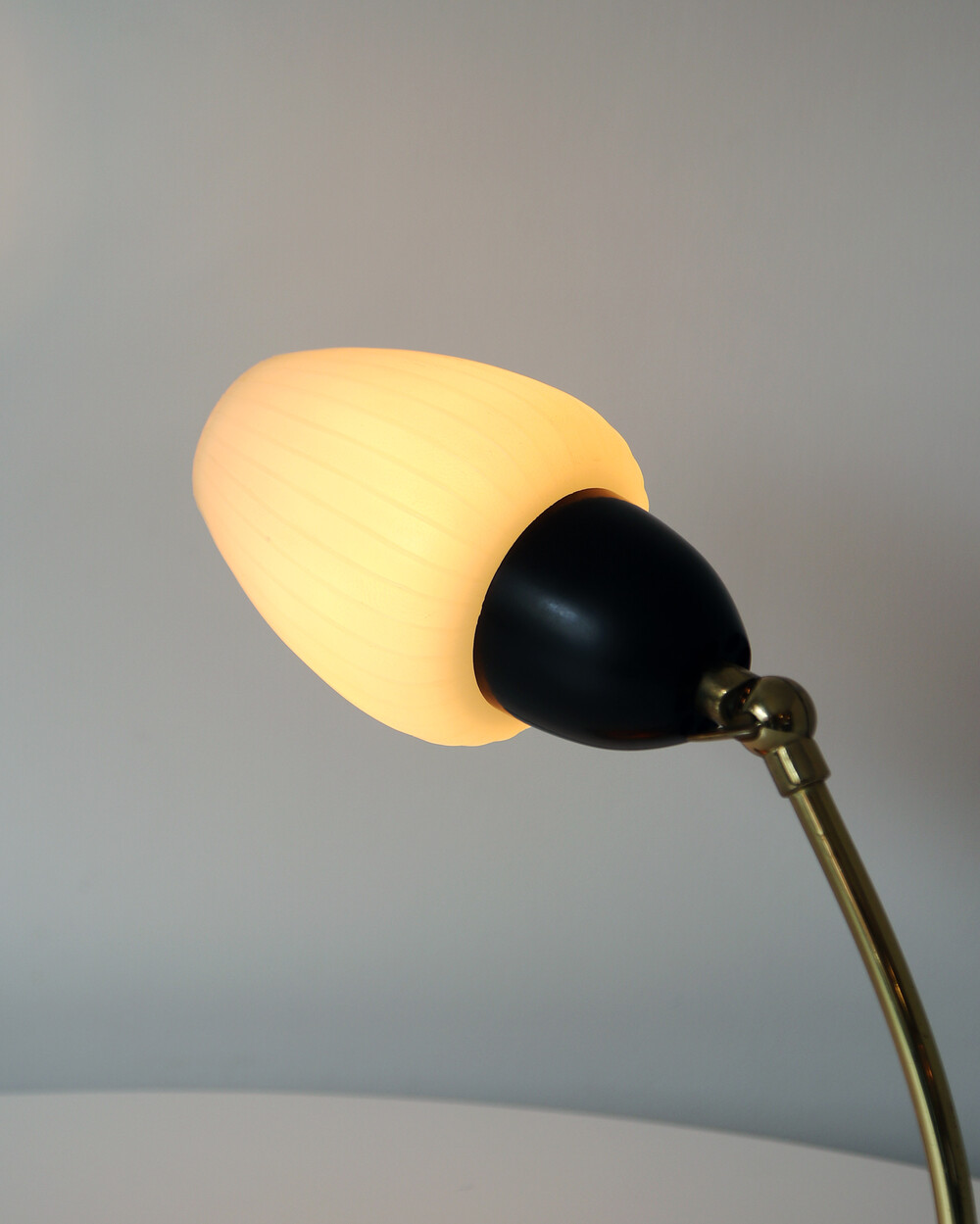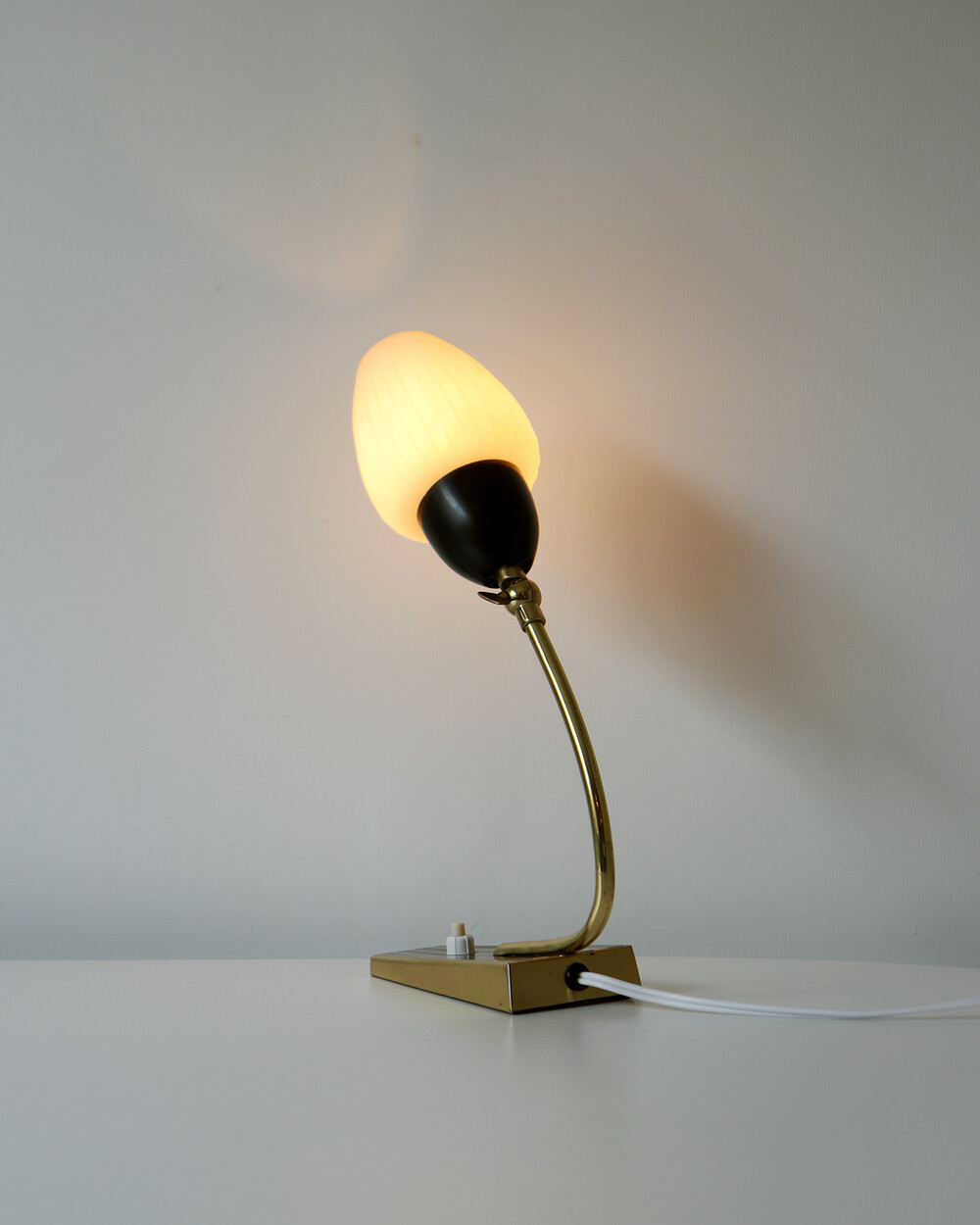 골드 메탈과 블랙 스트라이프 장식이 어우러진 클래식한 디자인의 1970년대 독일의 베드사이드 넥 램프입니다. 유연한 곡선의 메탈 넥에는 각도를 조절할 수 있는 셰이드가 연결되어 있으며, 플라스틱 소재로 만들어져 아늑하고 부드러운 빛을 공간에 확산합니다.