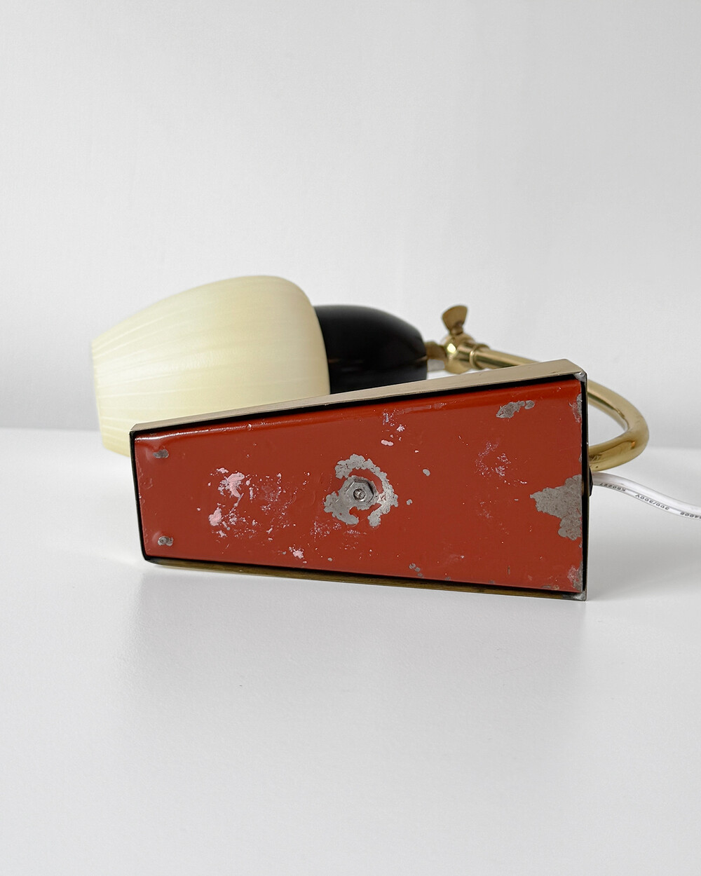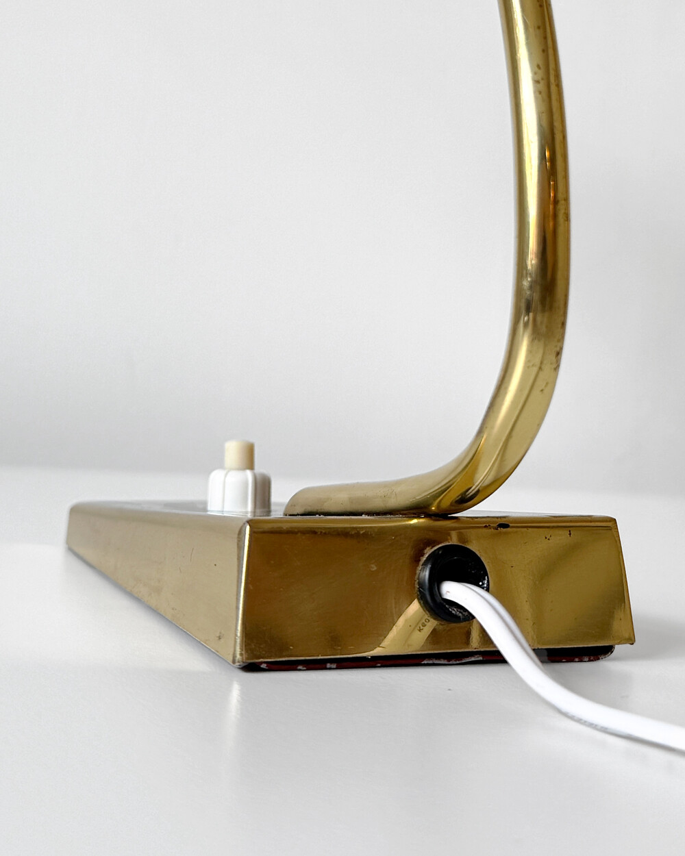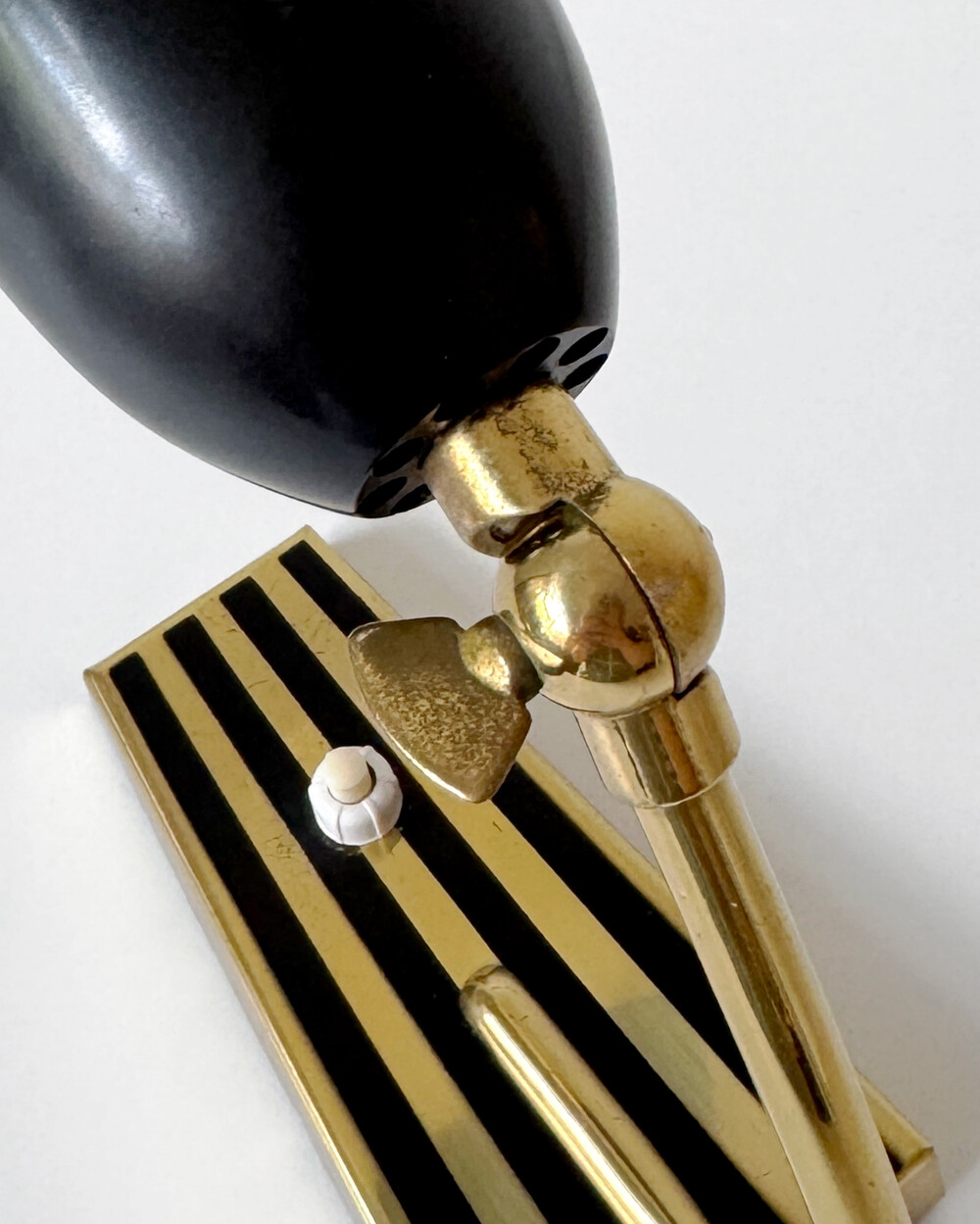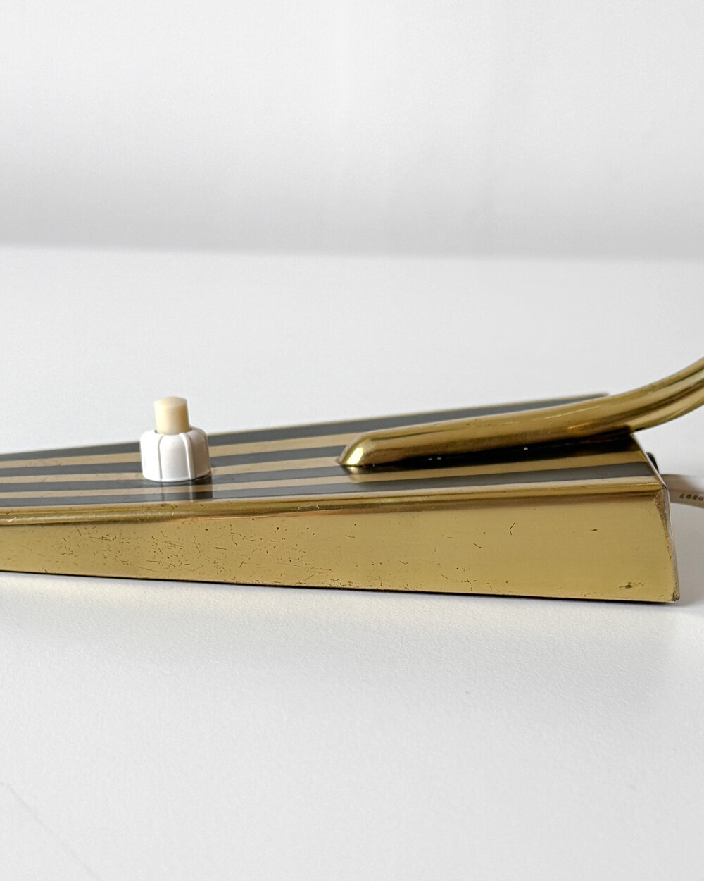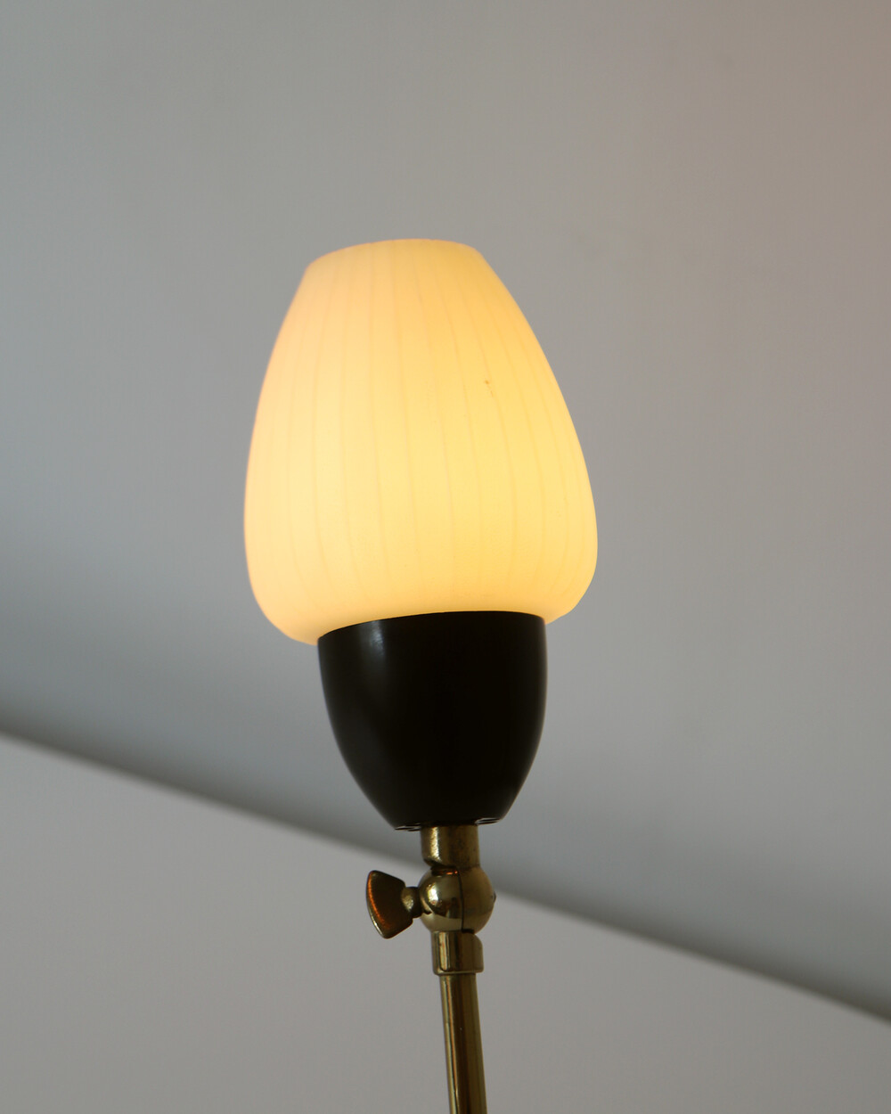 골드 메탈과 블랙 스트라이프 장식이 어우러진 클래식한 디자인의 1970년대 독일의 베드사이드 넥 램프입니다. 유연한 곡선의 메탈 넥에는 각도를 조절할 수 있는 셰이드가 연결되어 있으며, 플라스틱 소재로 만들어져 아늑하고 부드러운 빛을 공간에 확산합니다.
