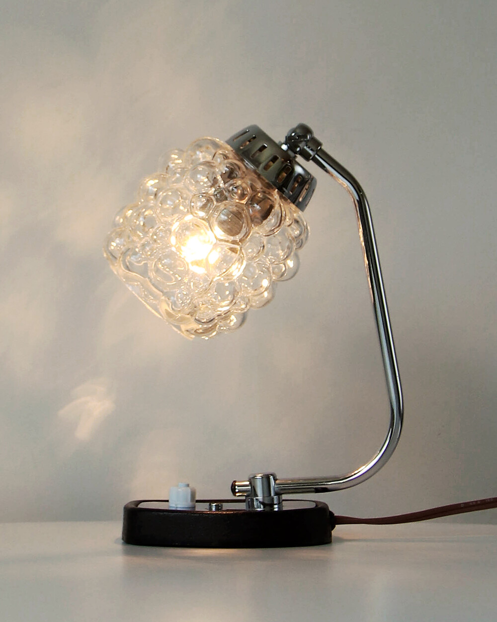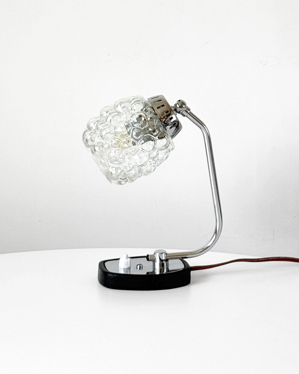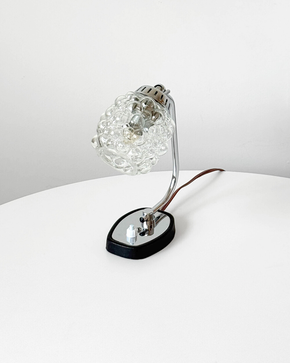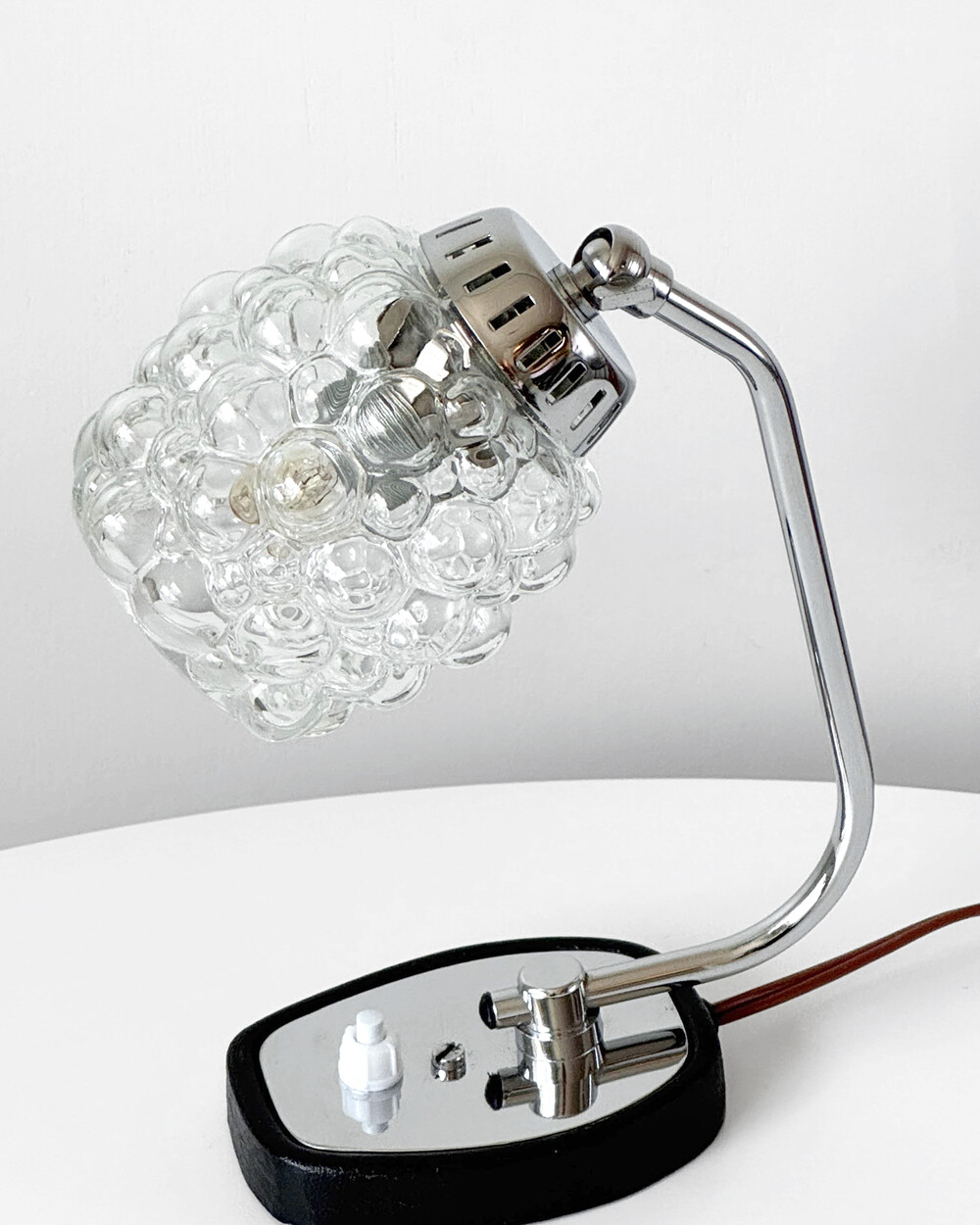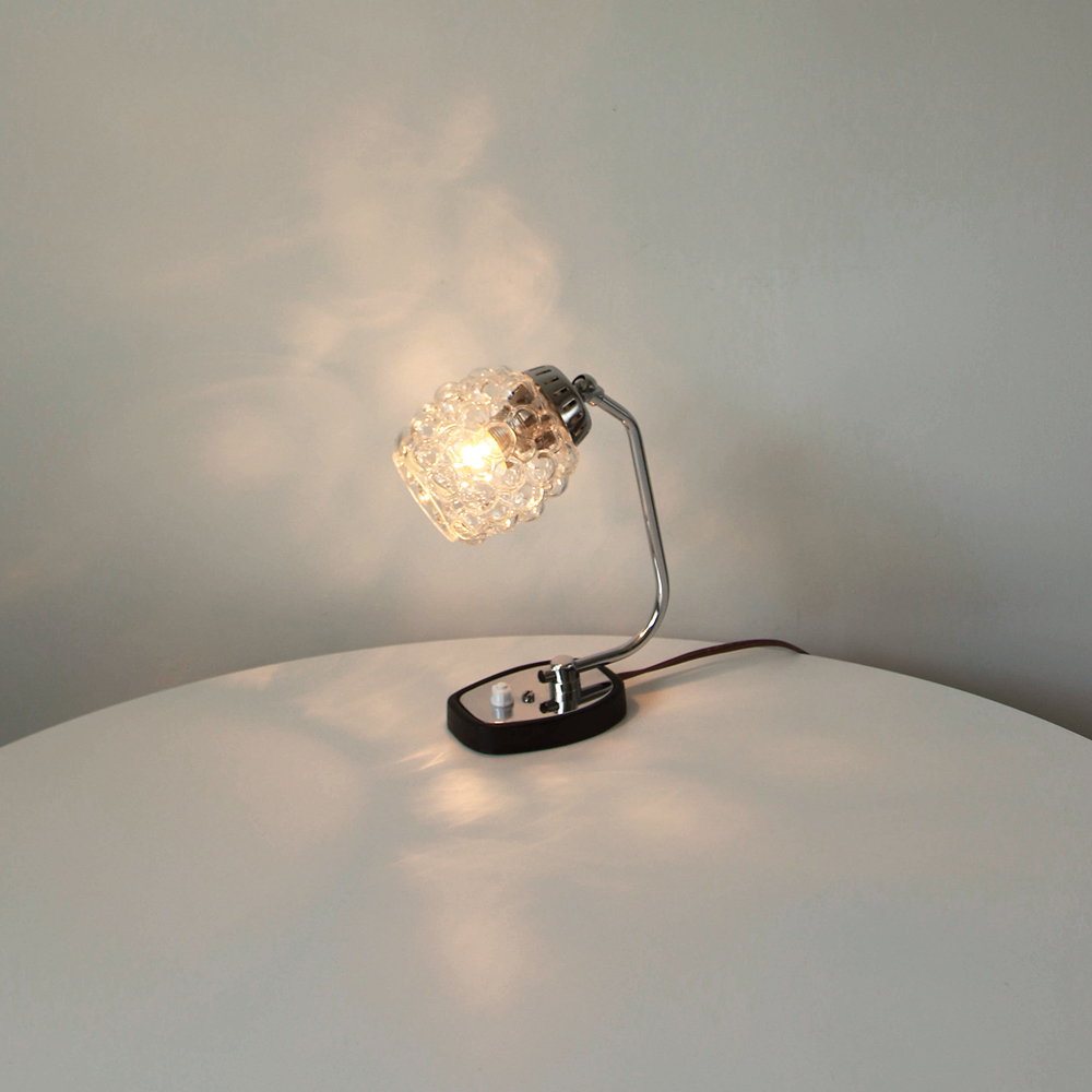 크롬과 블랙 메탈 베이스, 투명한 버블 글라스 셰이드가 어우러진 1970년대 독일 베드사이드 넥 램프입니다.