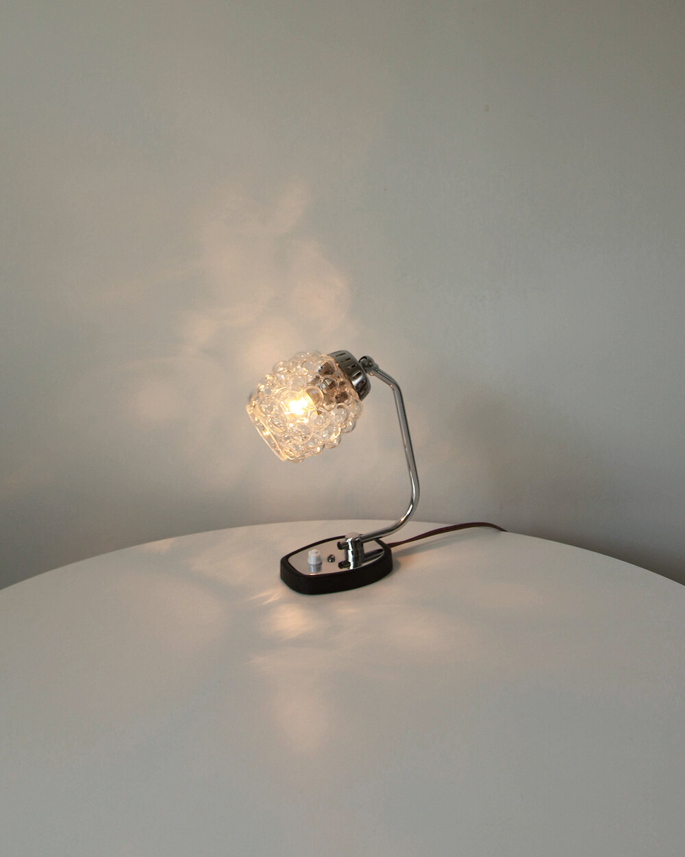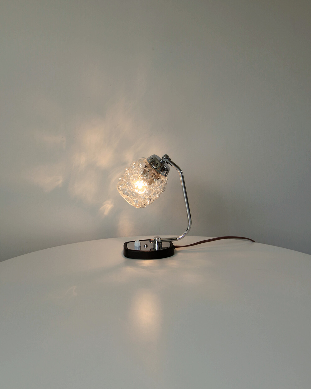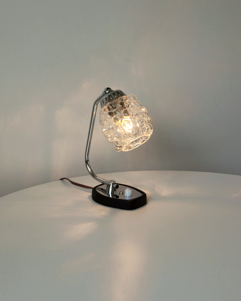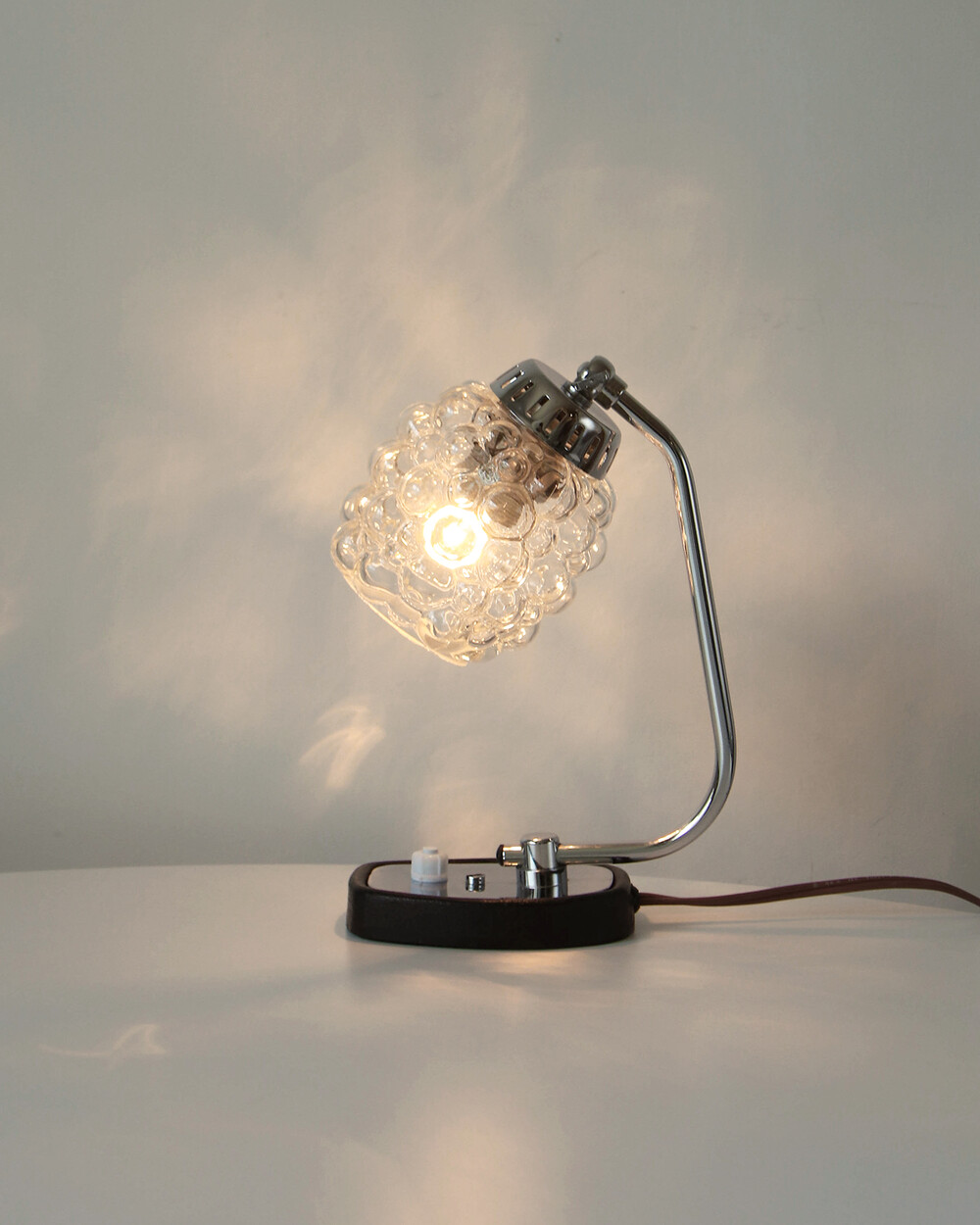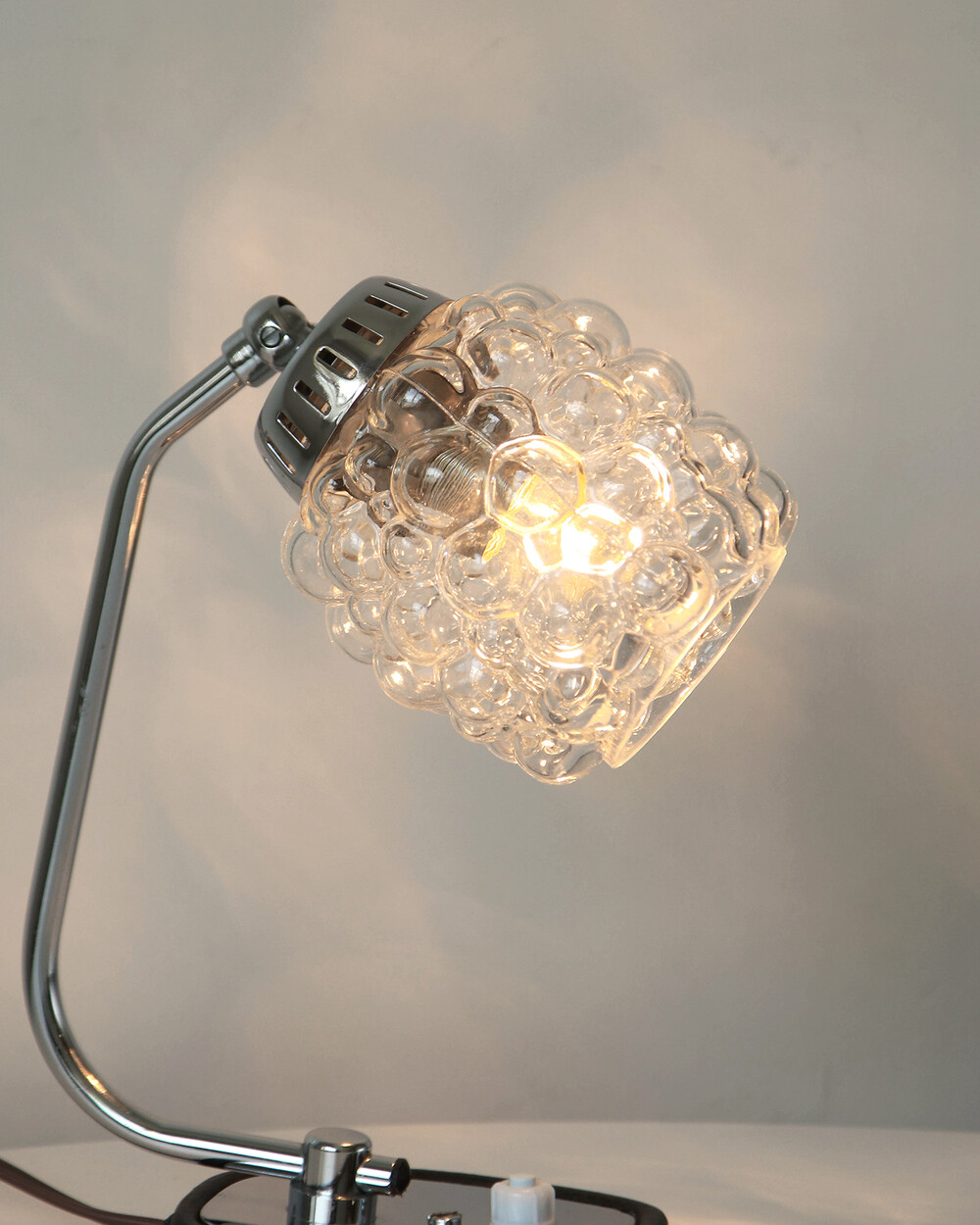 크롬과 블랙 메탈 베이스, 투명한 버블 글라스 셰이드가 어우러진 1970년대 독일 베드사이드 넥 램프입니다.