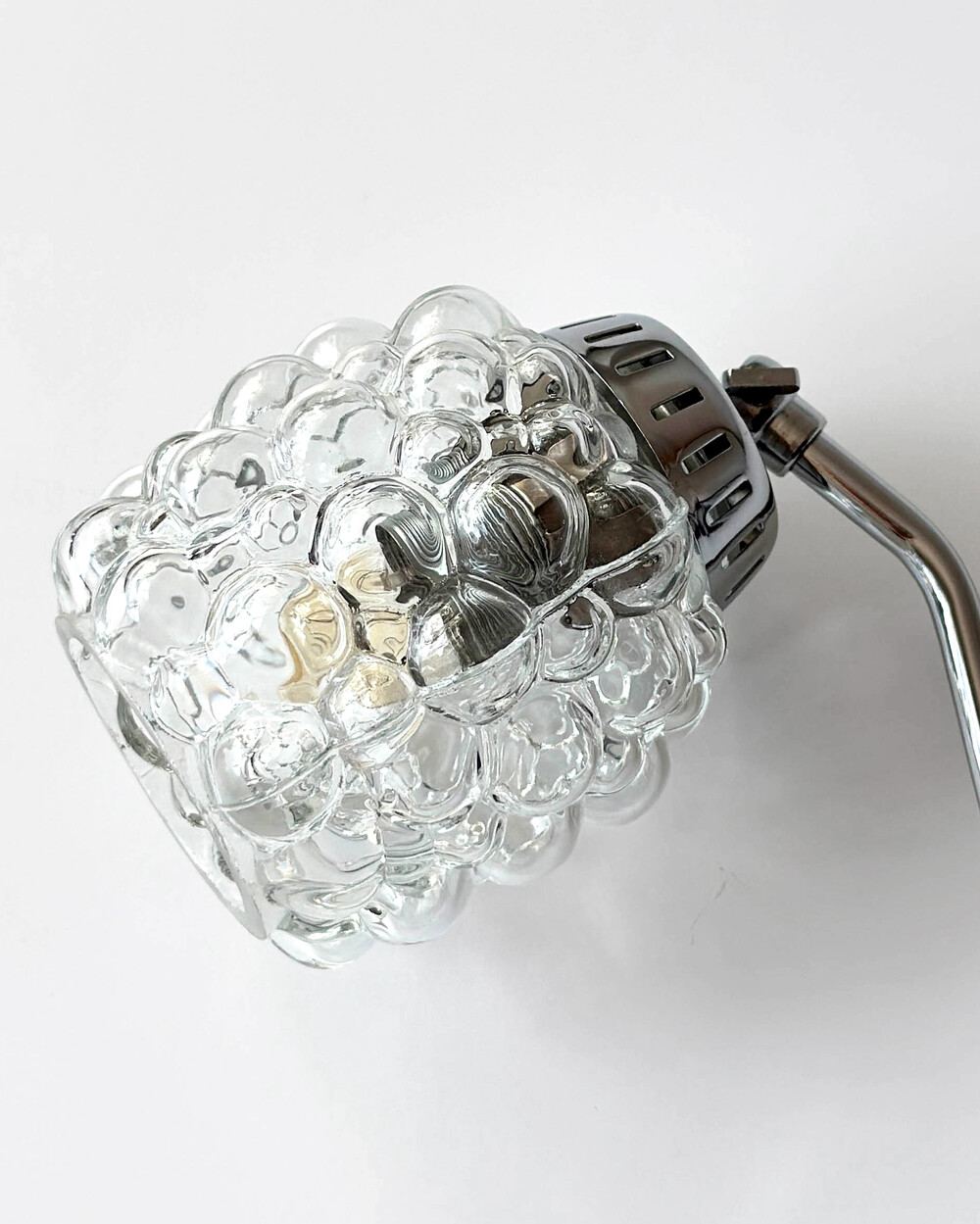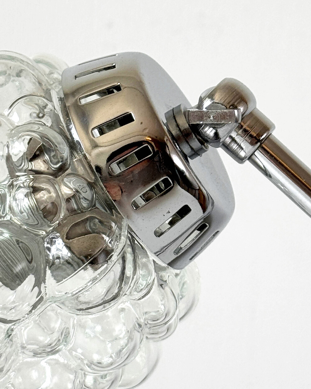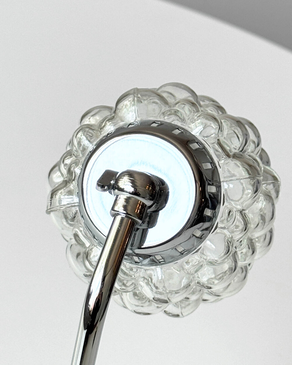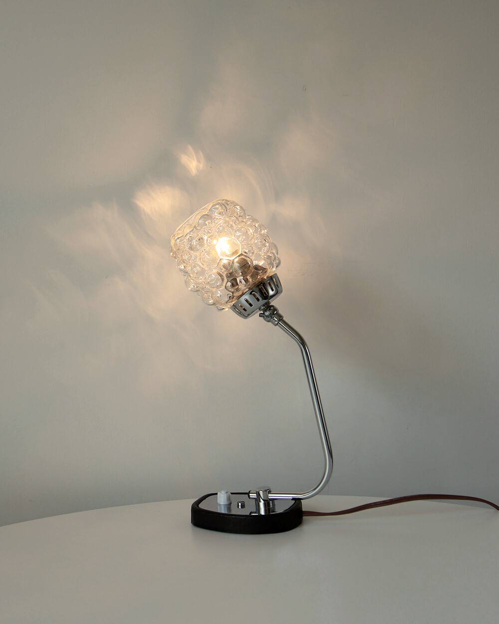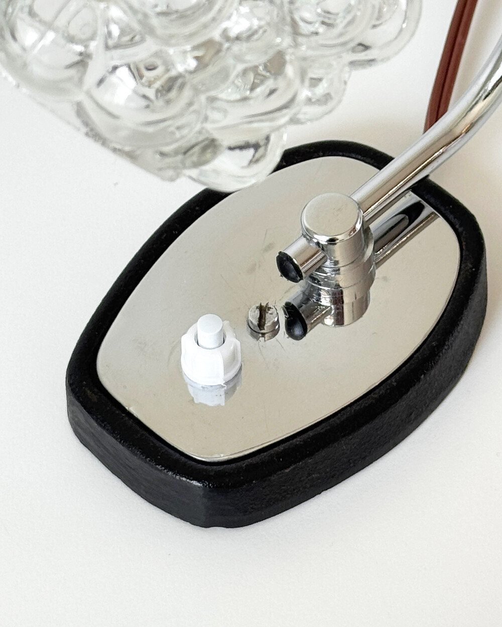 크롬과 블랙 메탈 베이스, 투명한 버블 글라스 셰이드가 어우러진 1970년대 독일 베드사이드 넥 램프입니다.