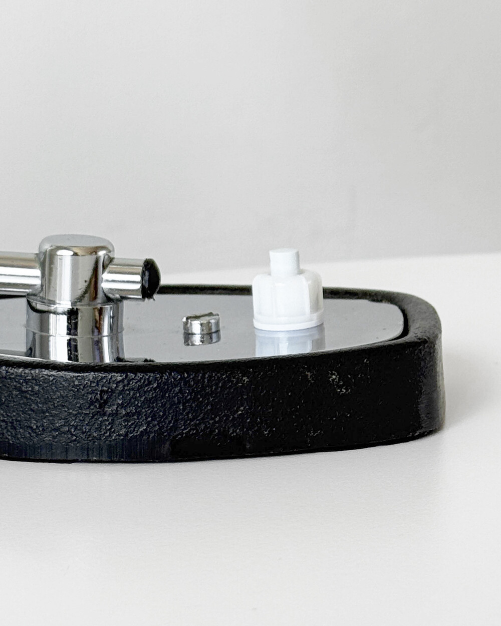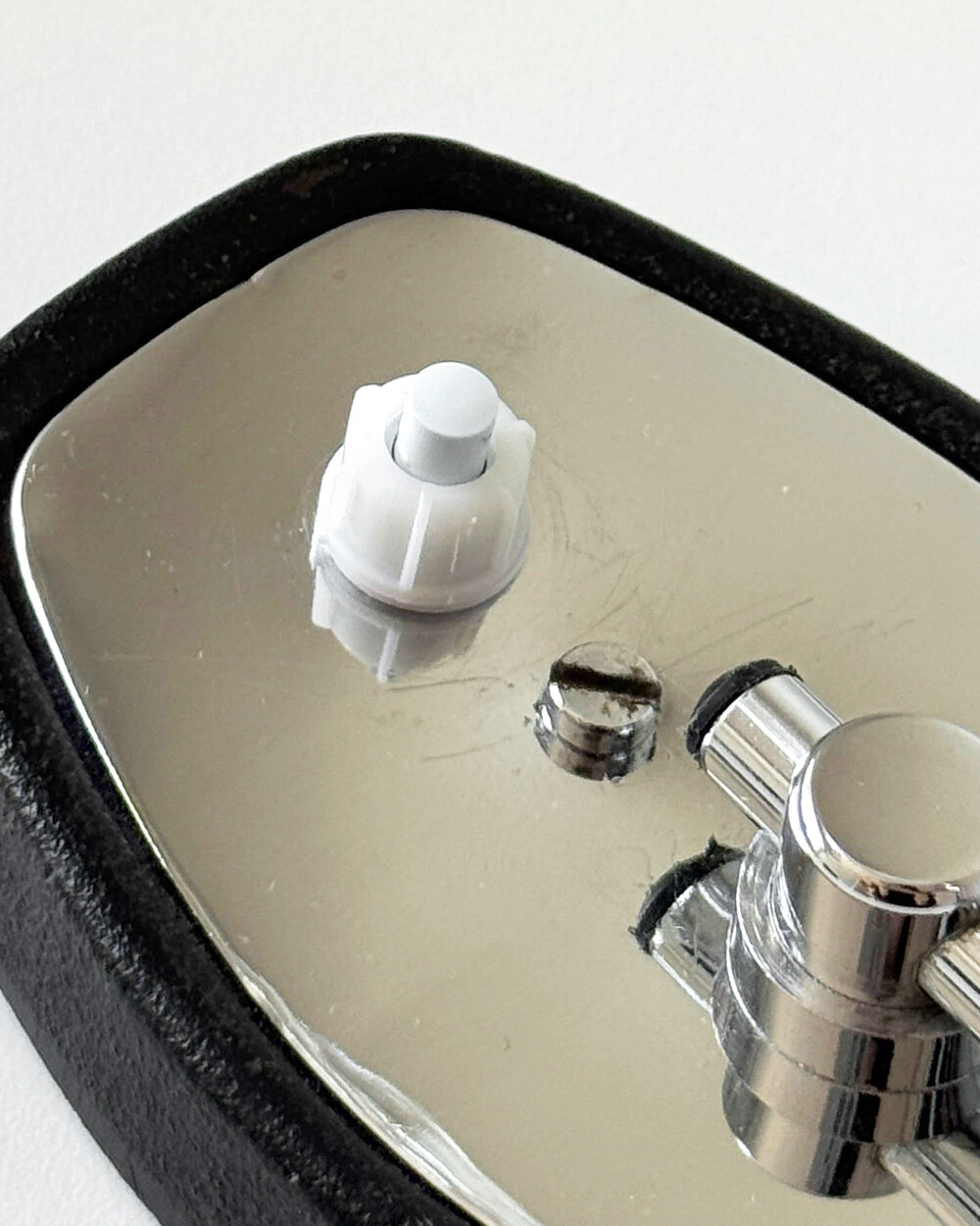베이스 크롬 장식에 남은 선 형태의 스크래치와 앞면의 미세 눌림