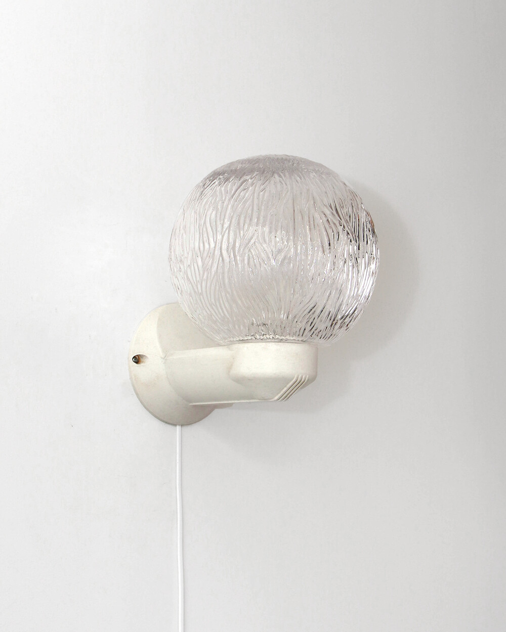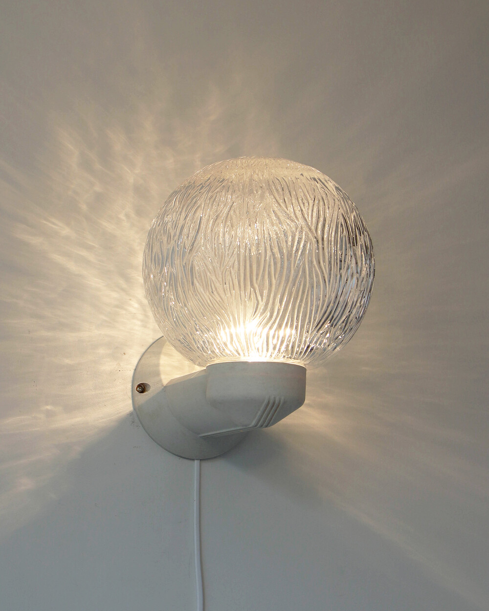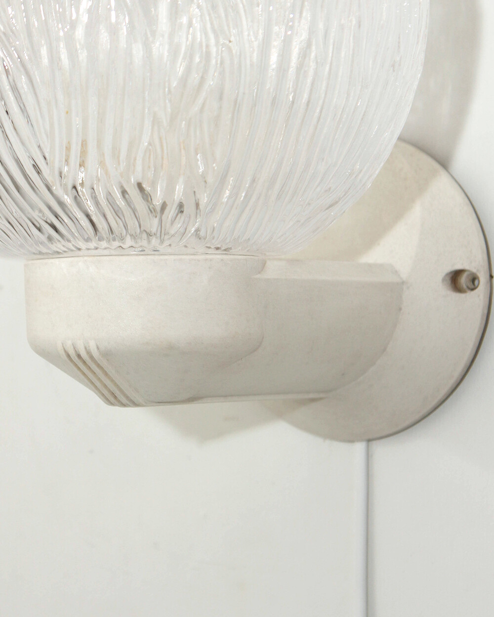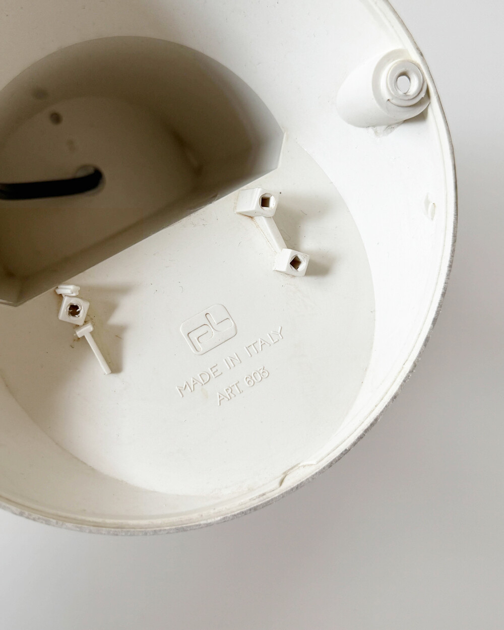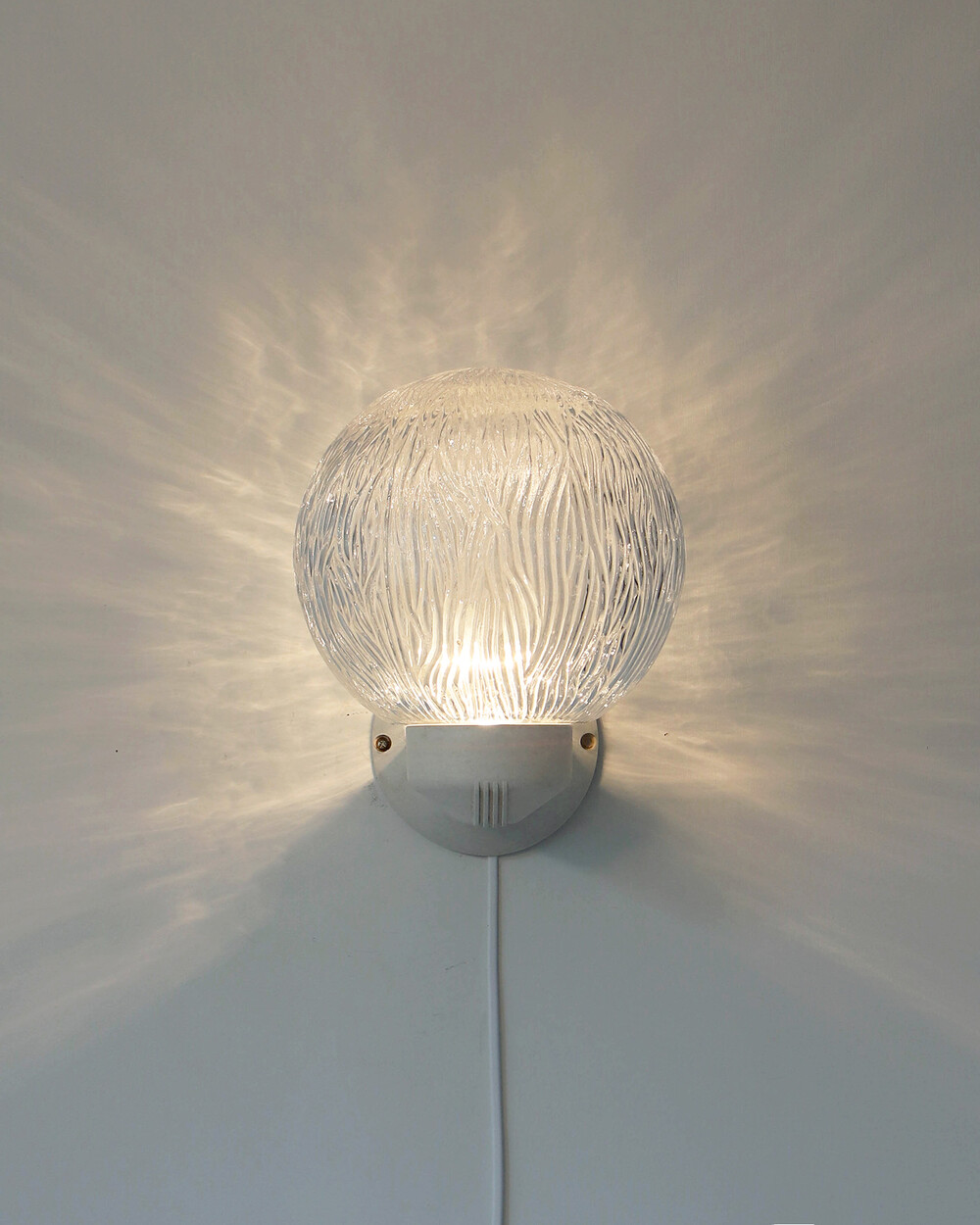 스페이스 에이지 시대의 모던한 조형미가 돋보이는 빅사이즈 월램프로, 1970년대 이탈리아 Plastica Lampadari에서 제작된 Art.603 모델입니다. 주름 패턴이 입체적으로 새겨진 구형의 텍스처 글라스 셰이드와 화이트 톤의 플라스틱 베이스로 구성되어 있으며, 점등 시 벽면을 따라 은은하고 유기적인 빛의 결을 드리웁니다.