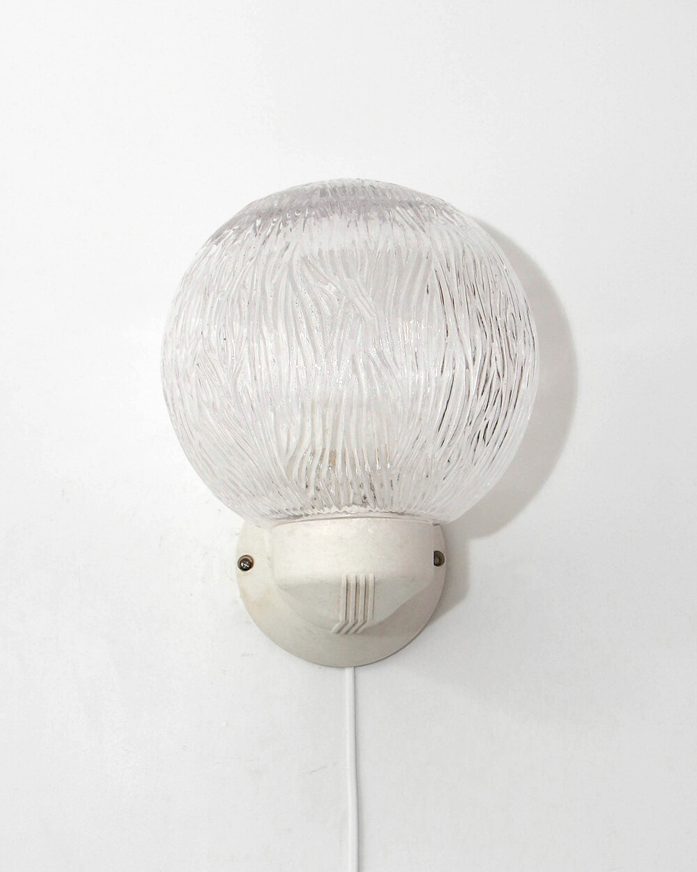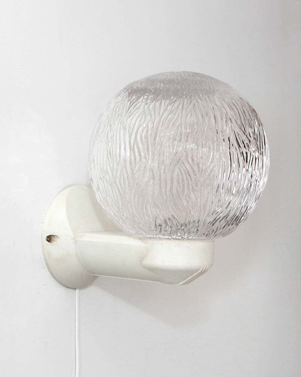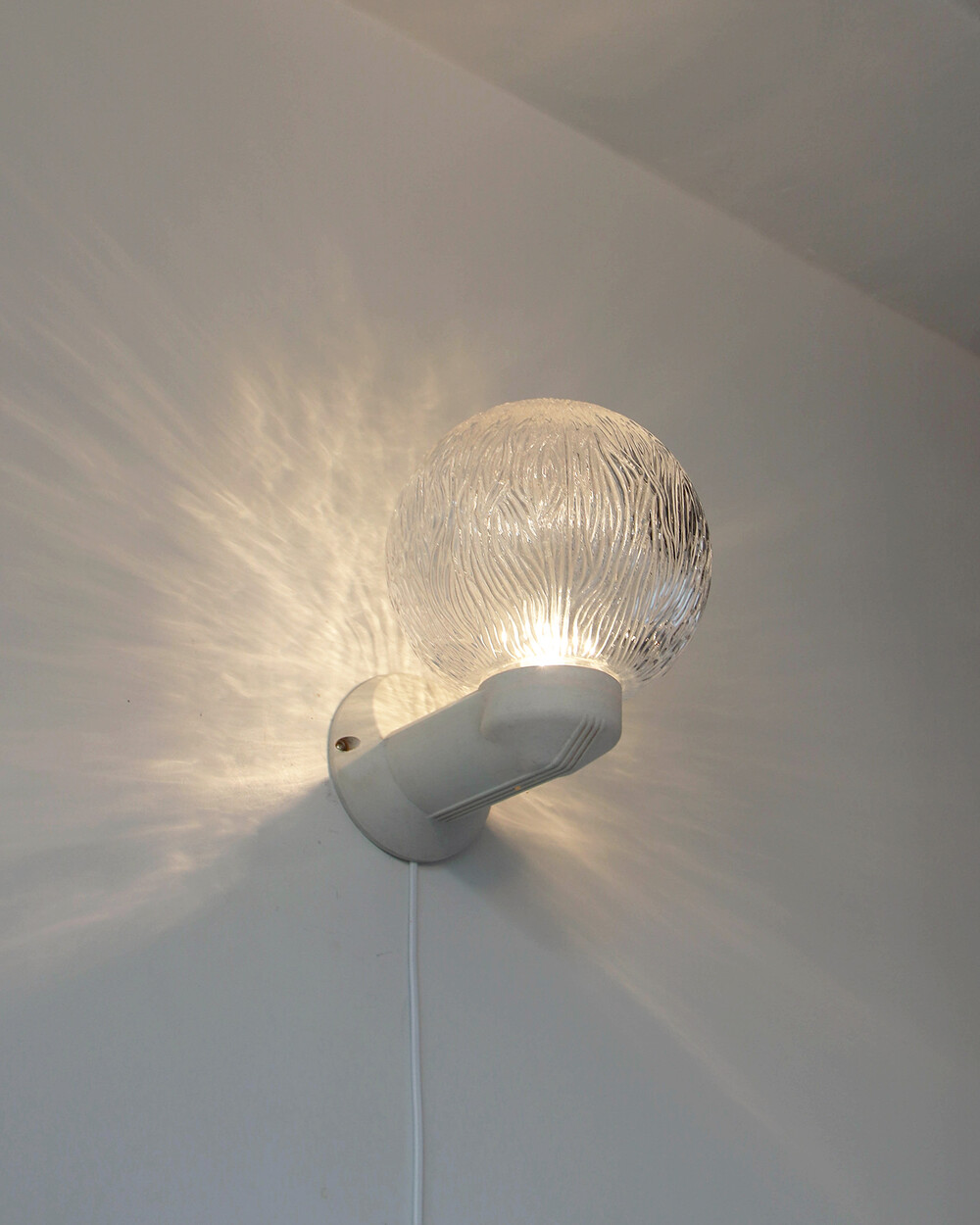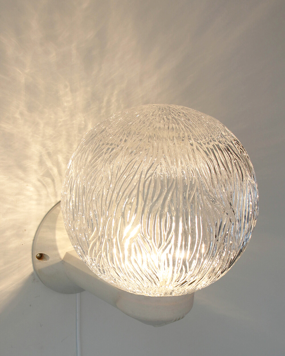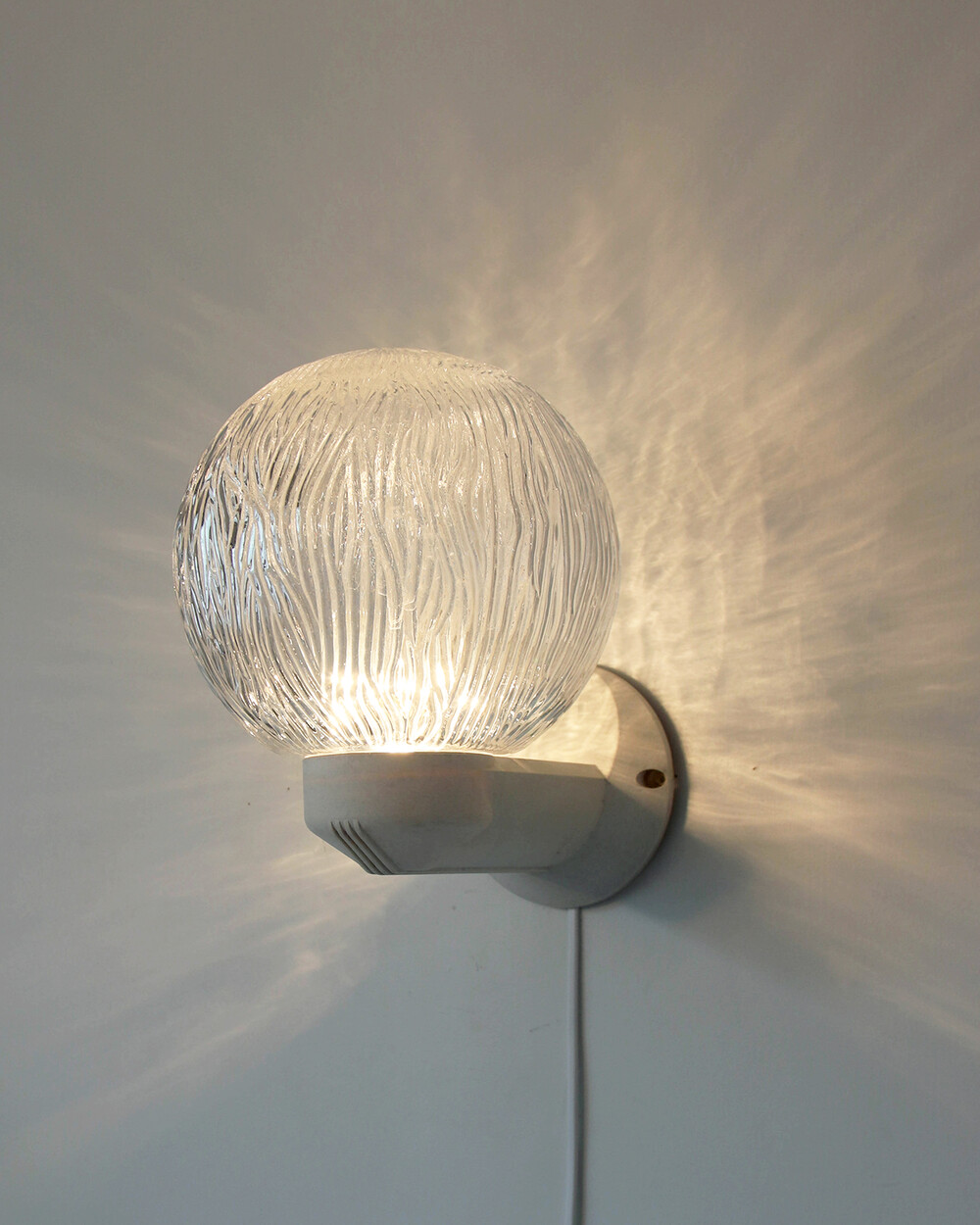스페이스 에이지 시대의 모던한 조형미가 돋보이는 빅사이즈 월램프로, 1970년대 이탈리아 Plastica Lampadari에서 제작된 Art.603 모델입니다. 주름 패턴이 입체적으로 새겨진 구형의 텍스처 글라스 셰이드와 화이트 톤의 플라스틱 베이스로 구성되어 있으며, 점등 시 벽면을 따라 은은하고 유기적인 빛의 결을 드리웁니다.