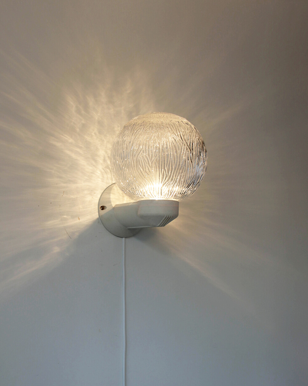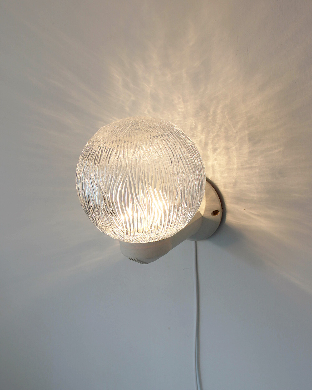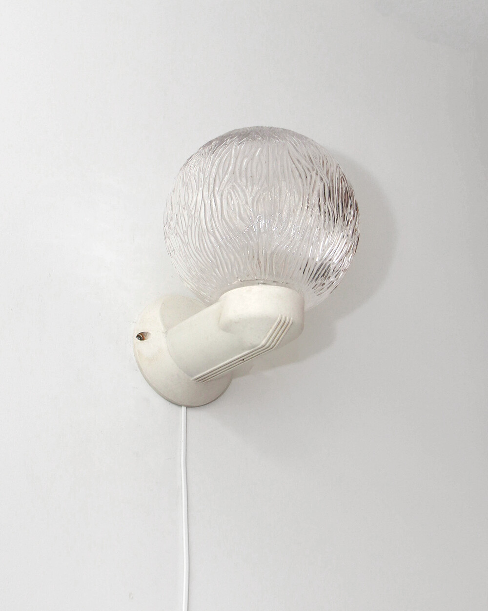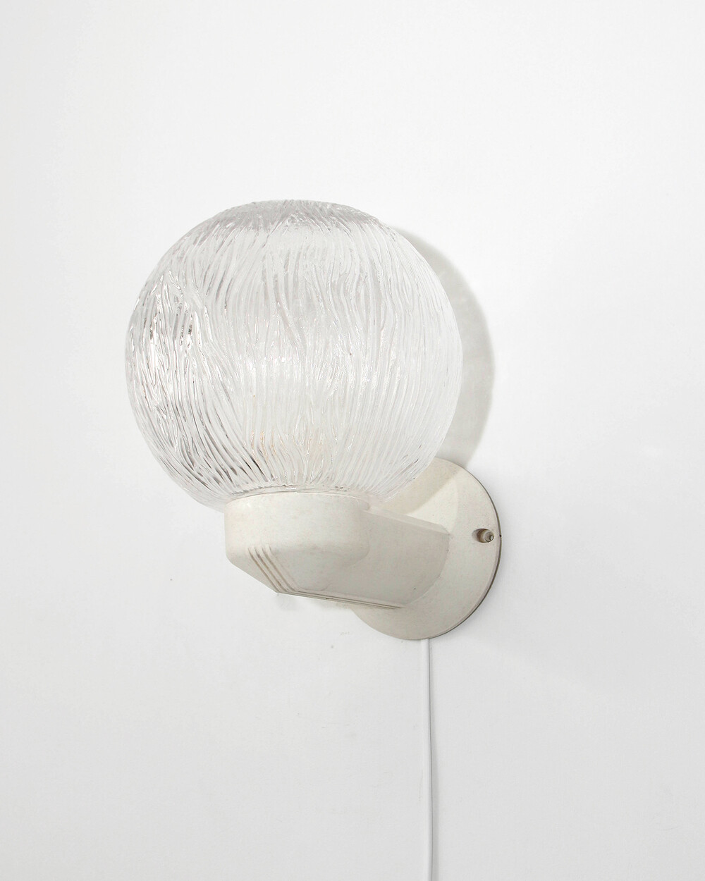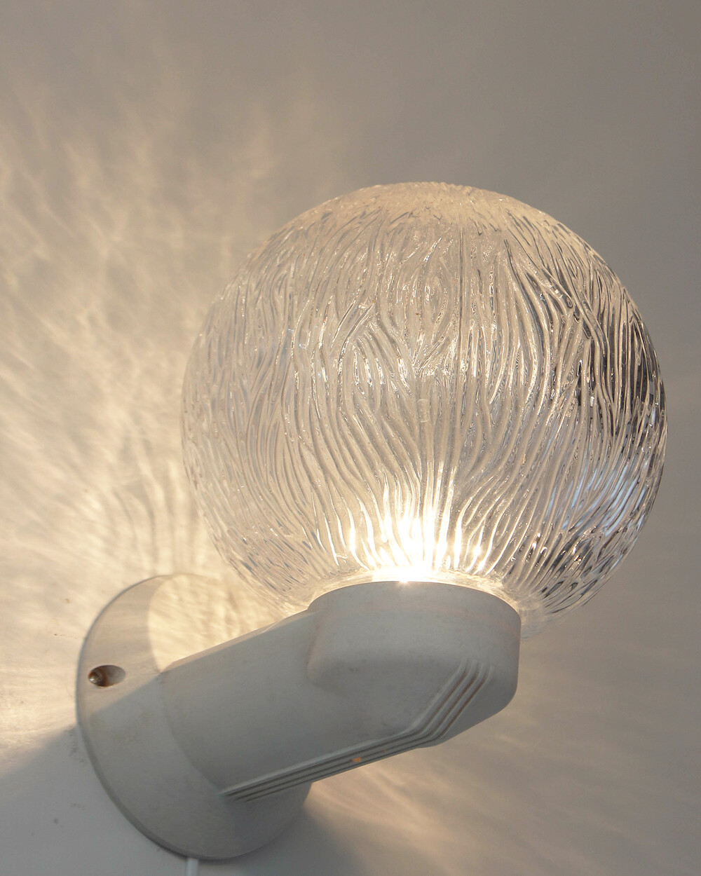 스페이스 에이지 시대의 모던한 조형미가 돋보이는 빅사이즈 월램프로, 1970년대 이탈리아 Plastica Lampadari에서 제작된 Art.603 모델입니다. 주름 패턴이 입체적으로 새겨진 구형의 텍스처 글라스 셰이드와 화이트 톤의 플라스틱 베이스로 구성되어 있으며, 점등 시 벽면을 따라 은은하고 유기적인 빛의 결을 드리웁니다.
