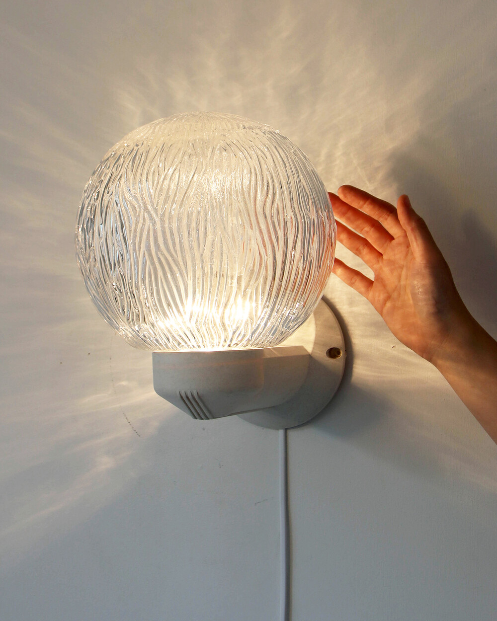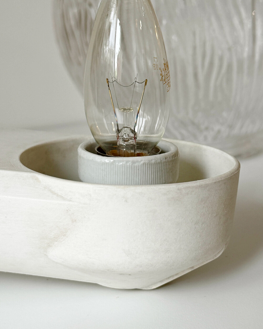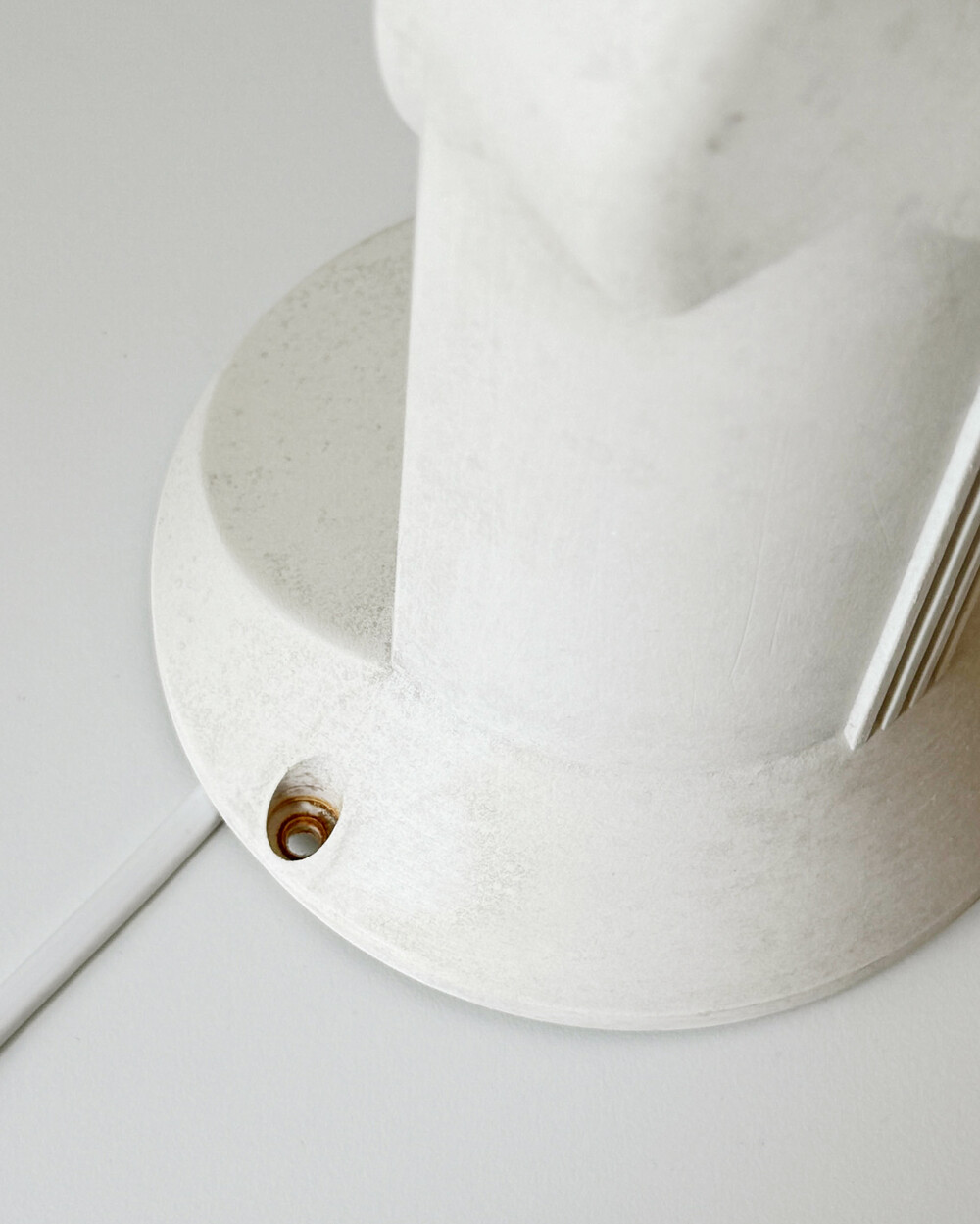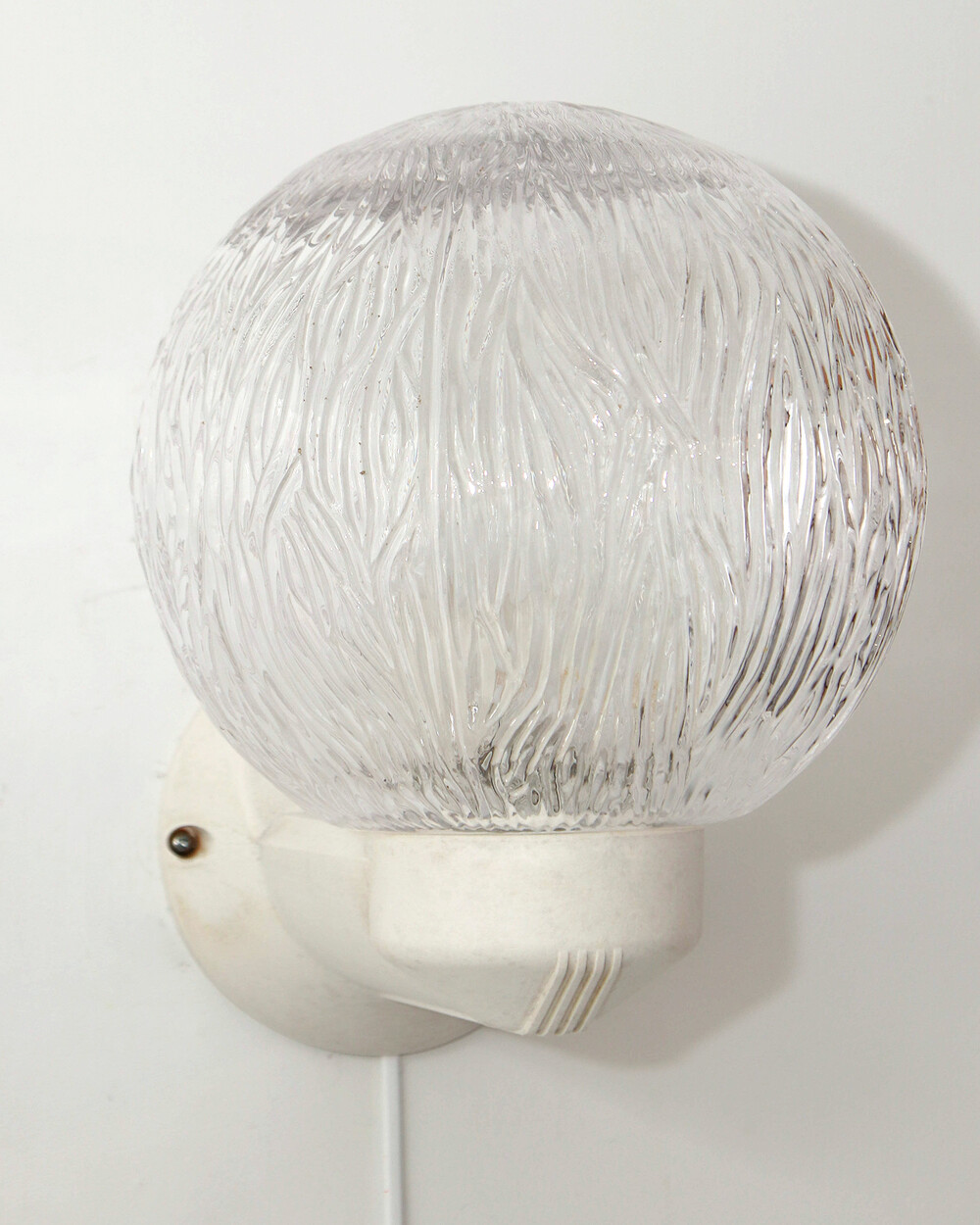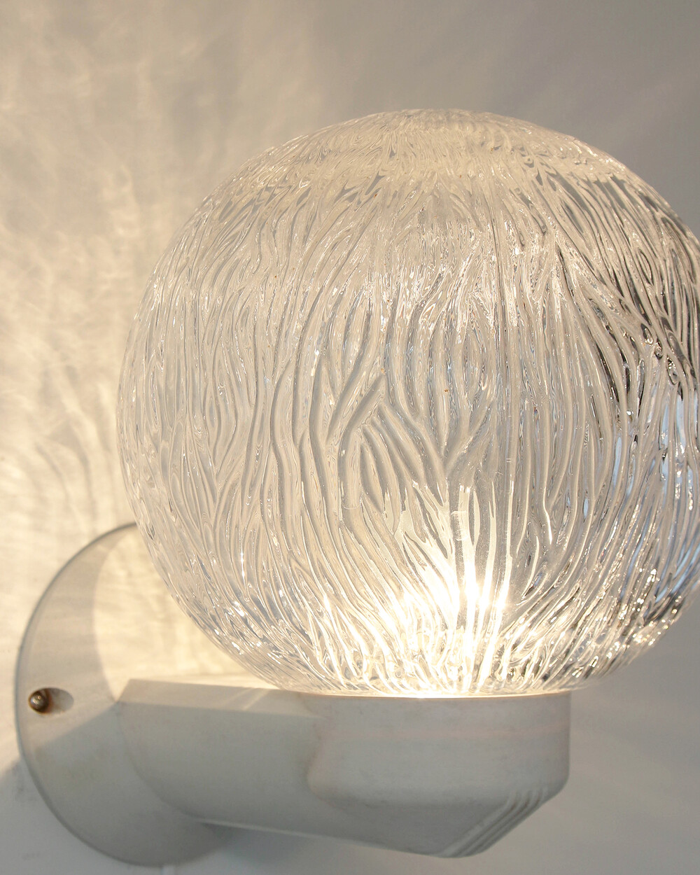 스페이스 에이지 시대의 모던한 조형미가 돋보이는 빅사이즈 월램프로, 1970년대 이탈리아 Plastica Lampadari에서 제작된 Art.603 모델입니다. 주름 패턴이 입체적으로 새겨진 구형의 텍스처 글라스 셰이드와 화이트 톤의 플라스틱 베이스로 구성되어 있으며, 점등 시 벽면을 따라 은은하고 유기적인 빛의 결을 드리웁니다.