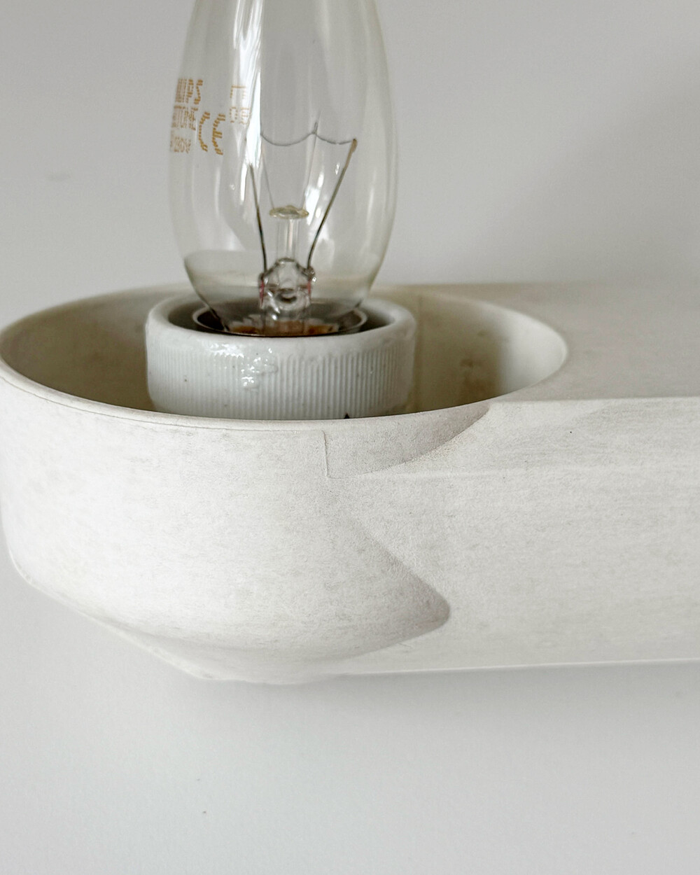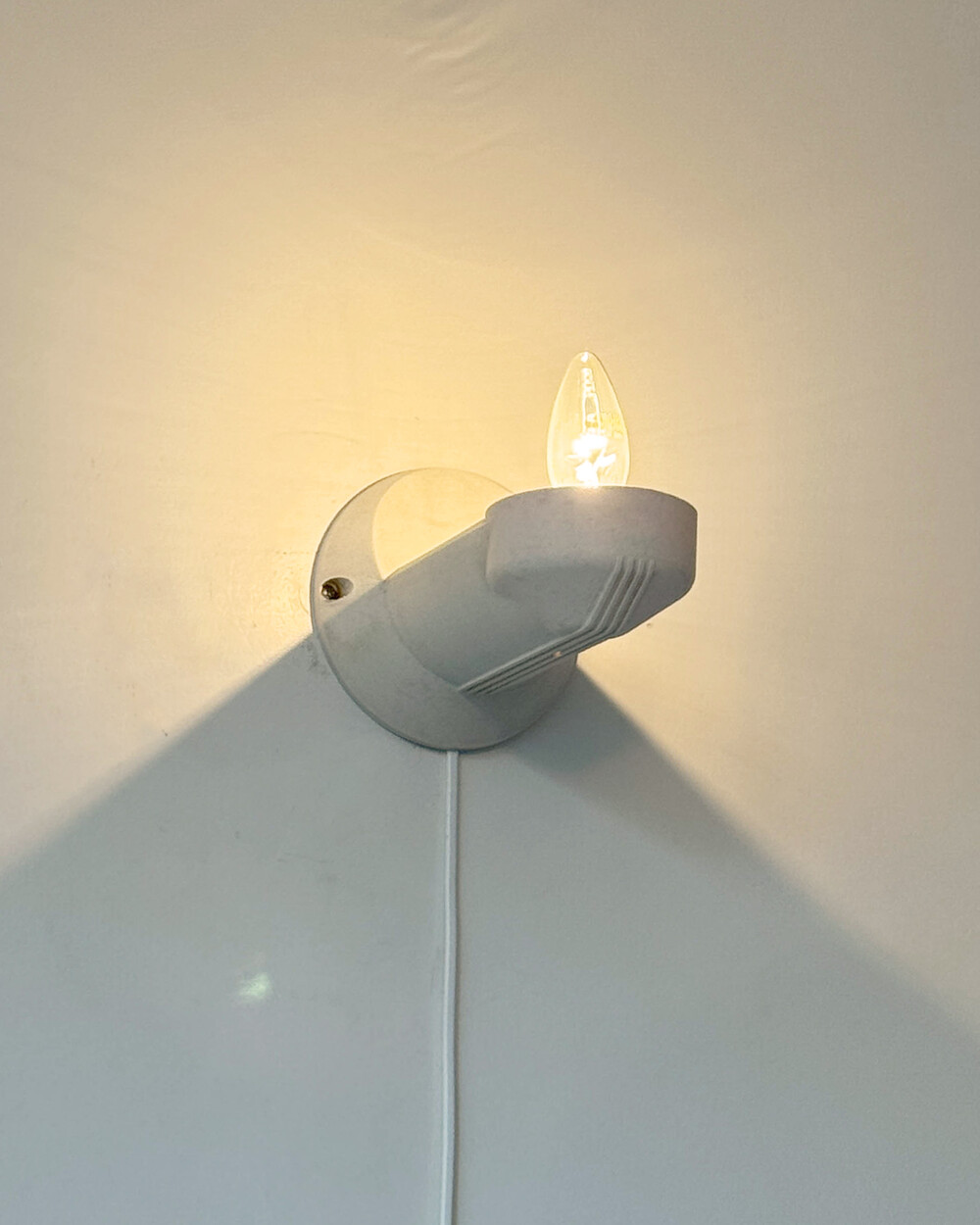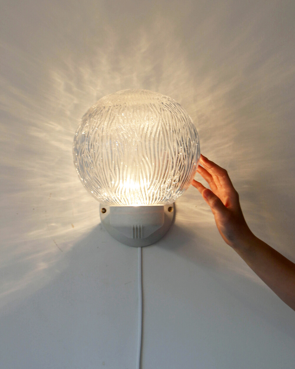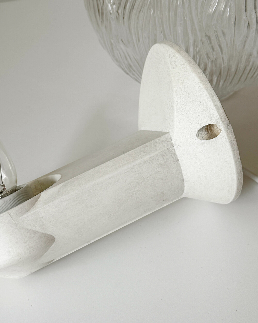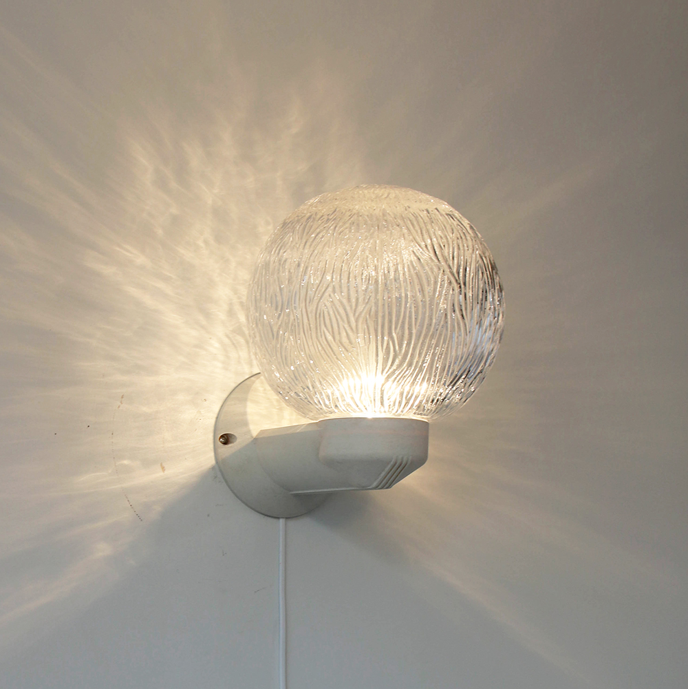스페이스 에이지 시대의 모던한 조형미가 돋보이는 빅사이즈 월램프로, 1970년대 이탈리아 Plastica Lampadari에서 제작된 Art.603 모델입니다. 주름 패턴이 입체적으로 새겨진 구형의 텍스처 글라스 셰이드와 화이트 톤의 플라스틱 베이스로 구성되어 있으며, 점등 시 벽면을 따라 은은하고 유기적인 빛의 결을 드리웁니다.