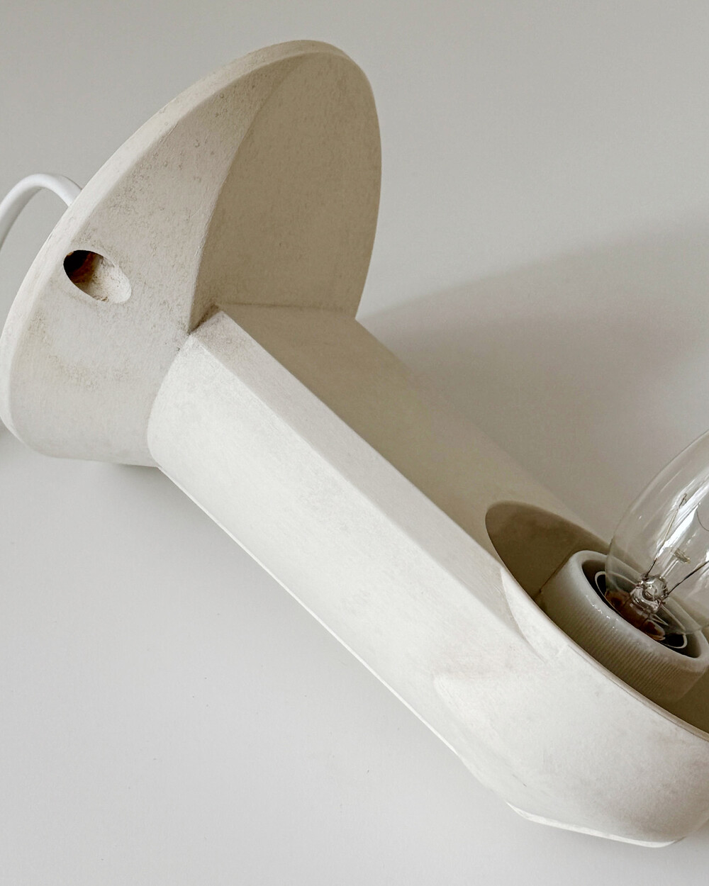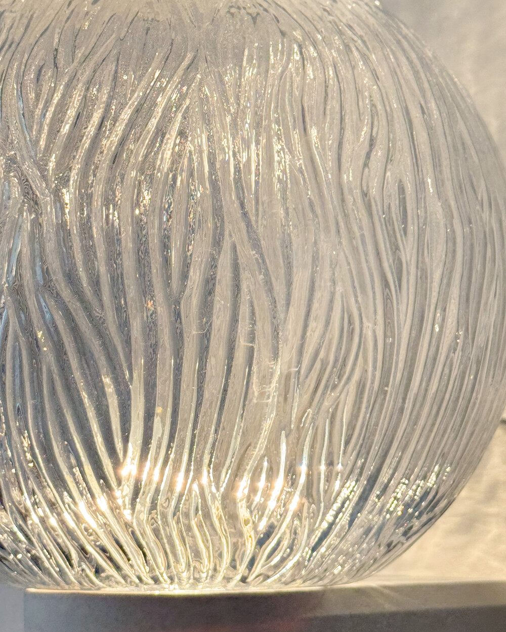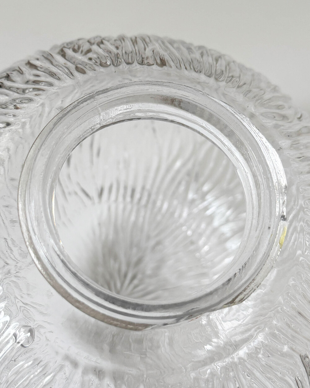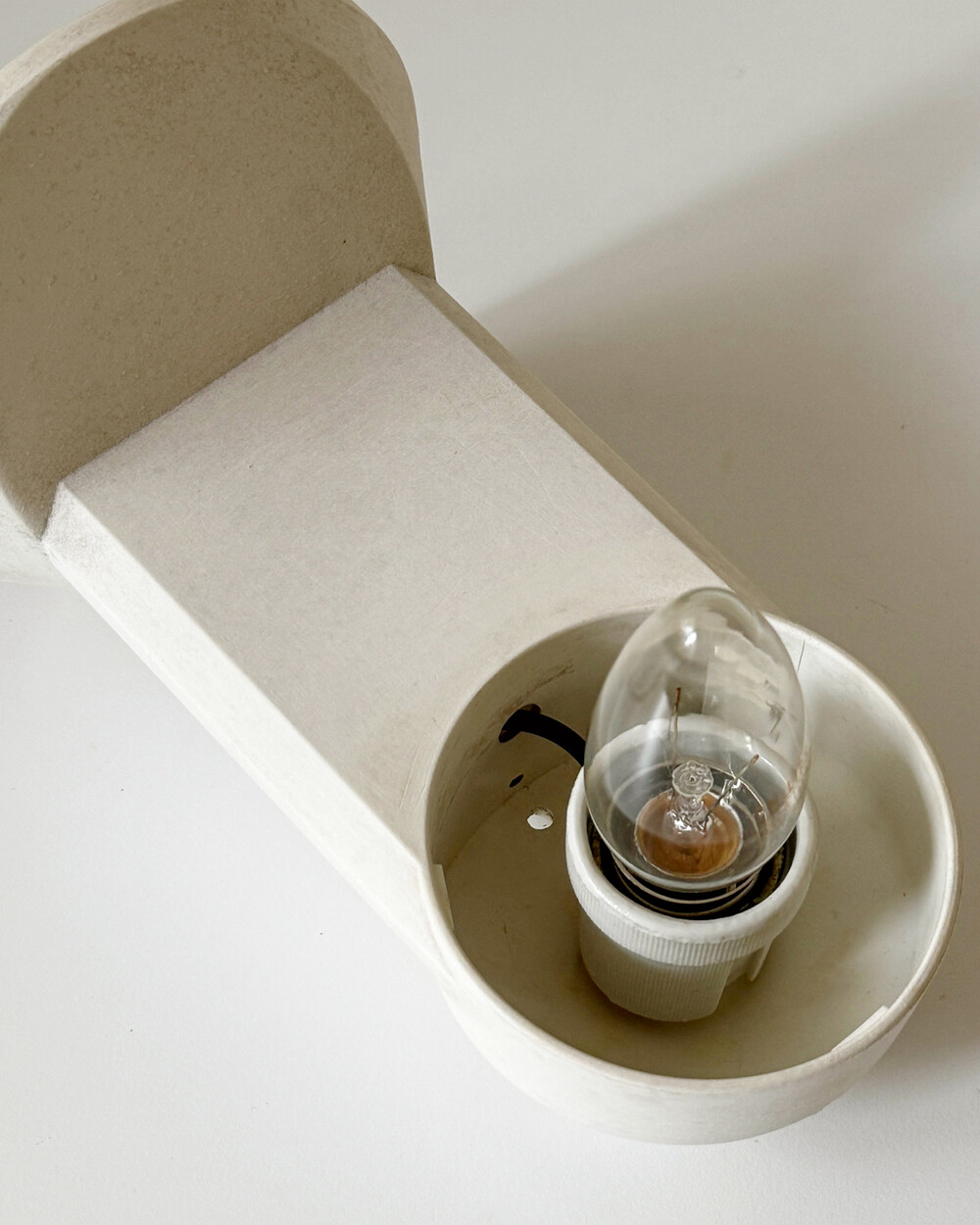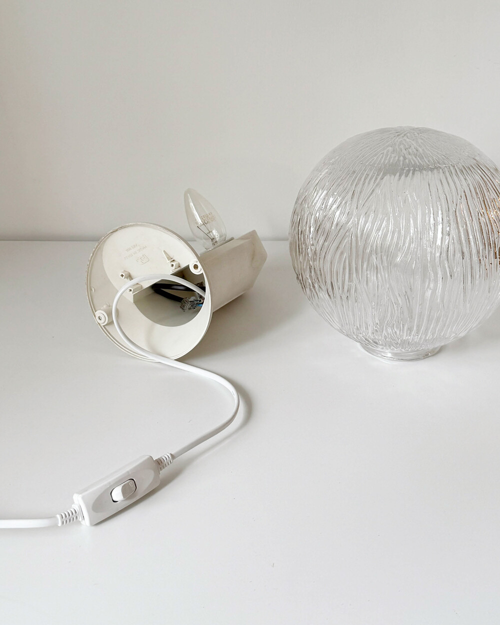 스페이스 에이지 시대의 모던한 조형미가 돋보이는 빅사이즈 월램프로, 1970년대 이탈리아 Plastica Lampadari에서 제작된 Art.603 모델입니다. 주름 패턴이 입체적으로 새겨진 구형의 텍스처 글라스 셰이드와 화이트 톤의 플라스틱 베이스로 구성되어 있으며, 점등 시 벽면을 따라 은은하고 유기적인 빛의 결을 드리웁니다.
