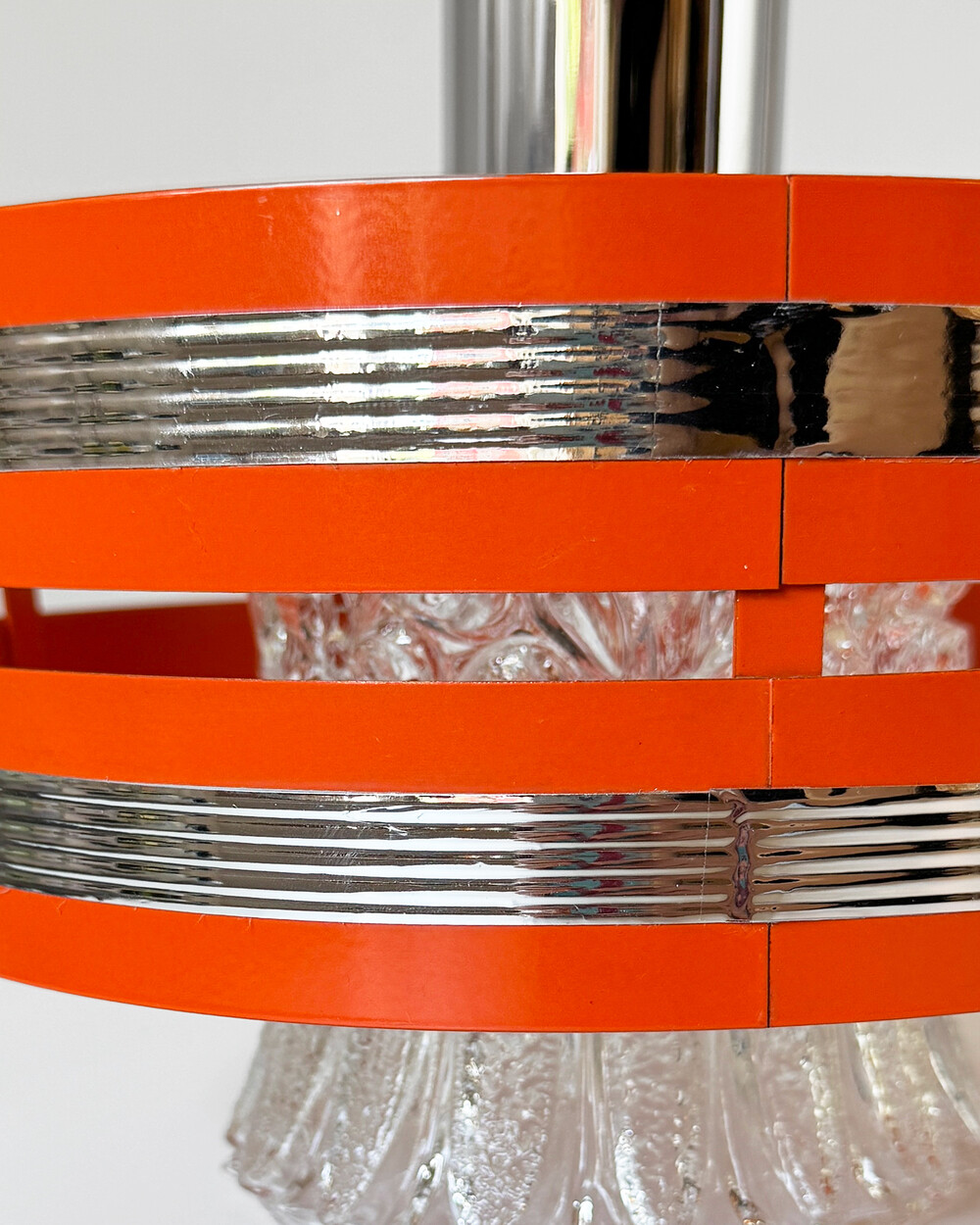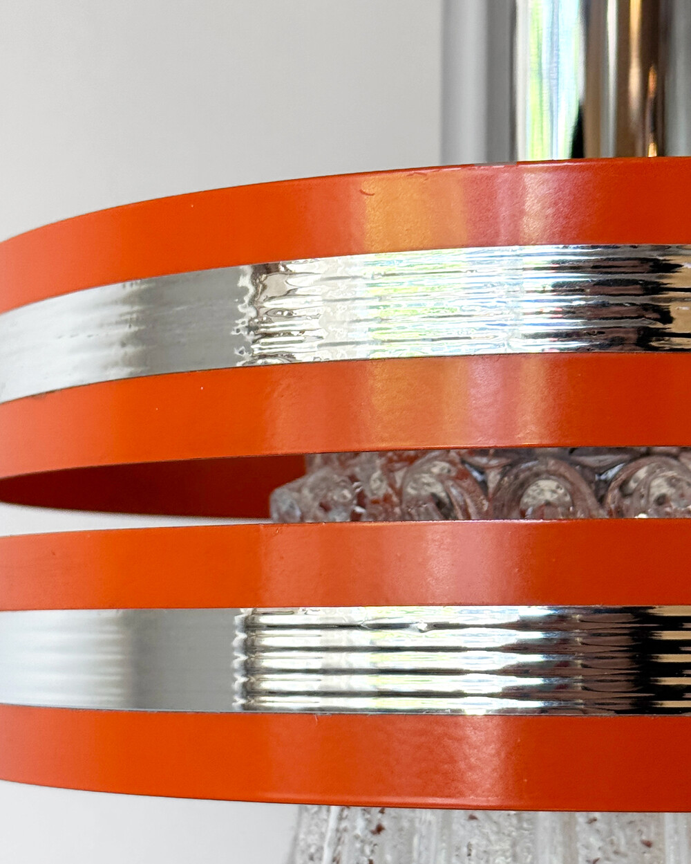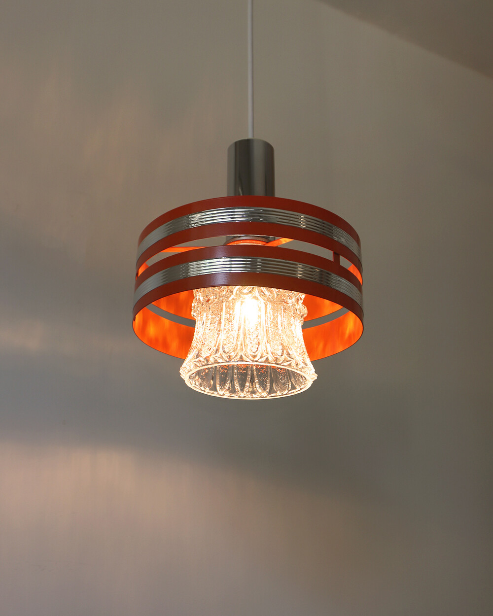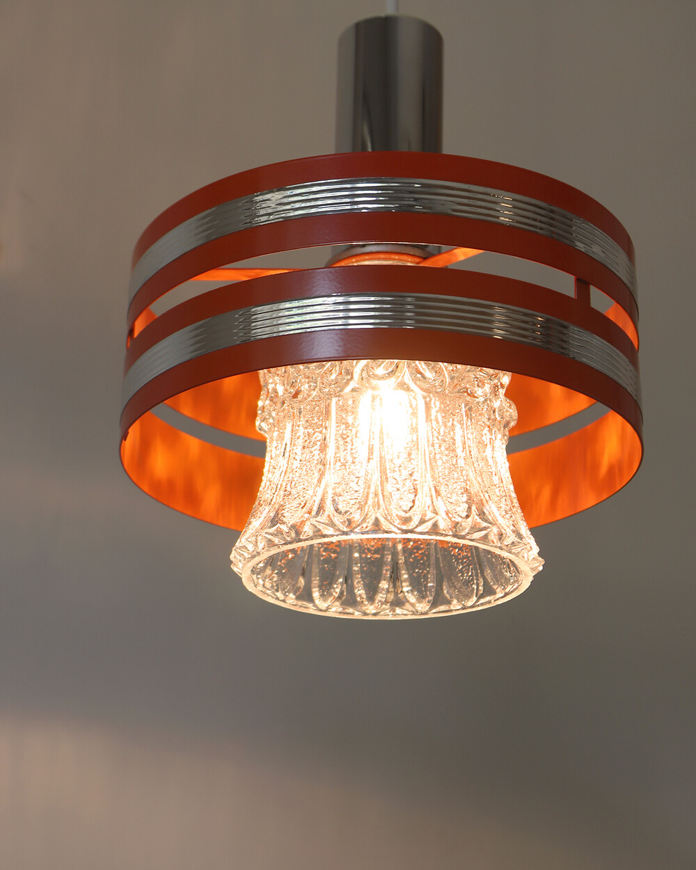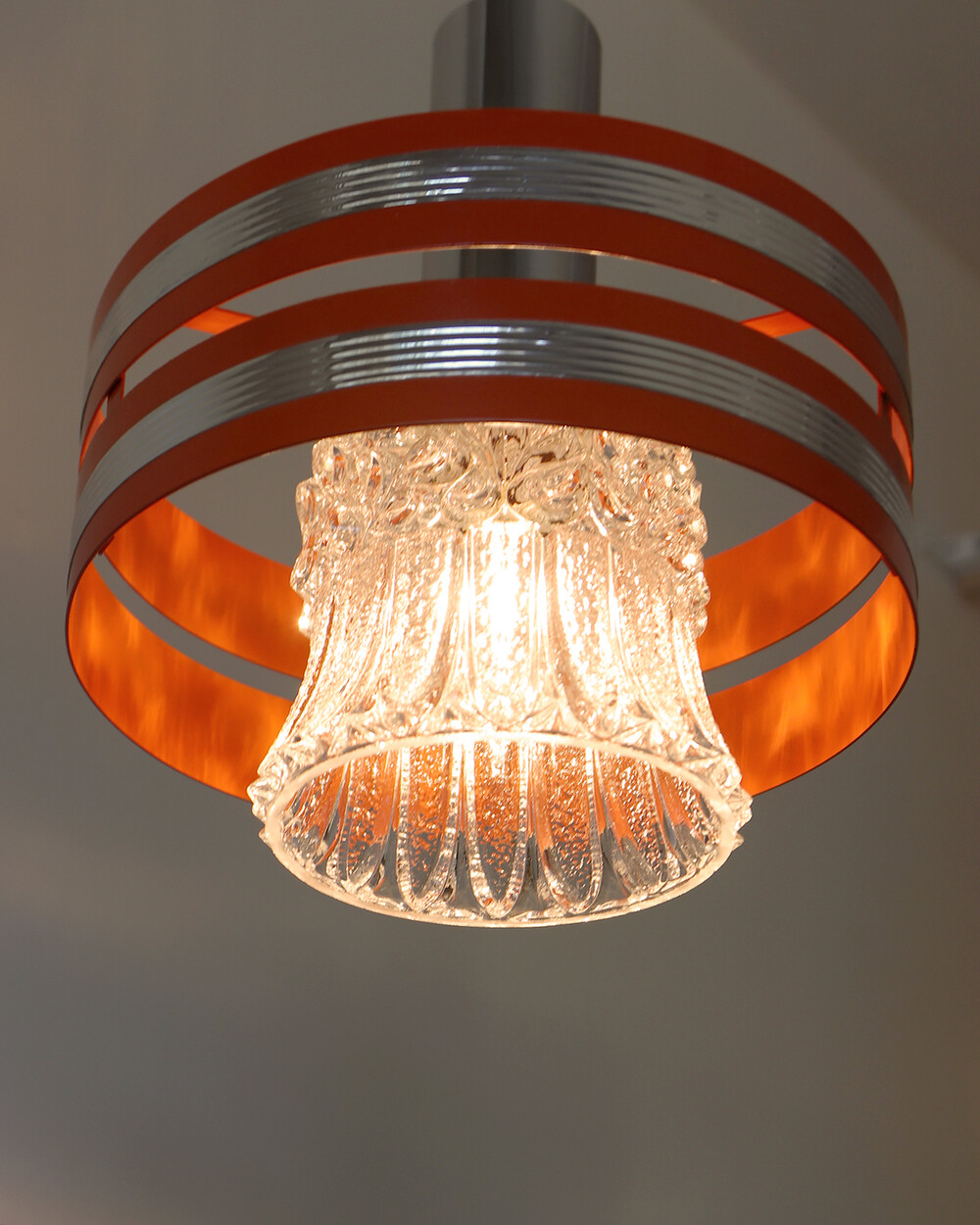 섬세한 입체 패턴의 크리스탈 글라스와 선명한 오렌지 컬러의 메탈 프레임이 조화를 이루는 1970년대 독일 펜던트 조명입니다.
