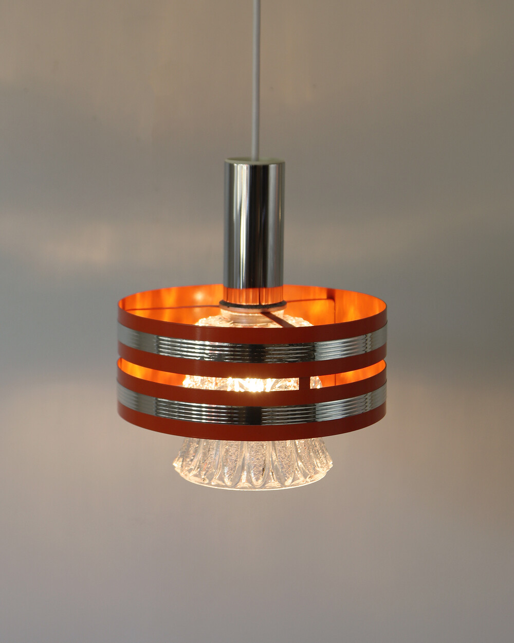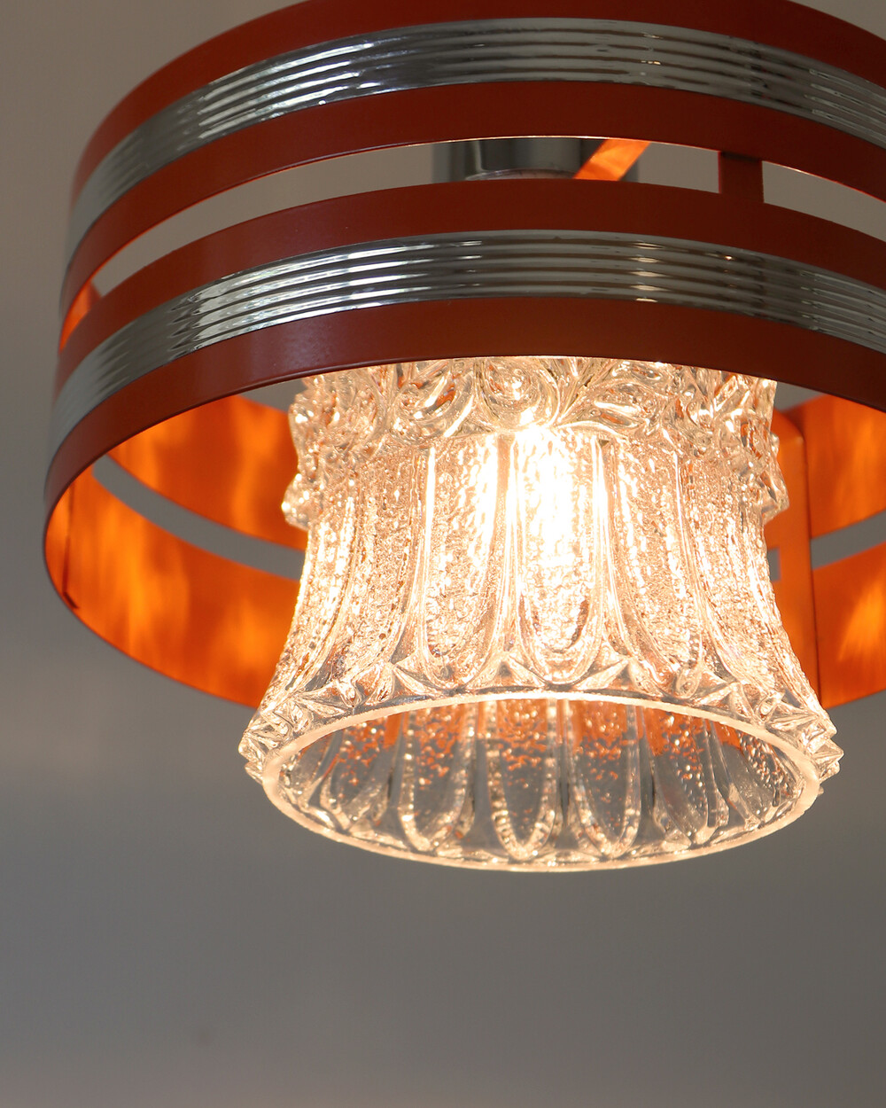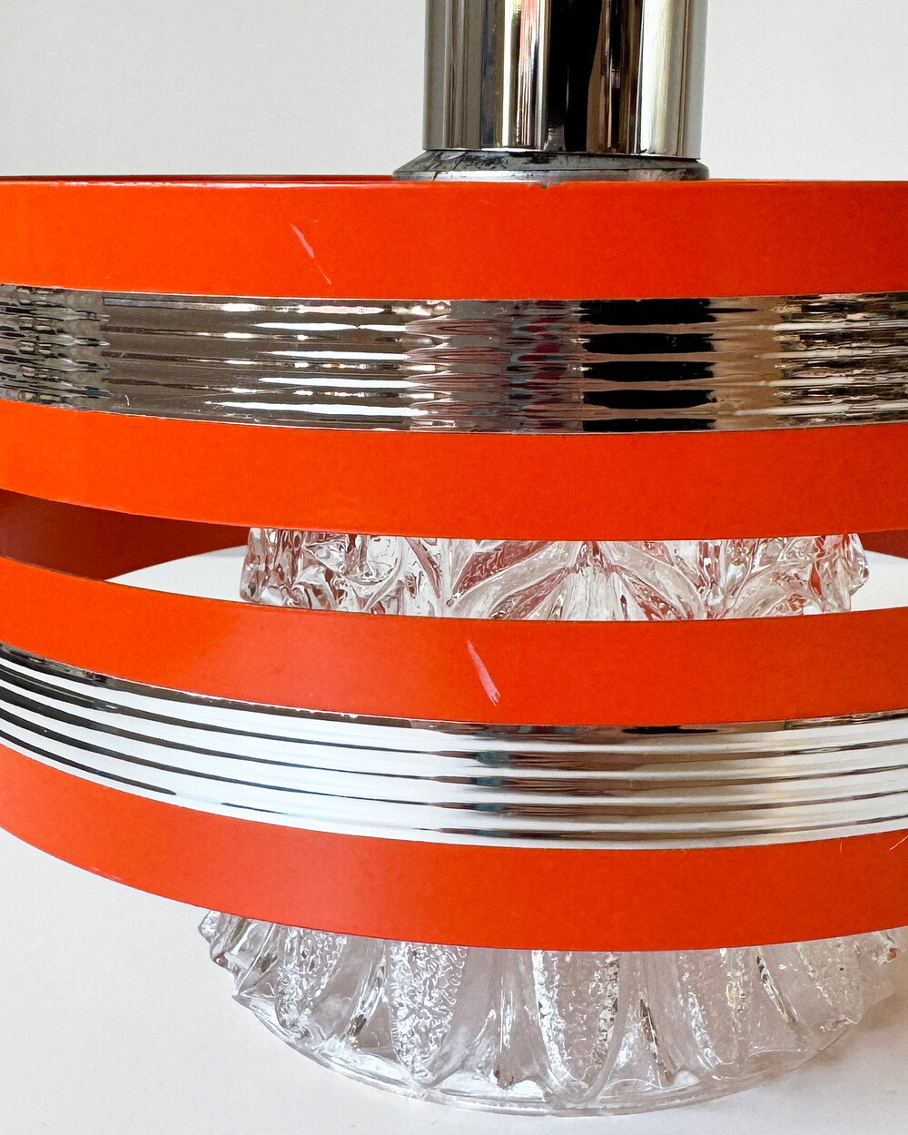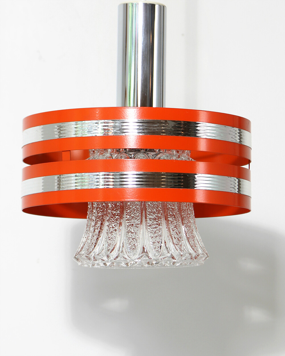 섬세한 입체 패턴의 크리스탈 글라스와 선명한 오렌지 컬러의 메탈 프레임이 조화를 이루는 1970년대 독일 펜던트 조명입니다.