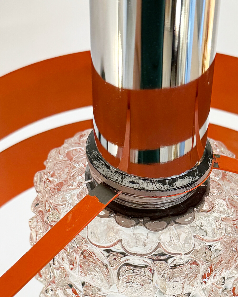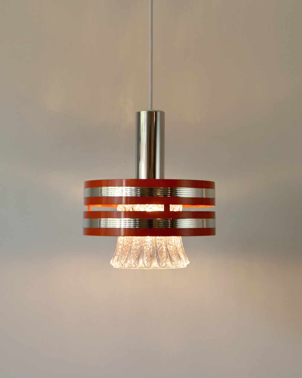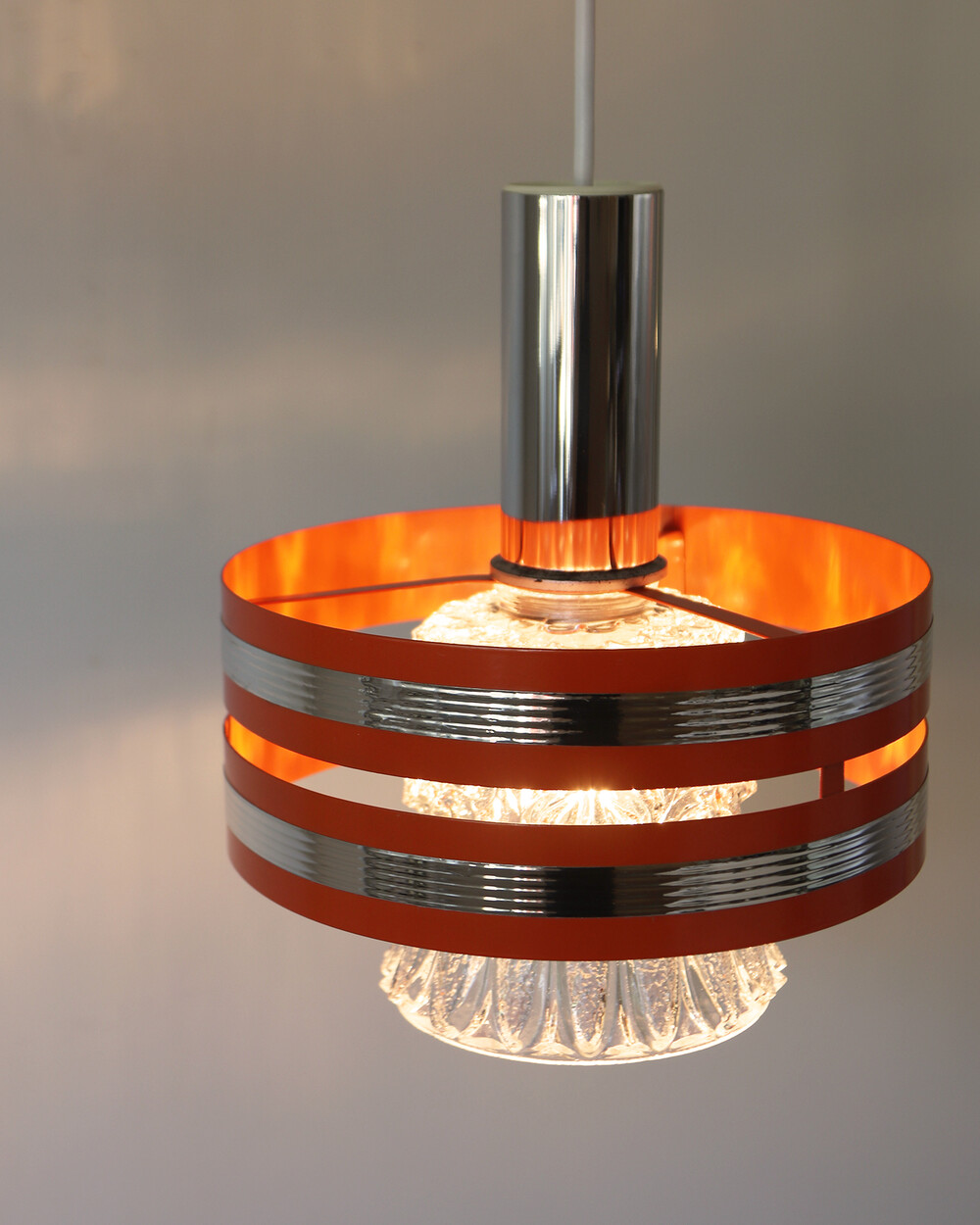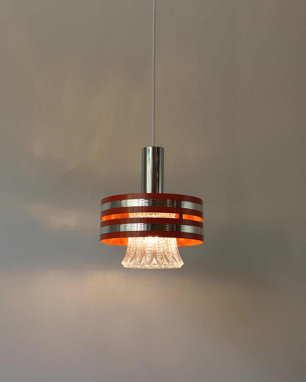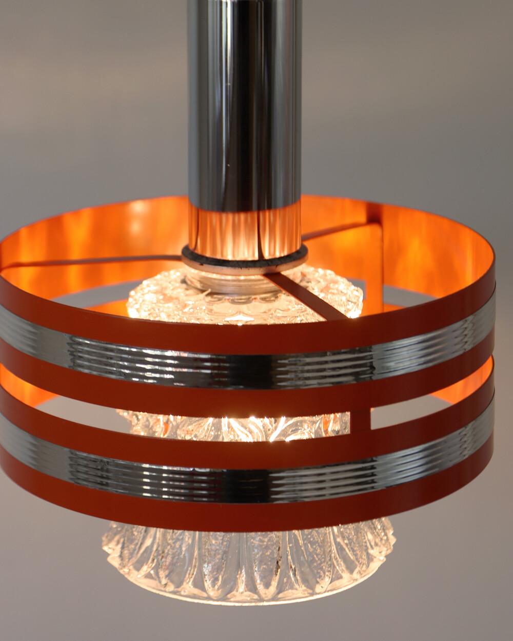 섬세한 입체 패턴의 크리스탈 글라스와 선명한 오렌지 컬러의 메탈 프레임이 조화를 이루는 1970년대 독일 펜던트 조명입니다.