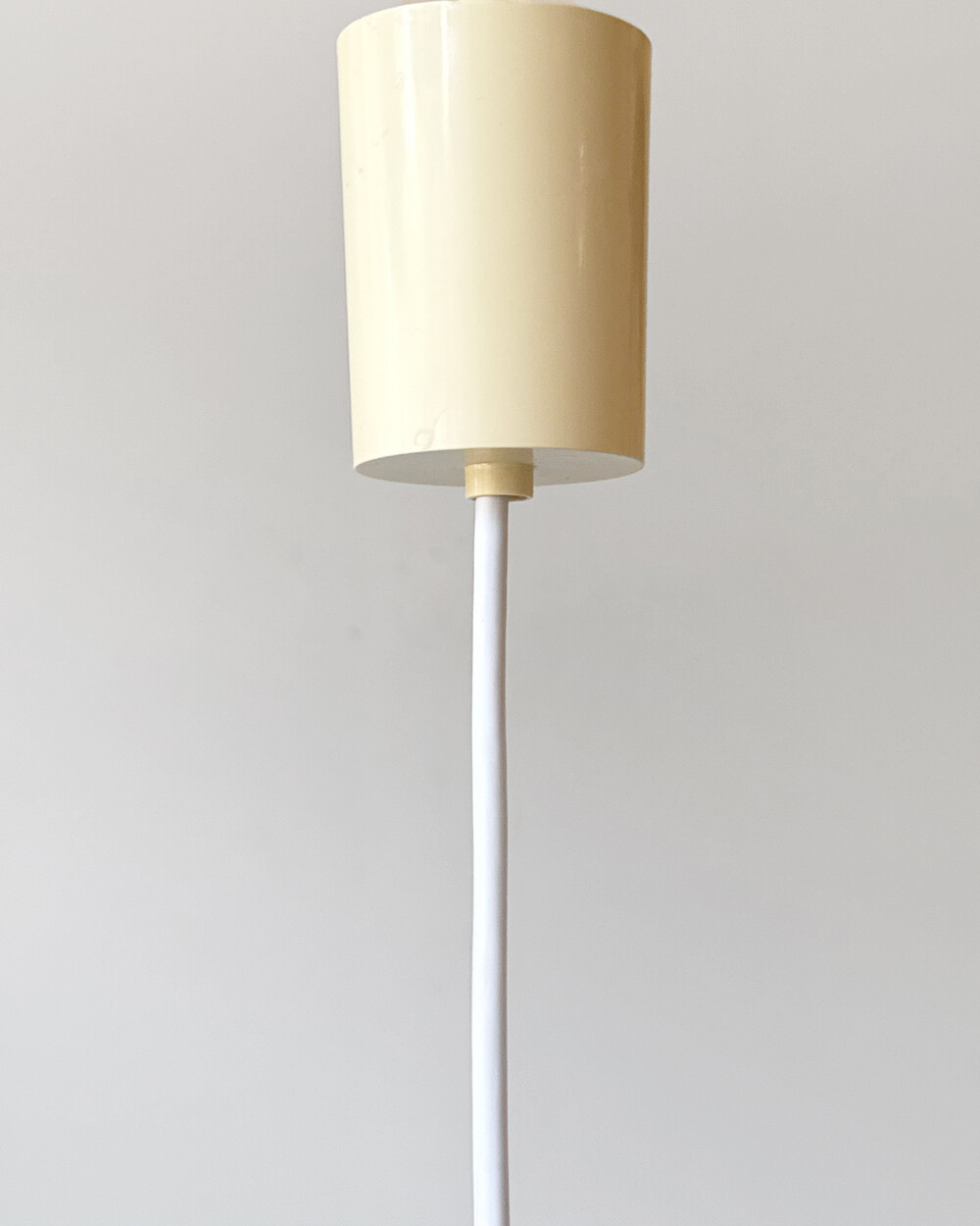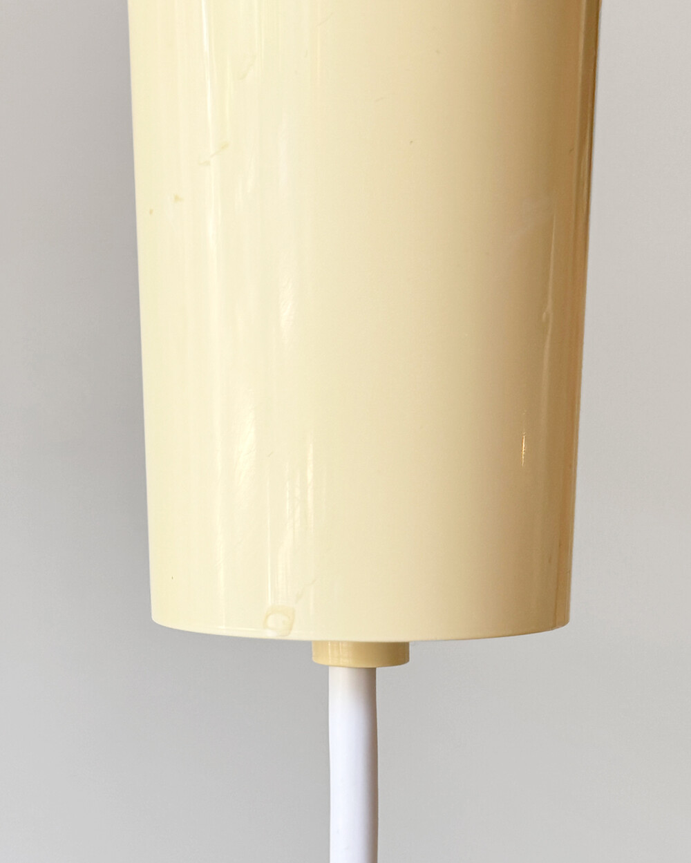 천장 전선 커버는 플라스틱 소재의 원통형으로, 옅은 노란빛으로 태닝된 컬러감입니다. 가까이에서 스크래치와 얼룩이 일부 보입니다.