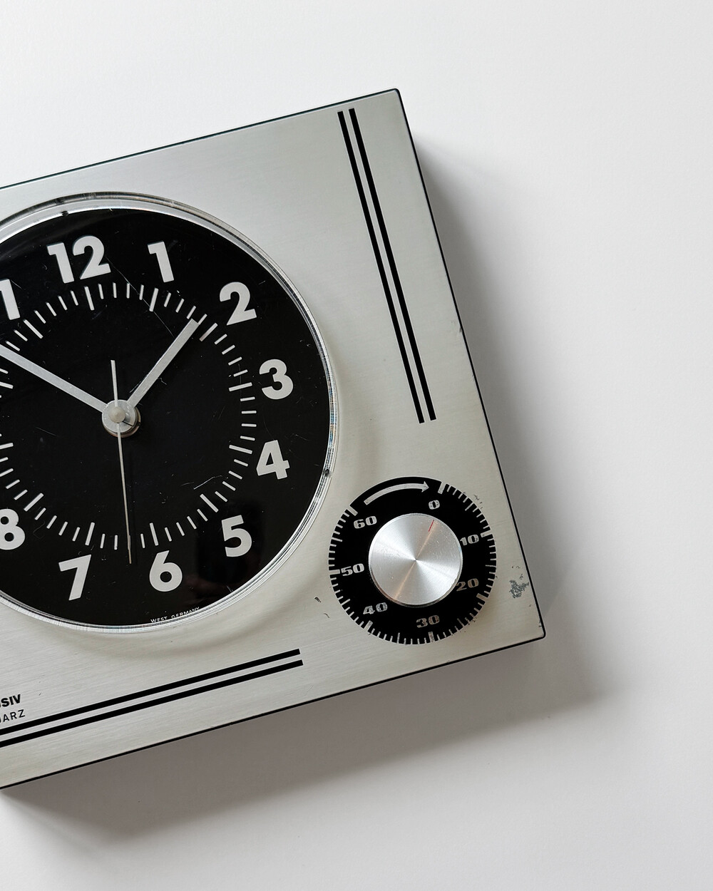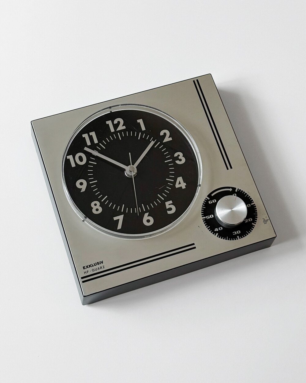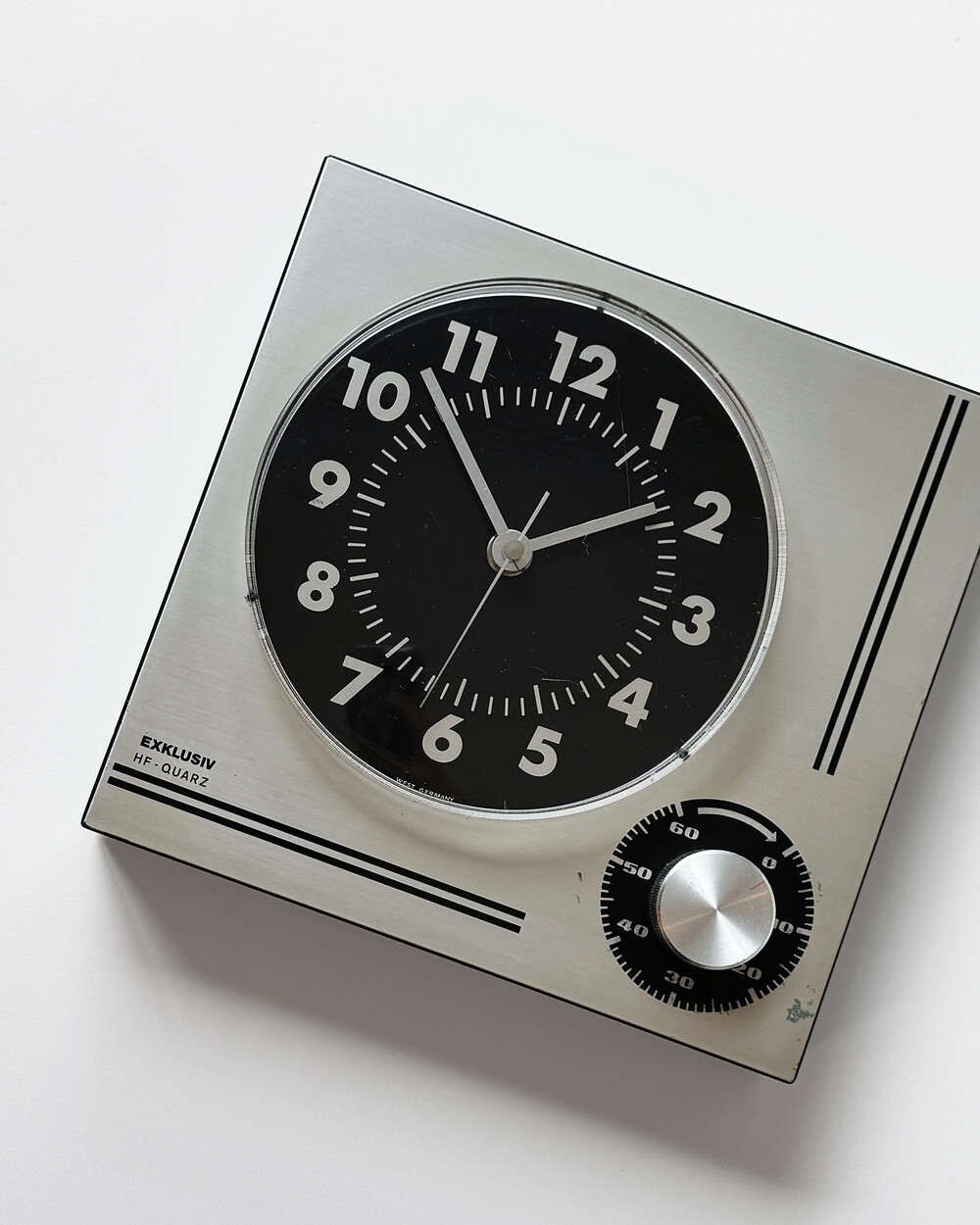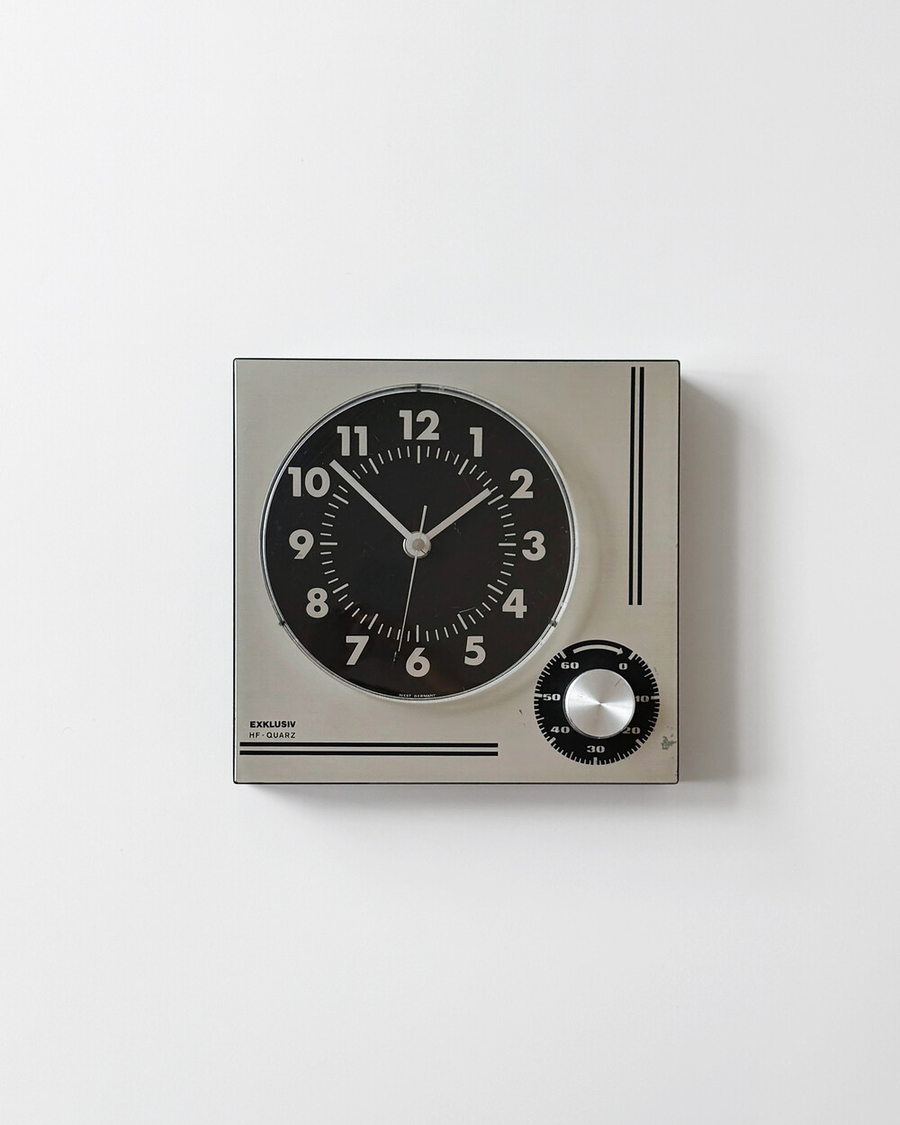 메탈릭 실버와 블랙이 어우러진 모던한 색감에, 미니멀한 디자인이 돋보이는 벽시계로 1970년대 후반 서독일에서 제작되었습니다. 블랙 라인 장식과 볼드한 폰트, 하단의 키친 타이머가 유니크한 매력을 공간에 더합니다.