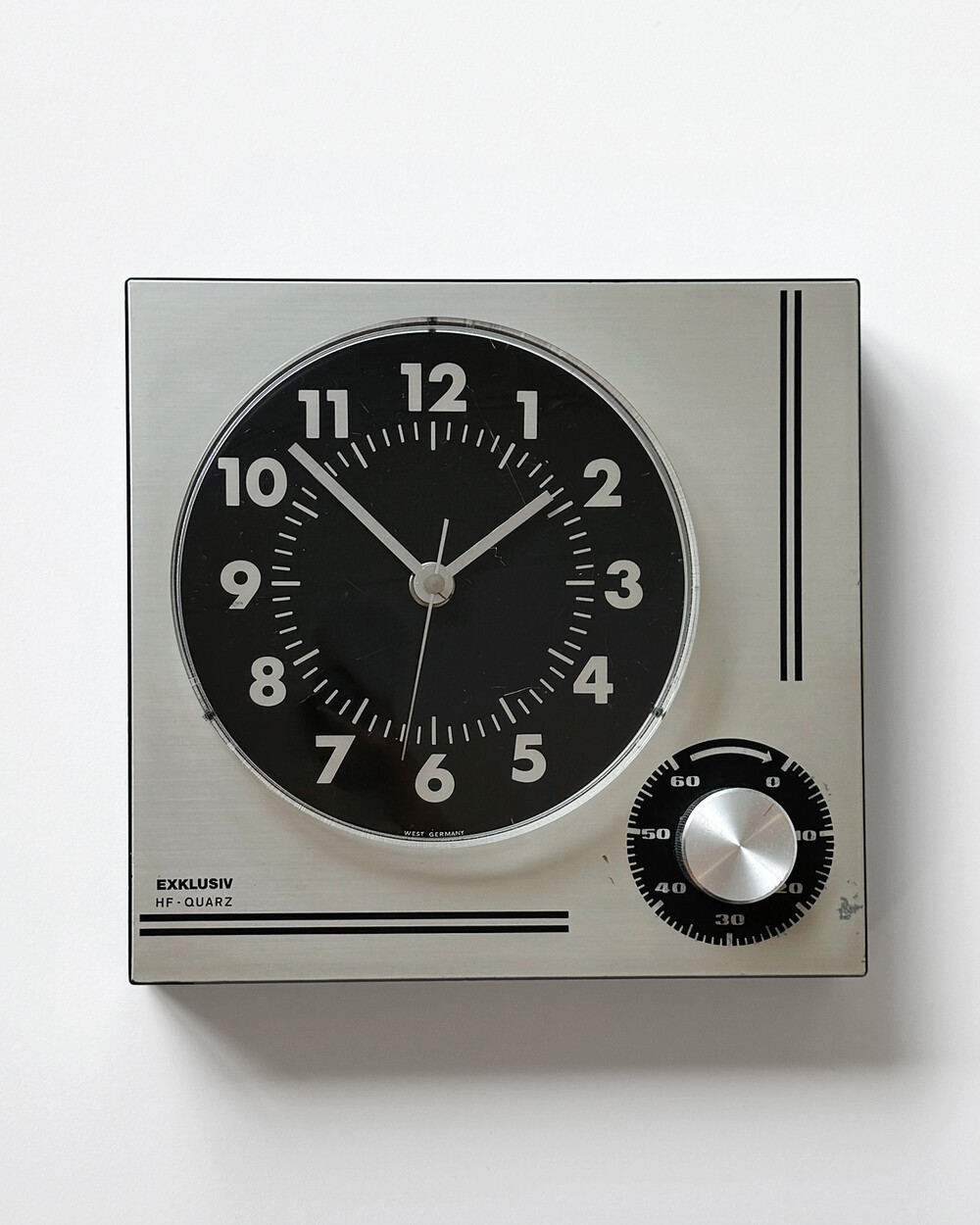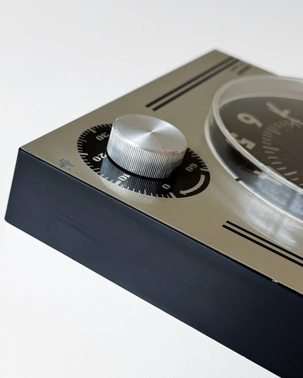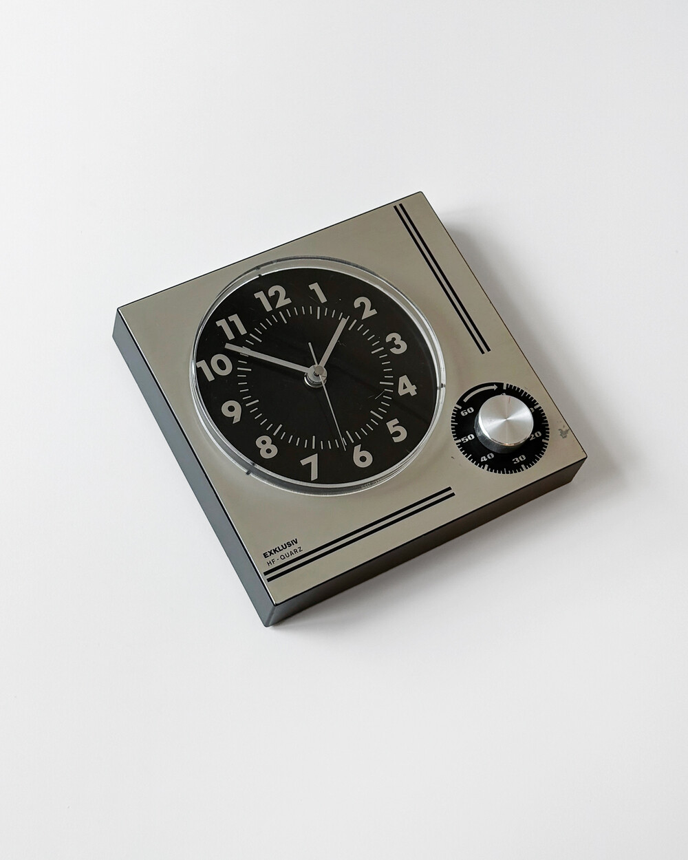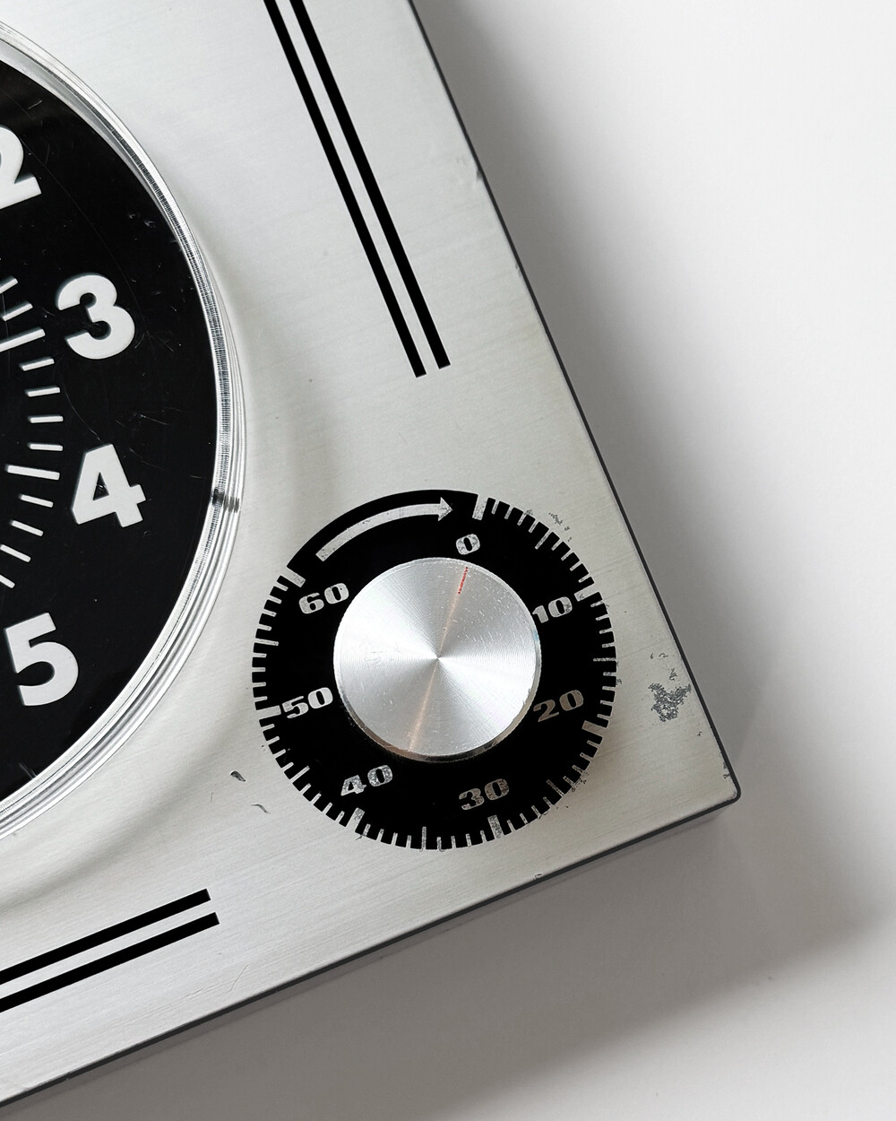 메탈릭 실버와 블랙이 어우러진 모던한 색감에, 미니멀한 디자인이 돋보이는 벽시계로 1970년대 후반 서독일에서 제작되었습니다. 블랙 라인 장식과 볼드한 폰트, 하단의 키친 타이머가 유니크한 매력을 공간에 더합니다.