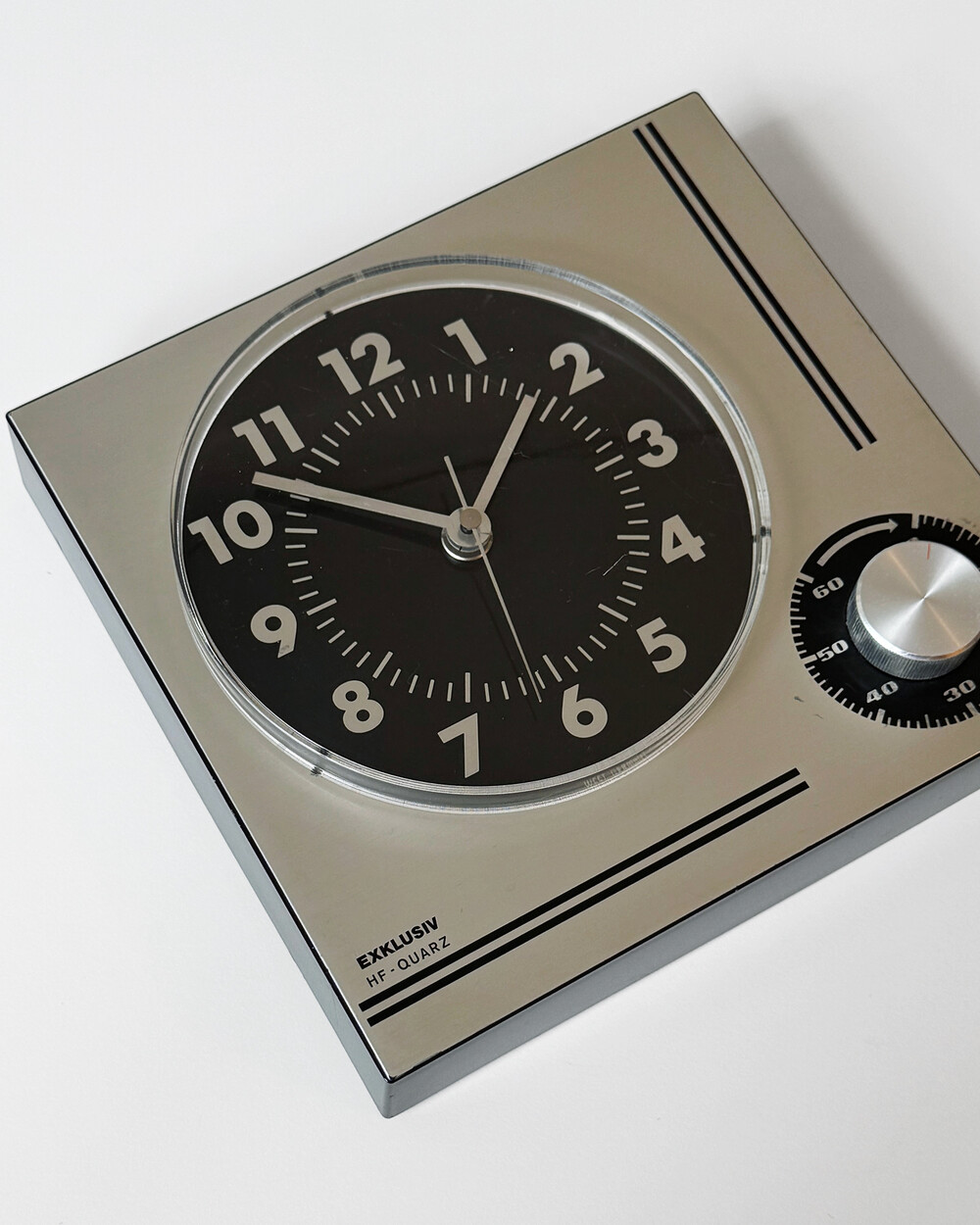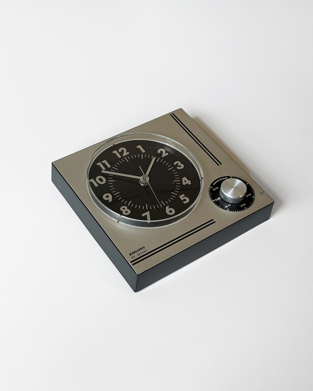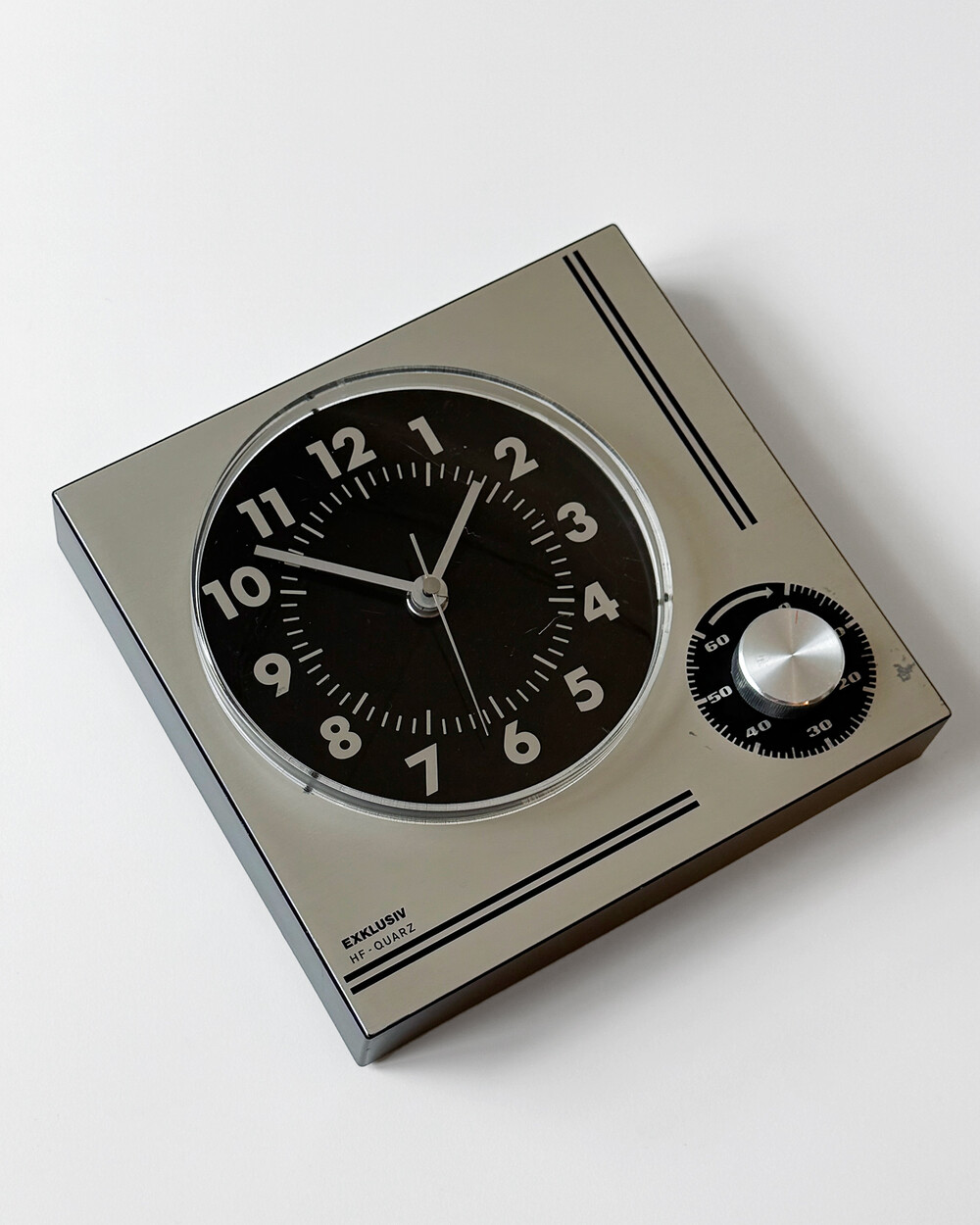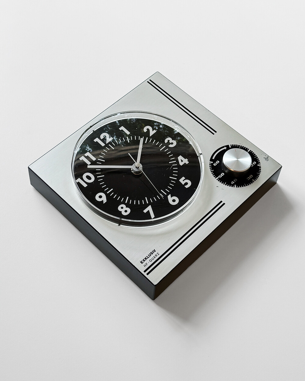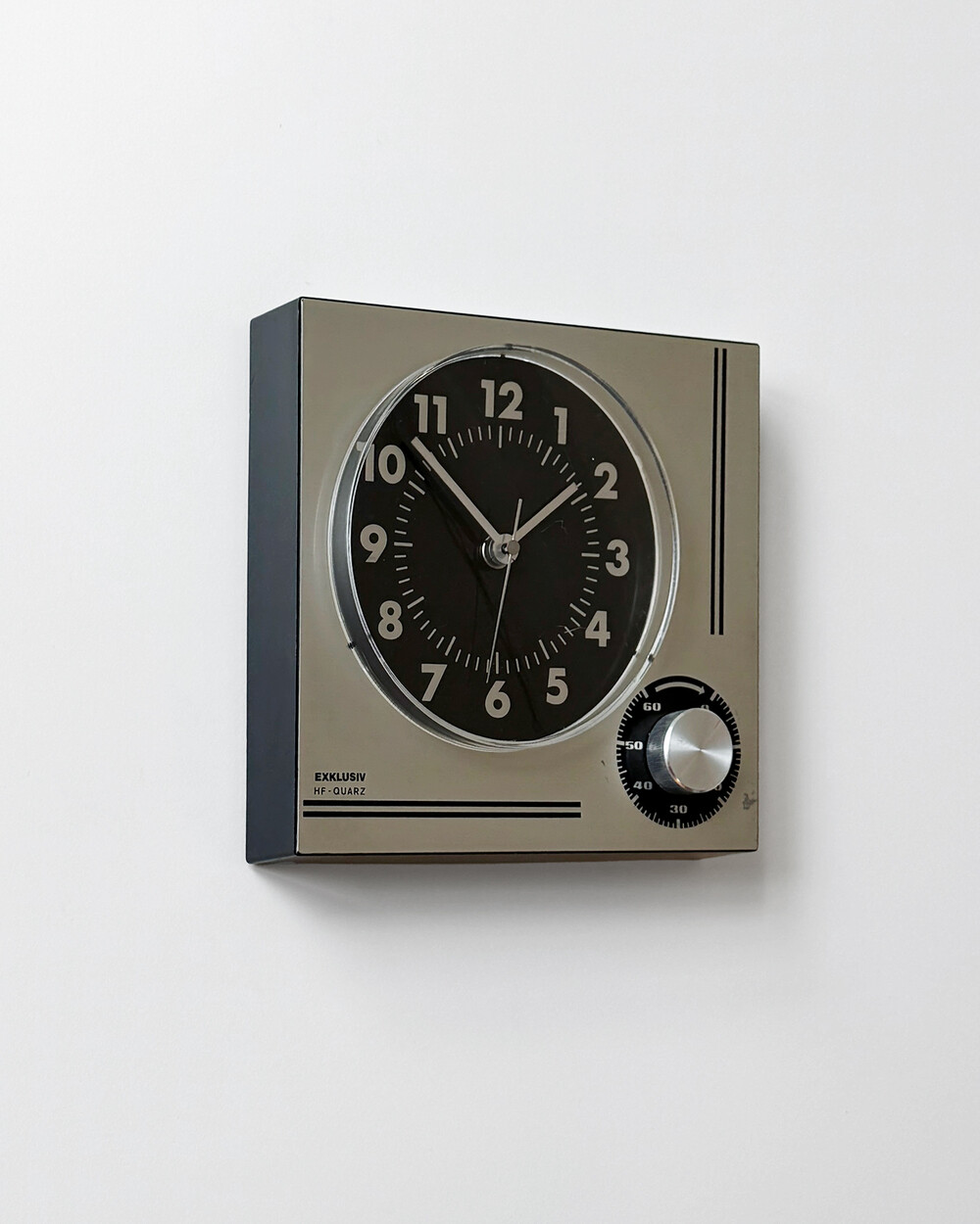 메탈릭 실버와 블랙이 어우러진 모던한 색감에, 미니멀한 디자인이 돋보이는 벽시계로 1970년대 후반 서독일에서 제작되었습니다. 블랙 라인 장식과 볼드한 폰트, 하단의 키친 타이머가 유니크한 매력을 공간에 더합니다.