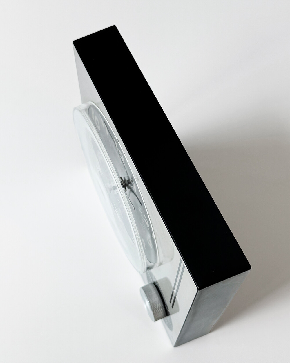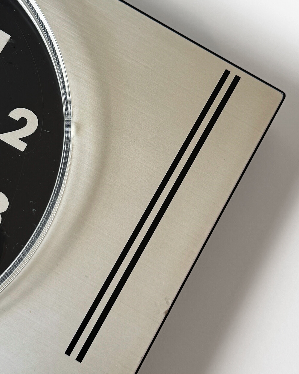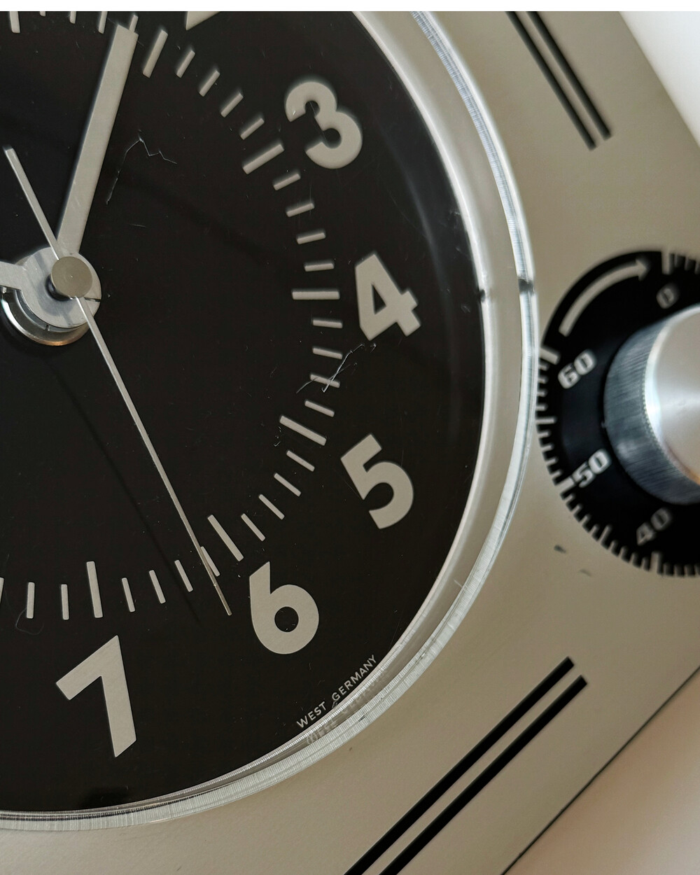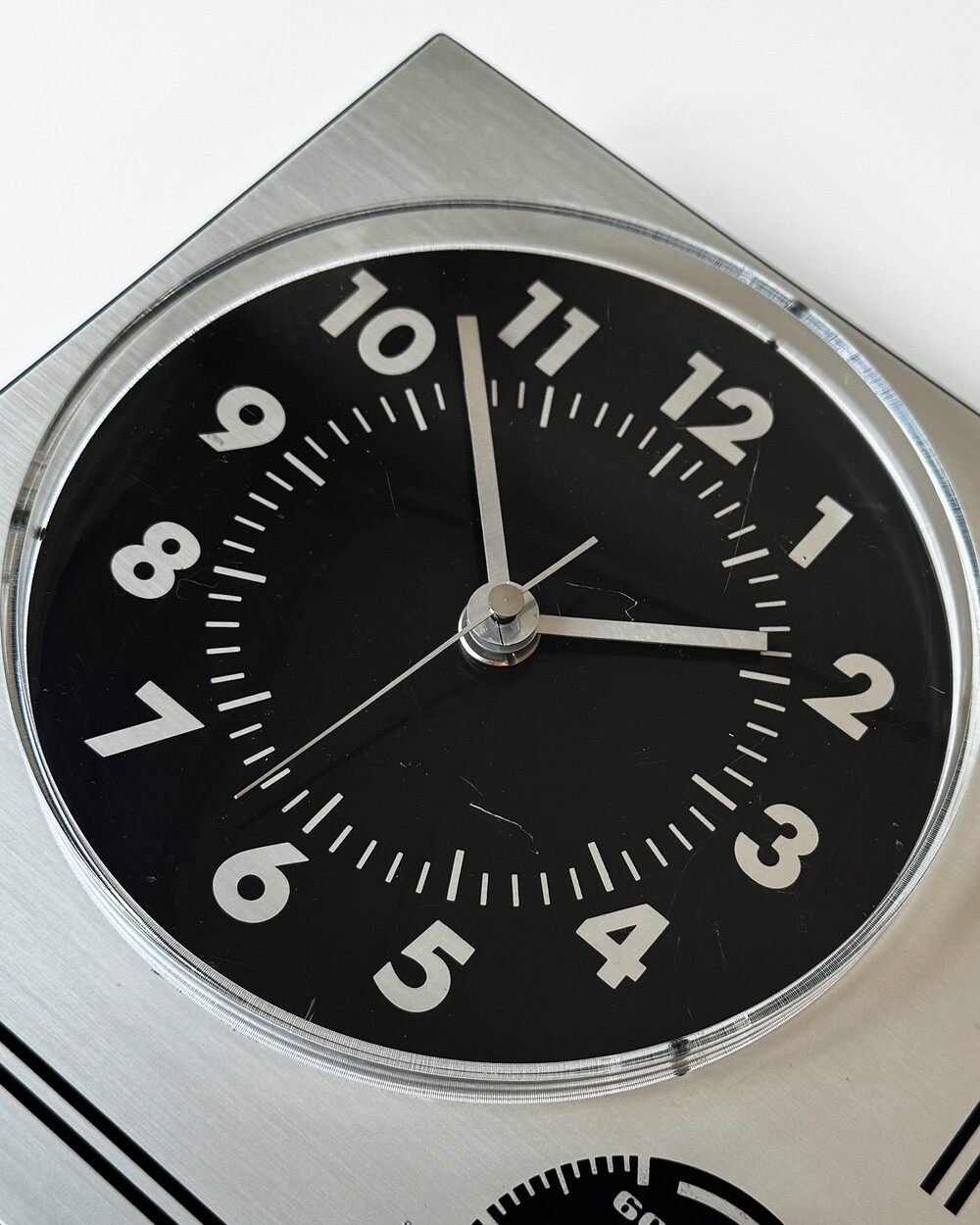 메탈릭 실버와 블랙이 어우러진 모던한 색감에, 미니멀한 디자인이 돋보이는 벽시계로 1970년대 후반 서독일에서 제작되었습니다. 블랙 라인 장식과 볼드한 폰트, 하단의 키친 타이머가 유니크한 매력을 공간에 더합니다.