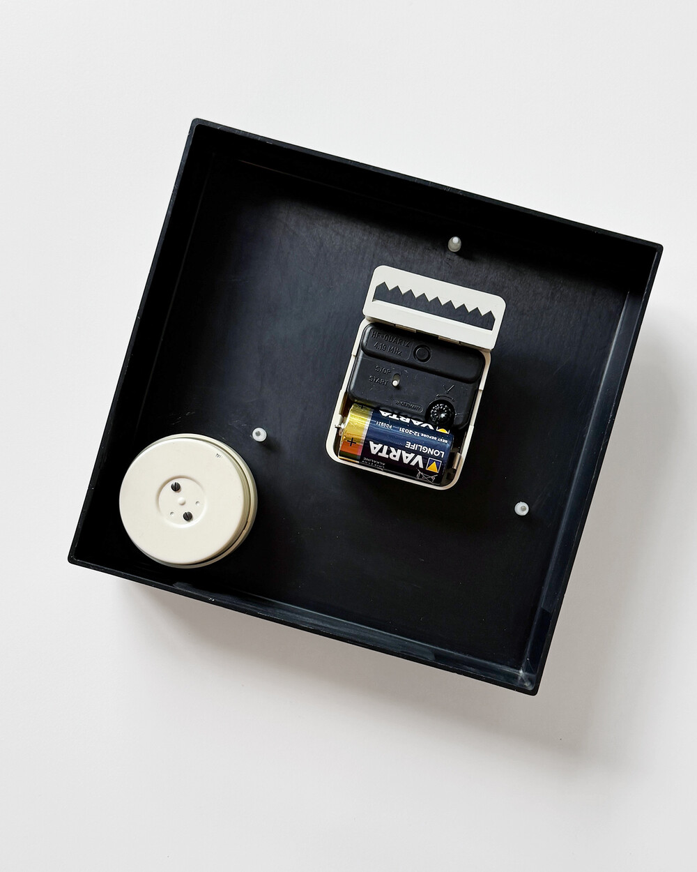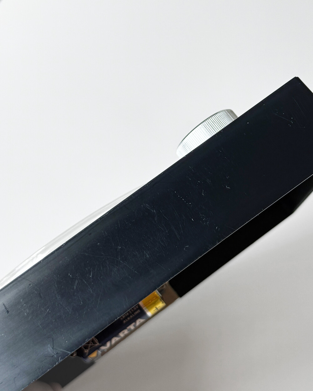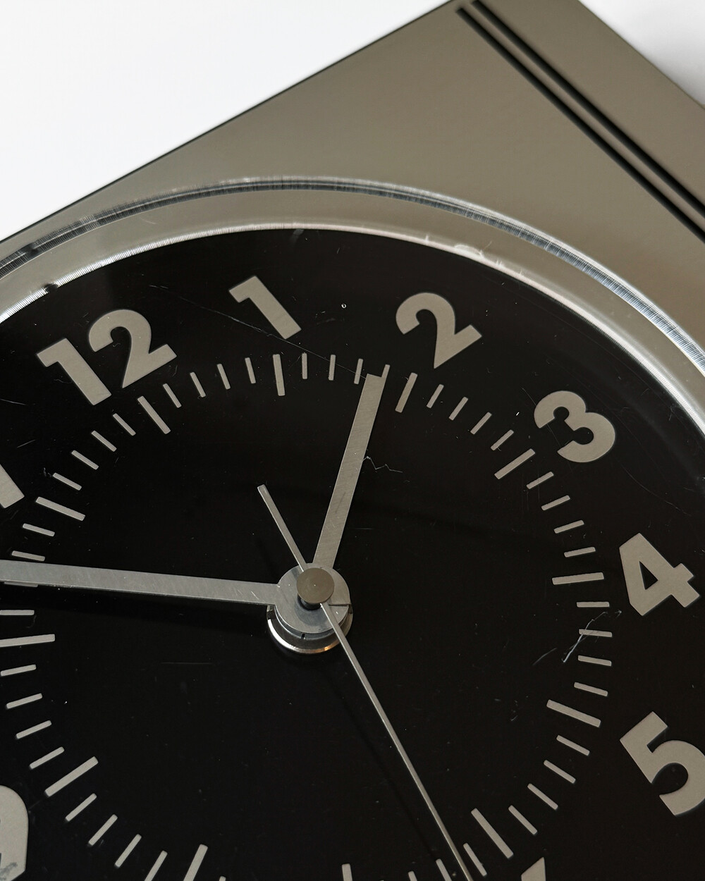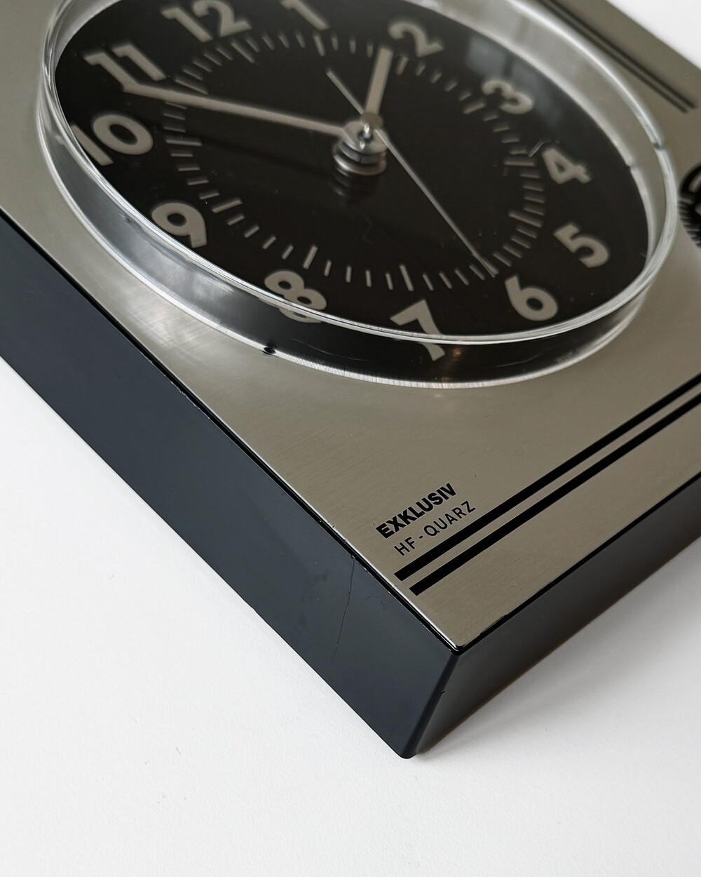 메탈릭 실버와 블랙이 어우러진 모던한 색감에, 미니멀한 디자인이 돋보이는 벽시계로 1970년대 후반 서독일에서 제작되었습니다. 블랙 라인 장식과 볼드한 폰트, 하단의 키친 타이머가 유니크한 매력을 공간에 더합니다.