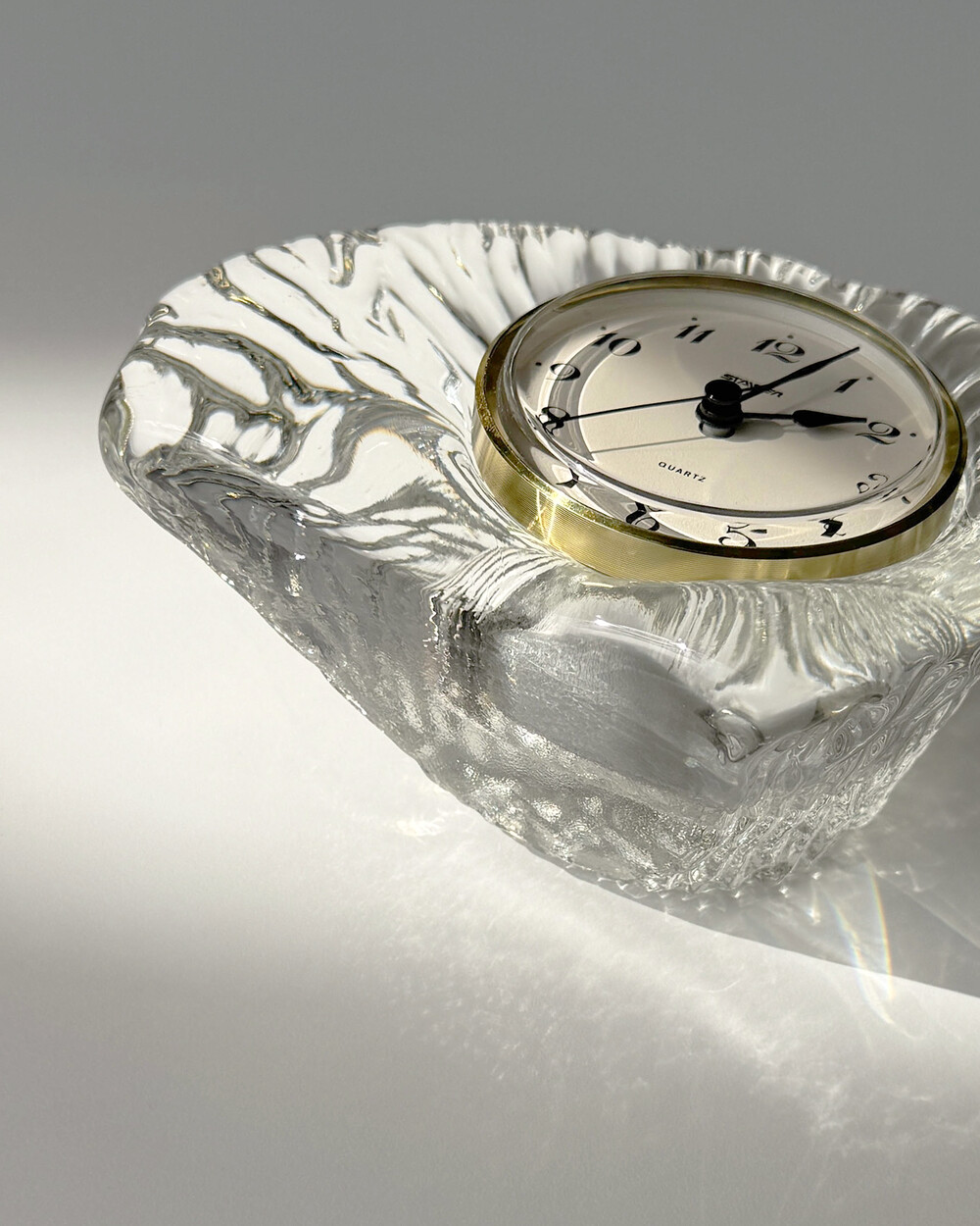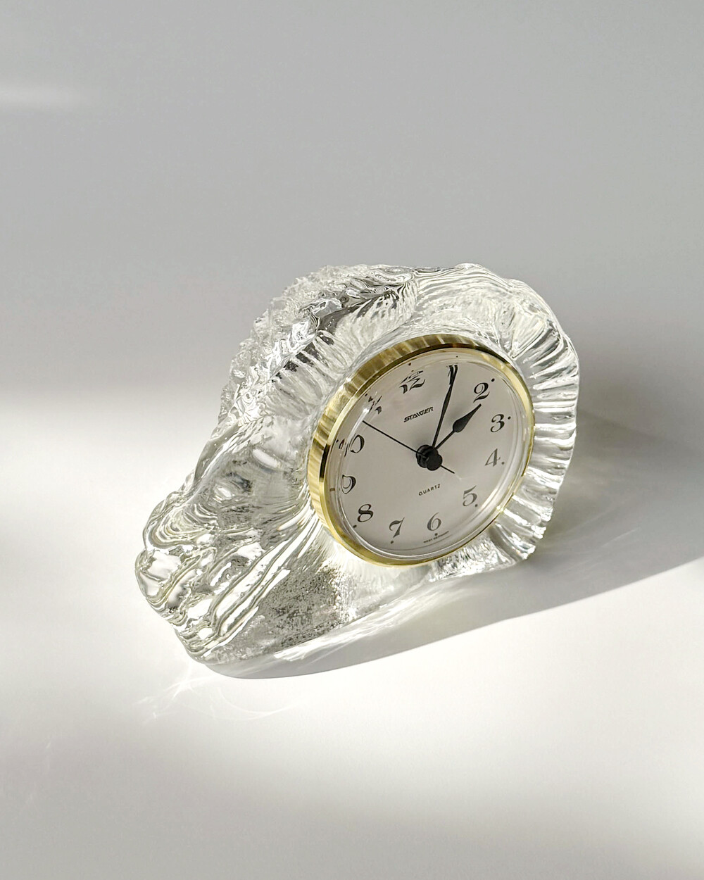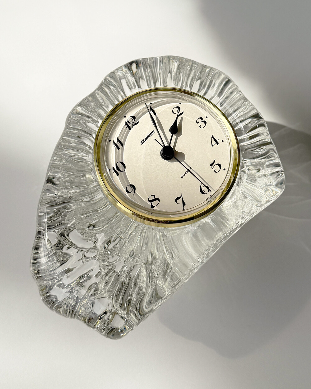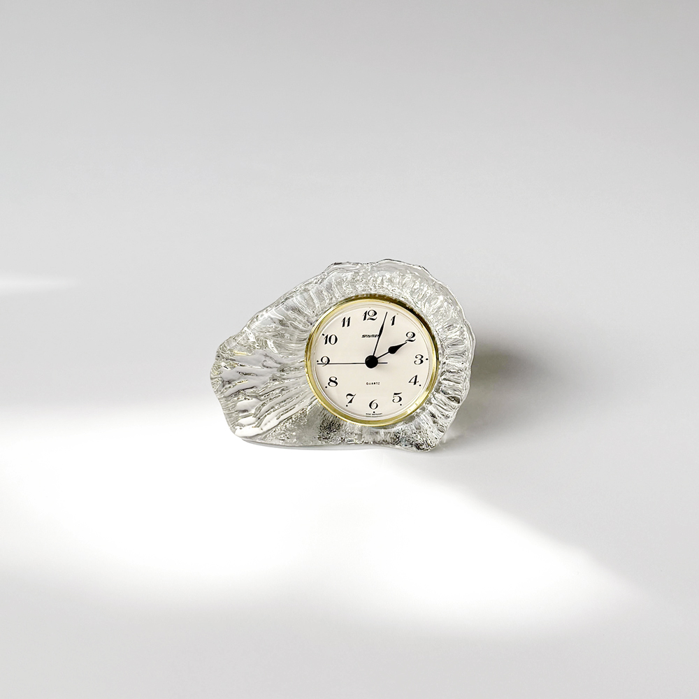 세밀하게 조각된 얼음을 연상시키는 크리스탈 탁상시계로, 1970년대 서독의 시계 브랜드 Staiger와 크리스탈 글라스 공방 Joska가 협업해 제작한 작품입니다.