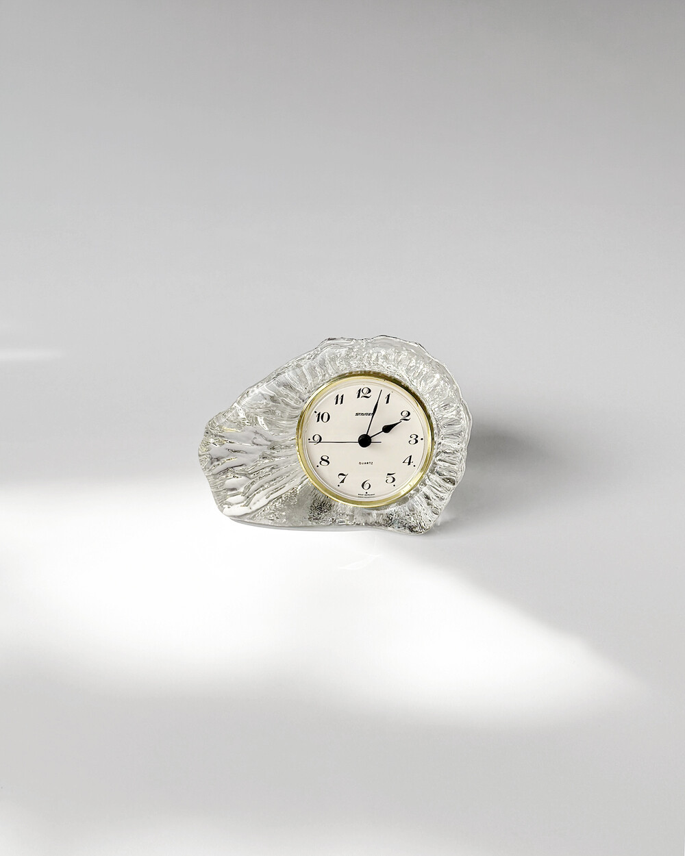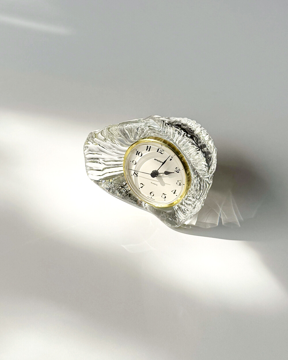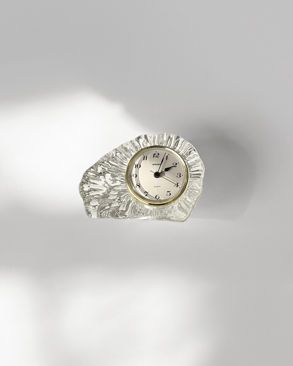 세밀하게 조각된 얼음을 연상시키는 크리스탈 탁상시계로, 1970년대 서독의 시계 브랜드 Staiger와 크리스탈 글라스 공방 Joska가 협업해 제작한 작품입니다.