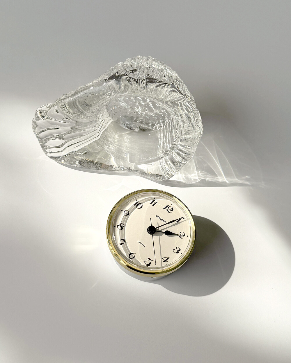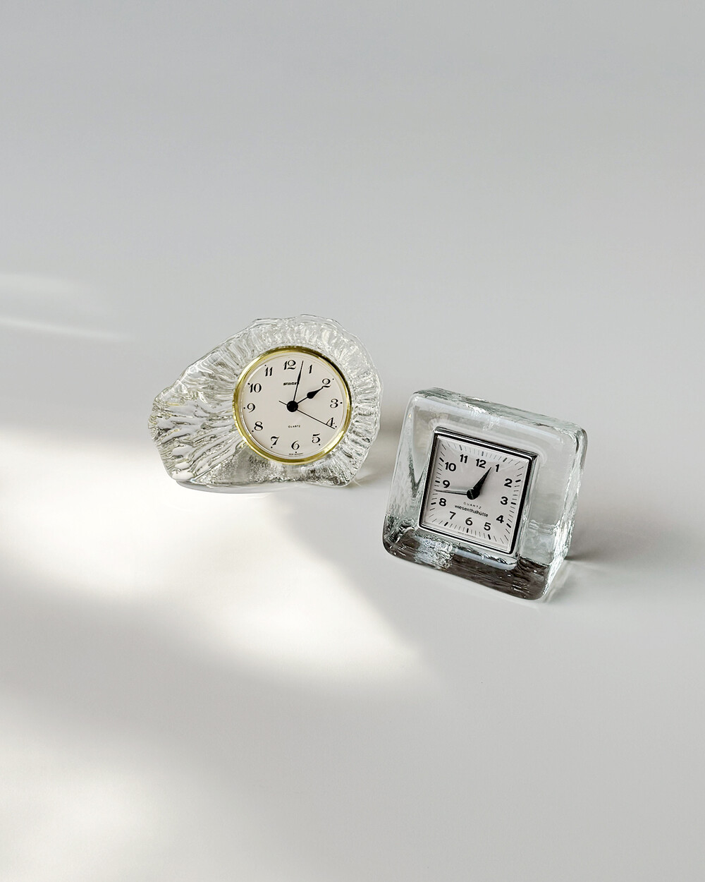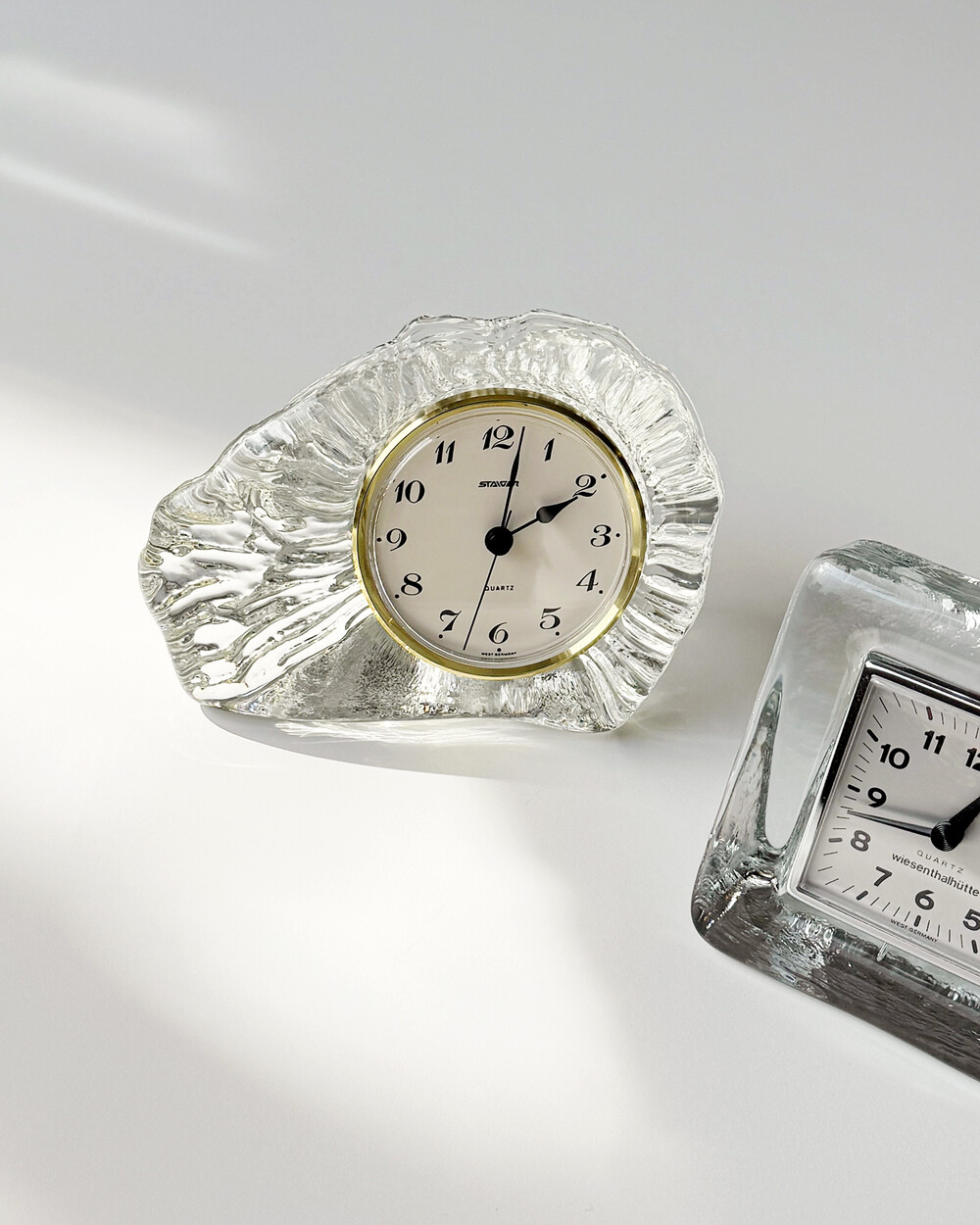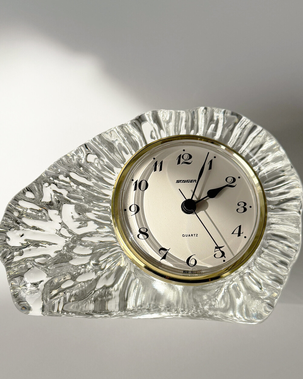 세밀하게 조각된 얼음을 연상시키는 크리스탈 탁상시계로, 1970년대 서독의 시계 브랜드 Staiger와 크리스탈 글라스 공방 Joska가 협업해 제작한 작품입니다.