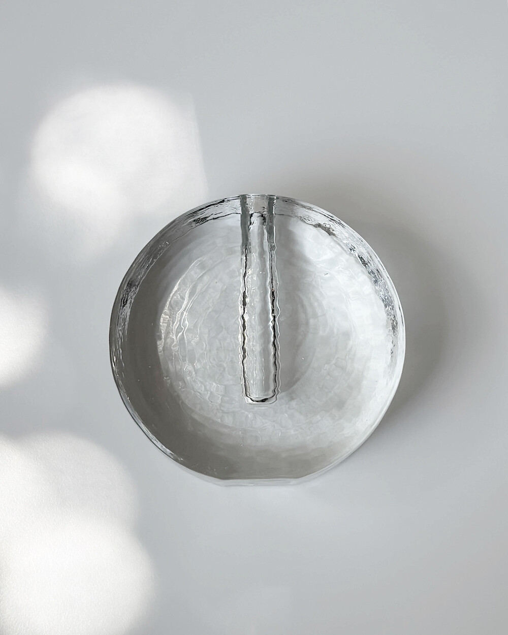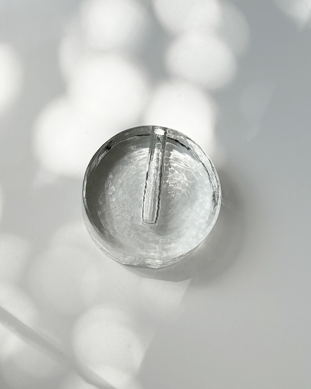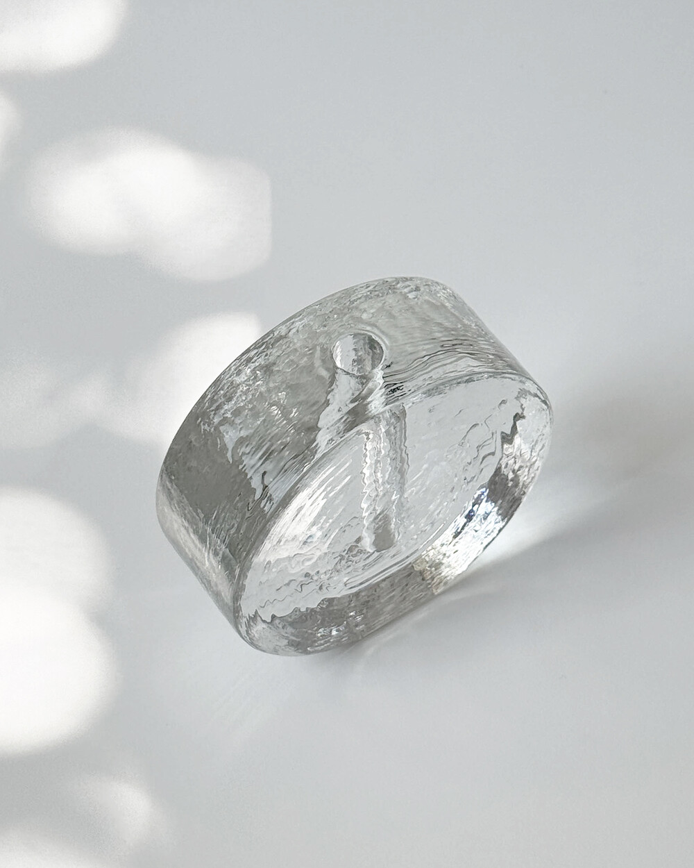 수작업으로 만들어진 글라스 오브제입니다. 기포, 유리 주름 등 제작과정에서 생기는 흔적이 일부 있으며, 가까이에서 보이는 옅은 세월감이 있습니다.