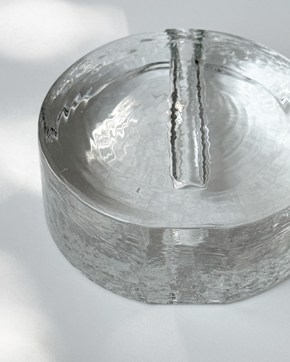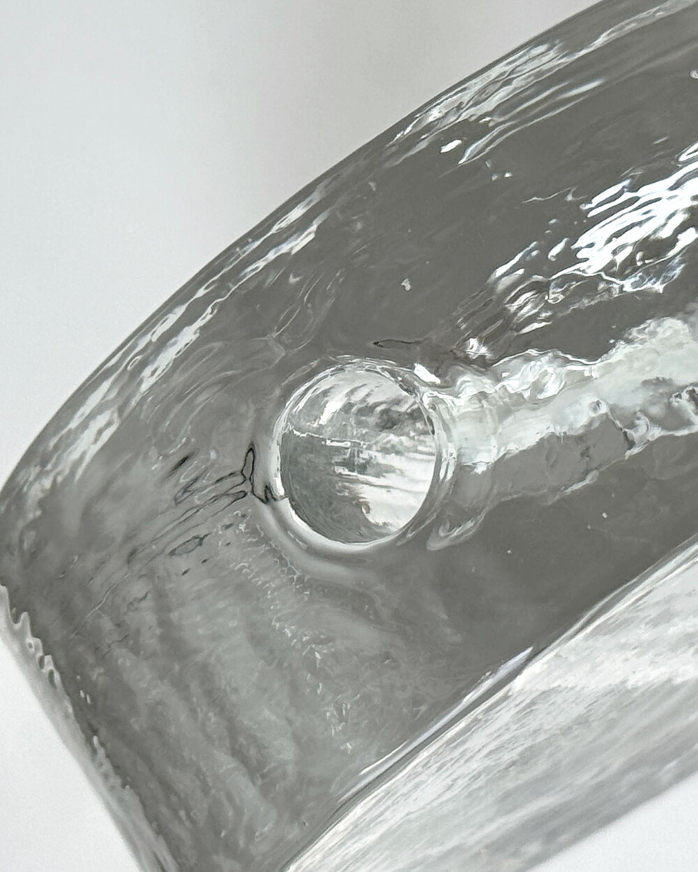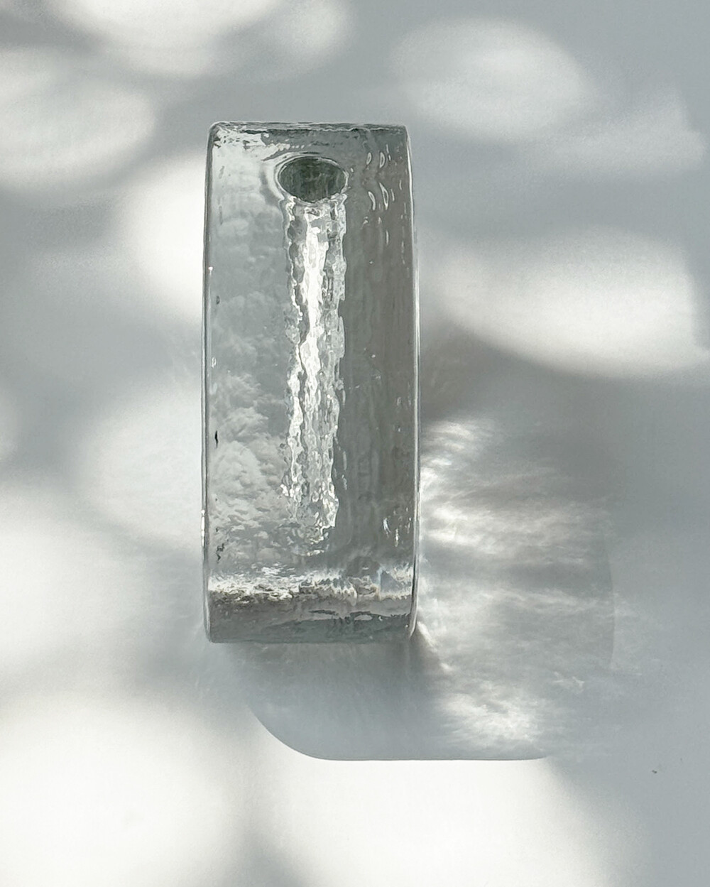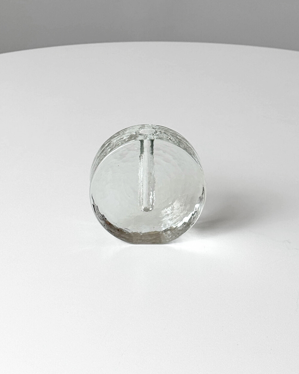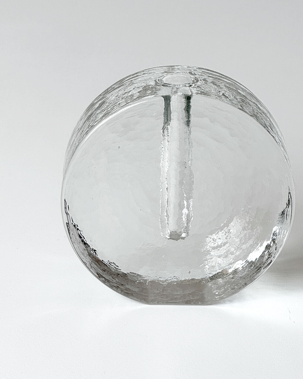 절제된 구형의 크리스탈 블록에 중앙 단일 홀을 더한 1970년대 서독일 Wiesenthalhütte 화병입니다. 해머드 텍스처처럼 잔잔하게 흐르는 질감이 담겨 있어, 빛이 닿을 때 표면에서 부드럽게 굴절되며 깊이감을 만들어냅니다.