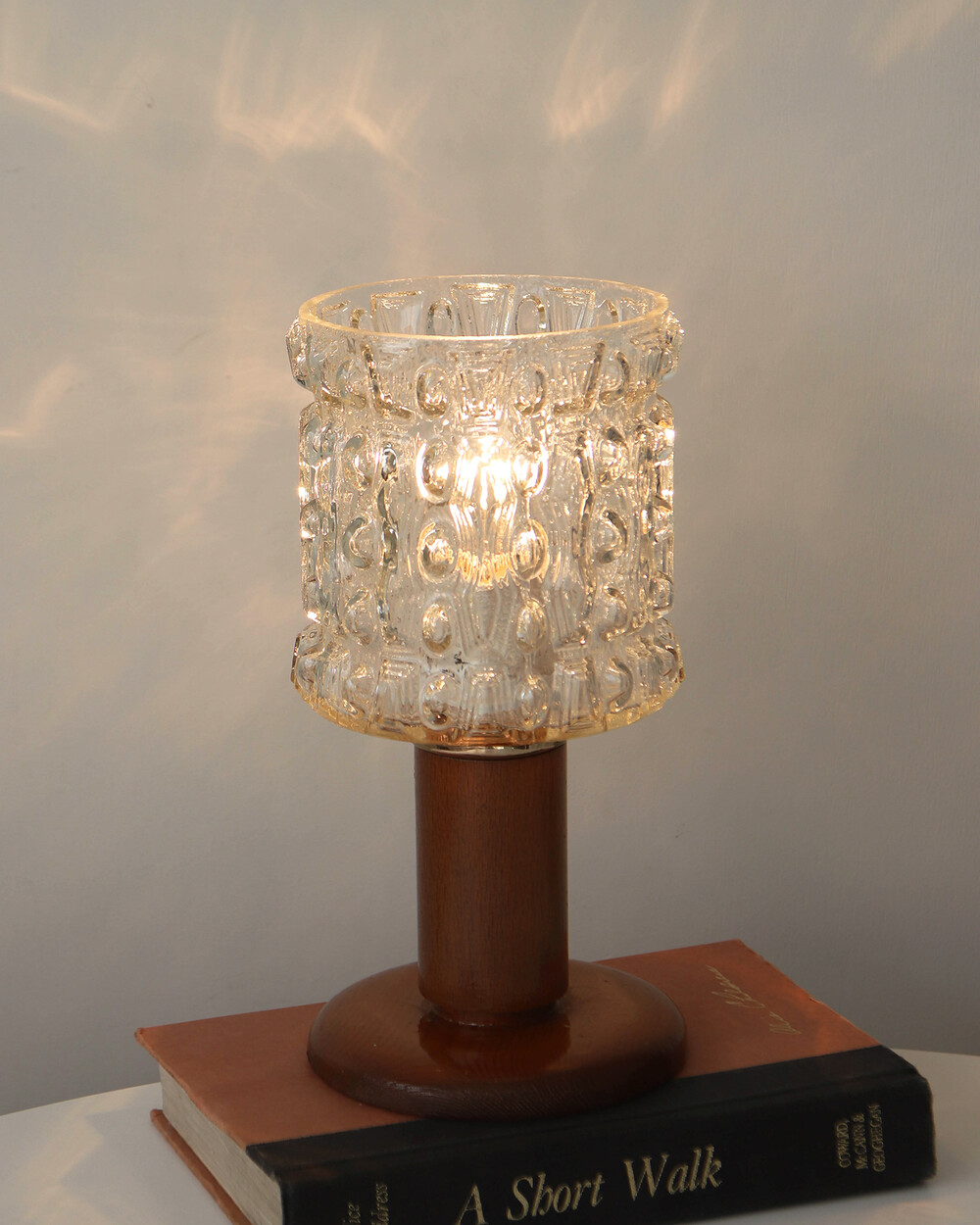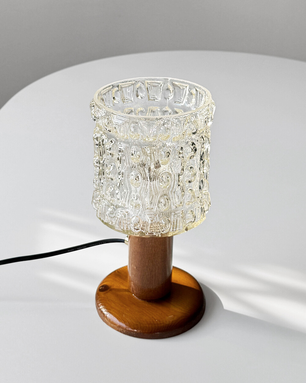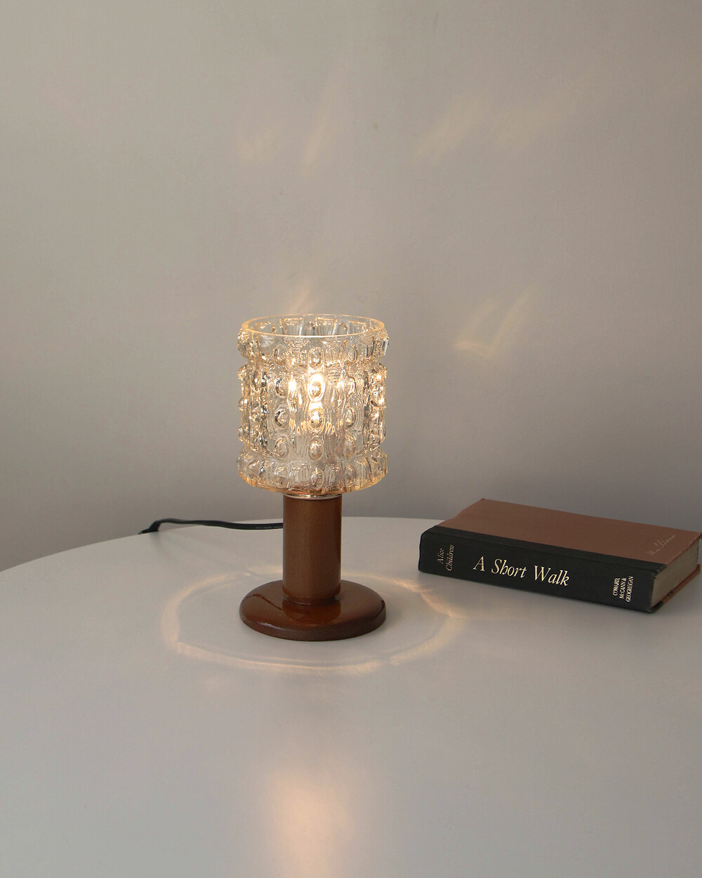 입체적인 패턴의 투명한 글라스 셰이드와 단정한 원형 실루엣의 우드 베이스로 이루어진 테이블 램프입니다. 키친, 침실에서 아늑함을 더해줄 무드등으로 추천 드리며, 점등 시 글라스의 굴곡을 따라 섬세하게 산란되는 빛을 감상할 수 있습니다.