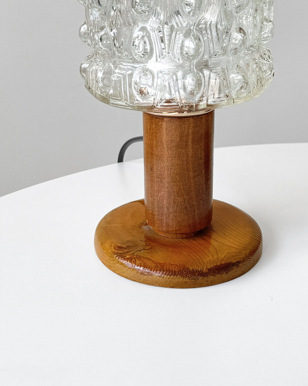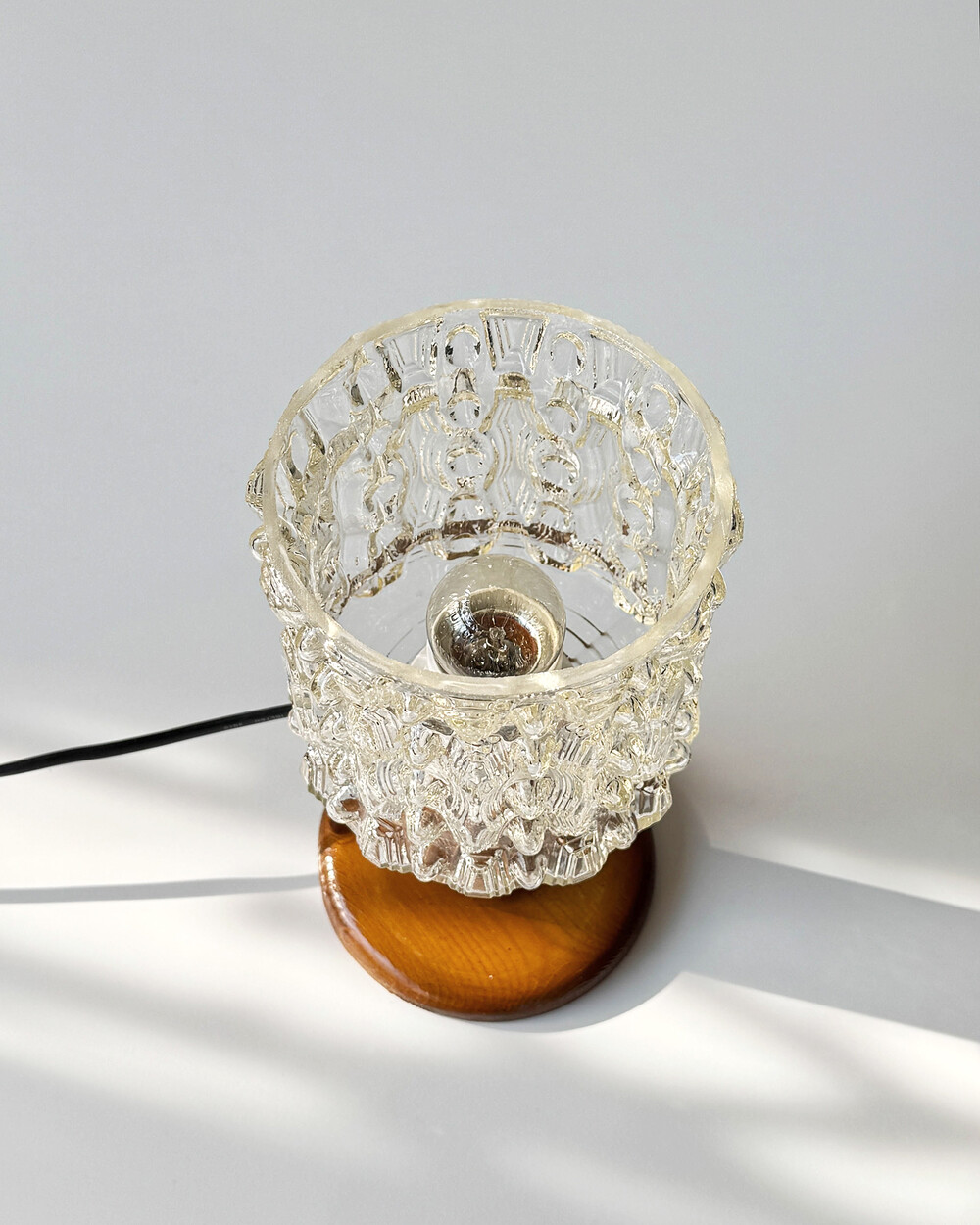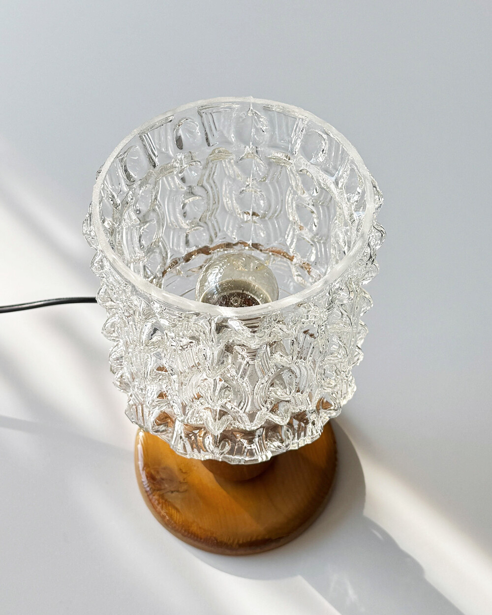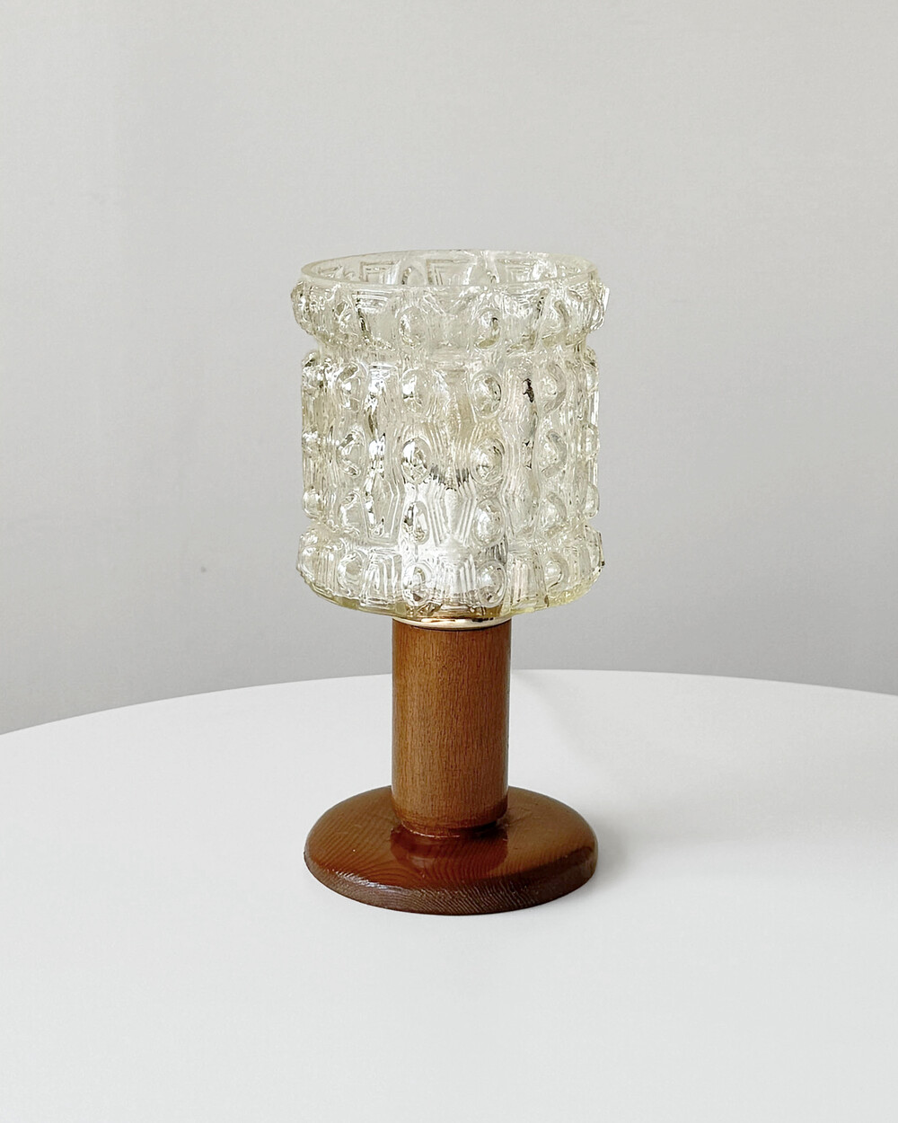 입체적인 패턴의 투명한 글라스 셰이드와 단정한 원형 실루엣의 우드 베이스로 이루어진 테이블 램프입니다. 키친, 침실에서 아늑함을 더해줄 무드등으로 추천 드리며, 점등 시 글라스의 굴곡을 따라 섬세하게 산란되는 빛을 감상할 수 있습니다.