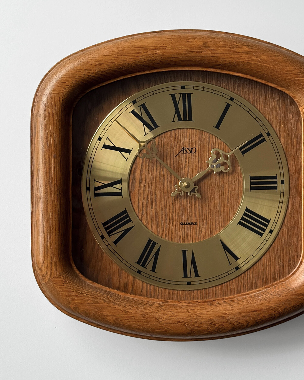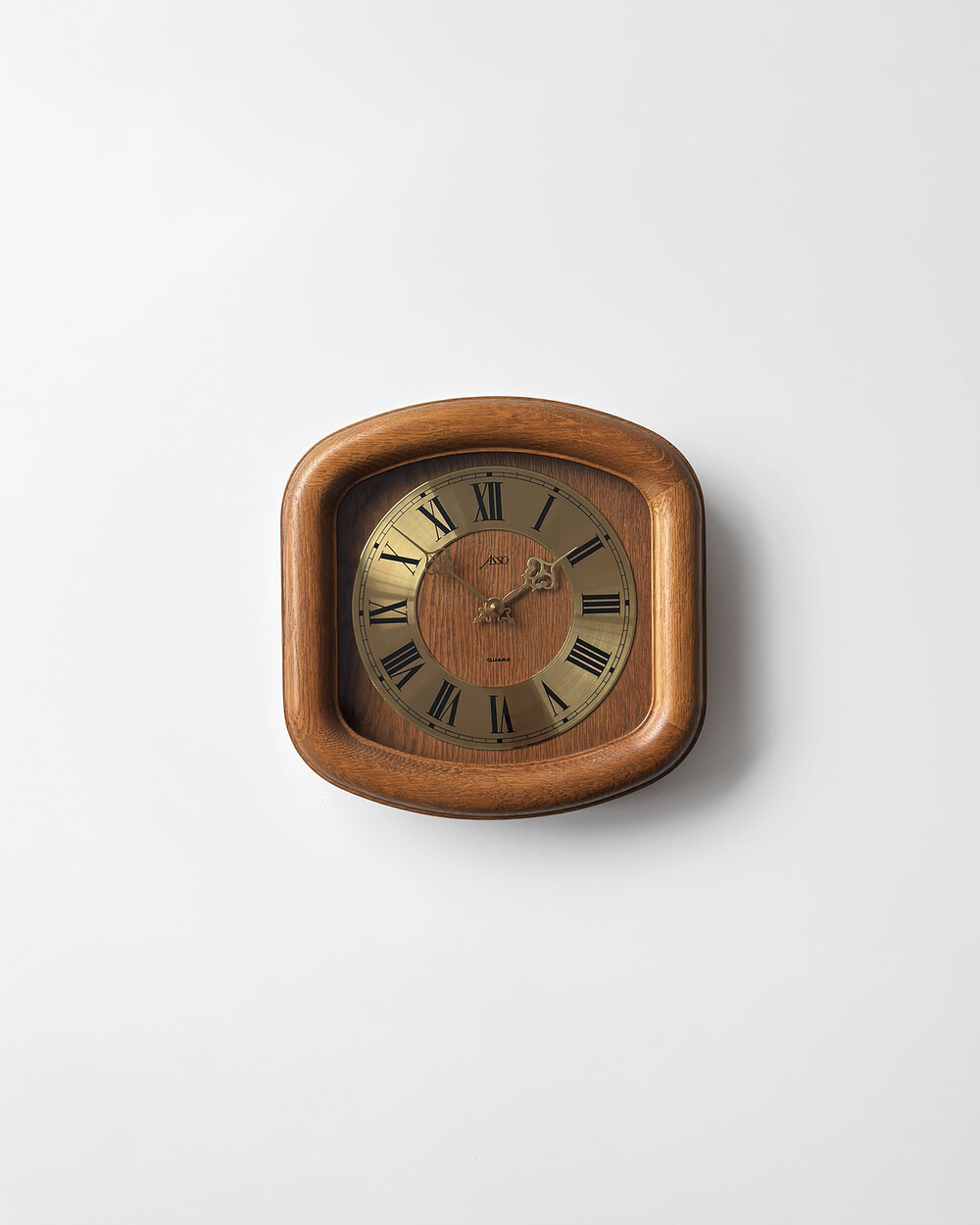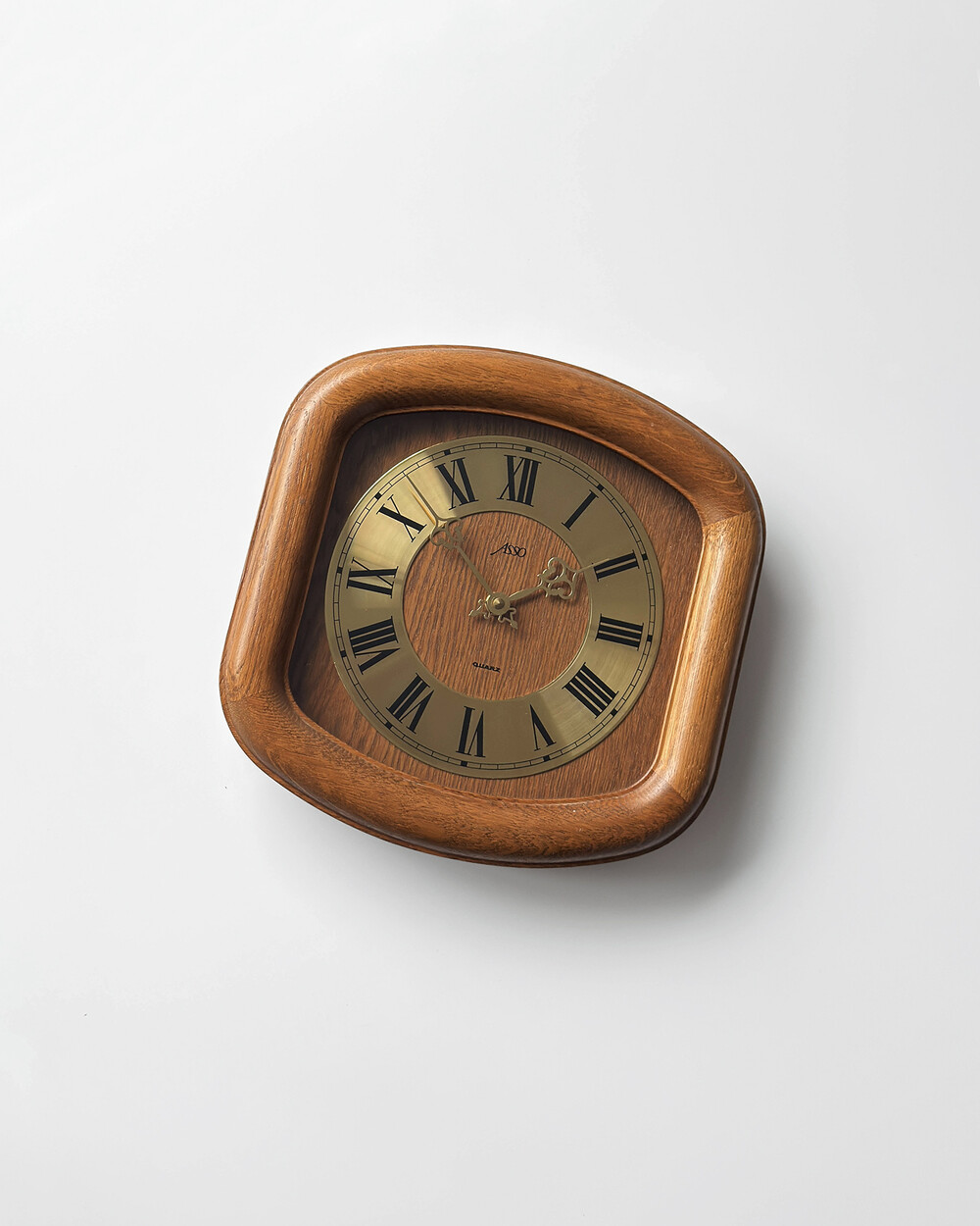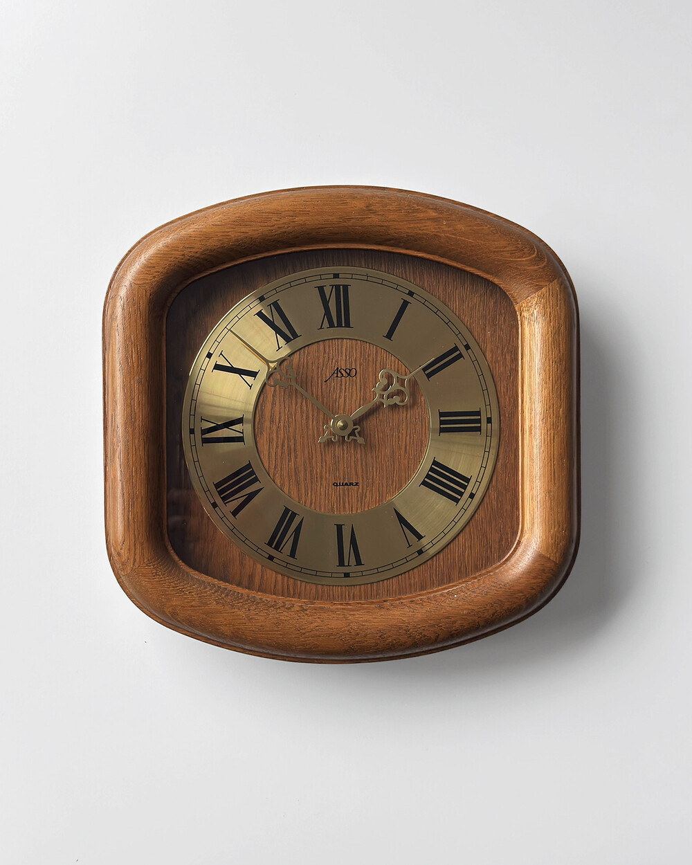 클래식한 아름다움을 지닌 브라운 우드 프레임과 브라스 메탈 다이얼이 어우러진 1970년대 독일의 시계회사 ASSO의 벽시계입니다. 부드러운 곡선으로 이어지는 담대한 실루엣과 시간이 깊이가 느껴지는 베이스에 장식적인 로만 인덱스와 핸즈가 더해져 시대 특유의 차분하고 고전적인 분위기를 공간에 더합니다.