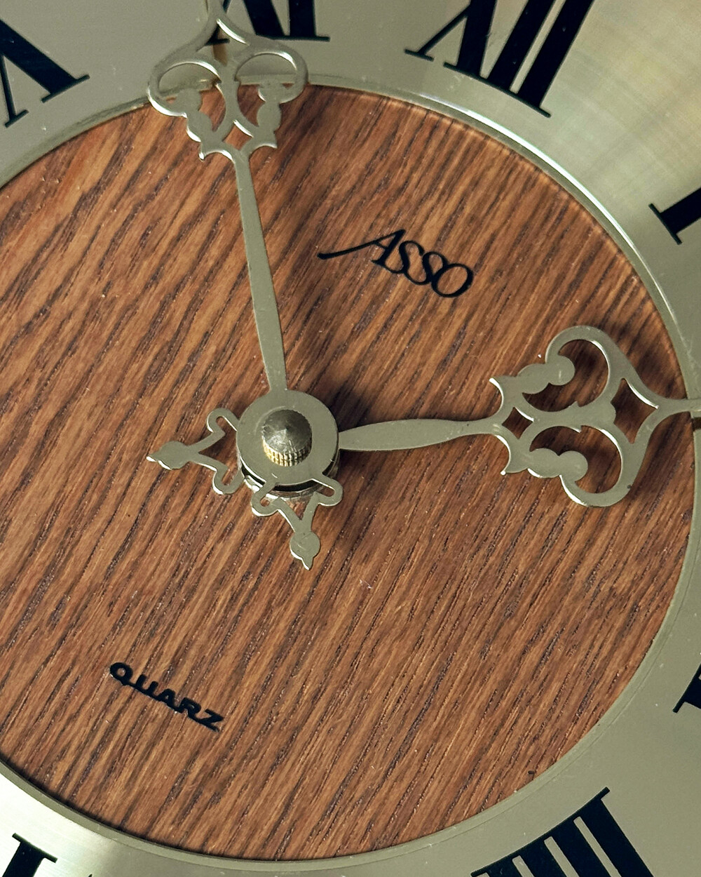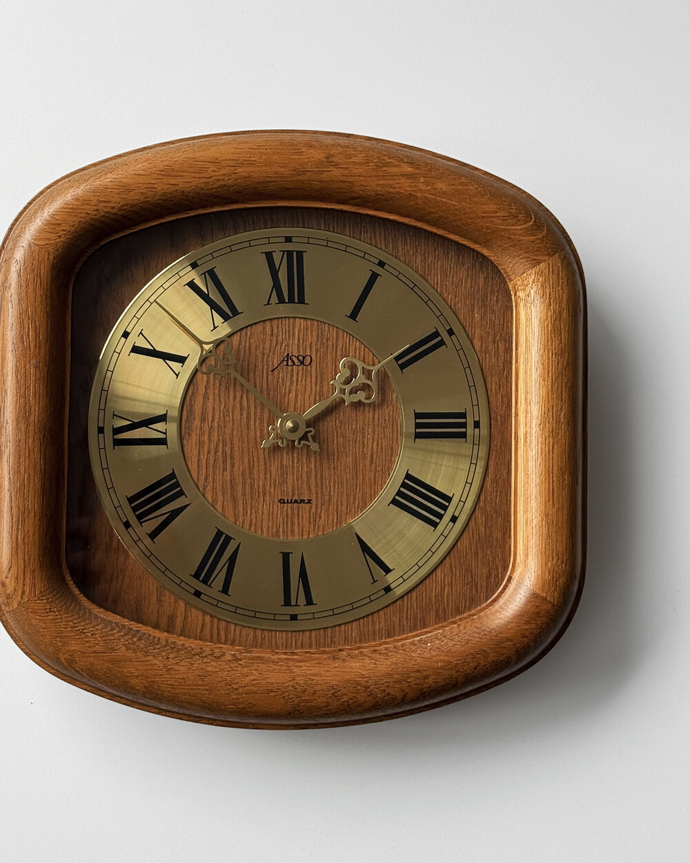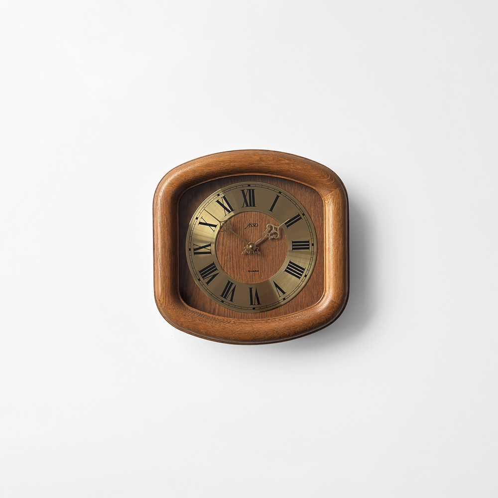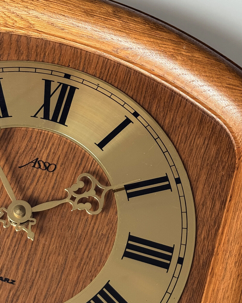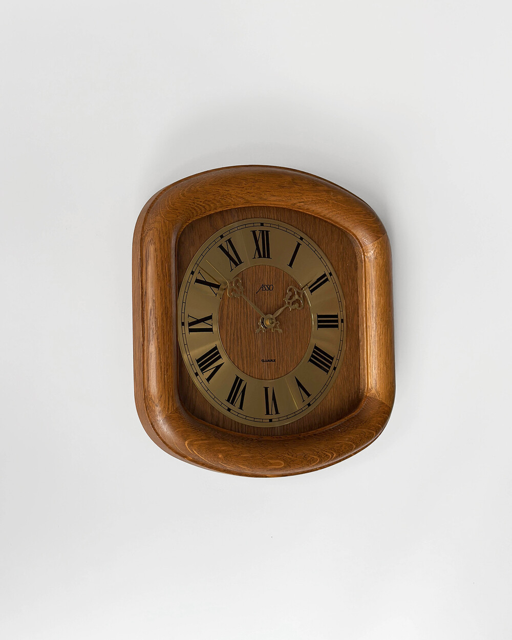 클래식한 아름다움을 지닌 브라운 우드 프레임과 브라스 메탈 다이얼이 어우러진 1970년대 독일의 시계회사 ASSO의 벽시계입니다. 부드러운 곡선으로 이어지는 담대한 실루엣과 시간이 깊이가 느껴지는 베이스에 장식적인 로만 인덱스와 핸즈가 더해져 시대 특유의 차분하고 고전적인 분위기를 공간에 더합니다.