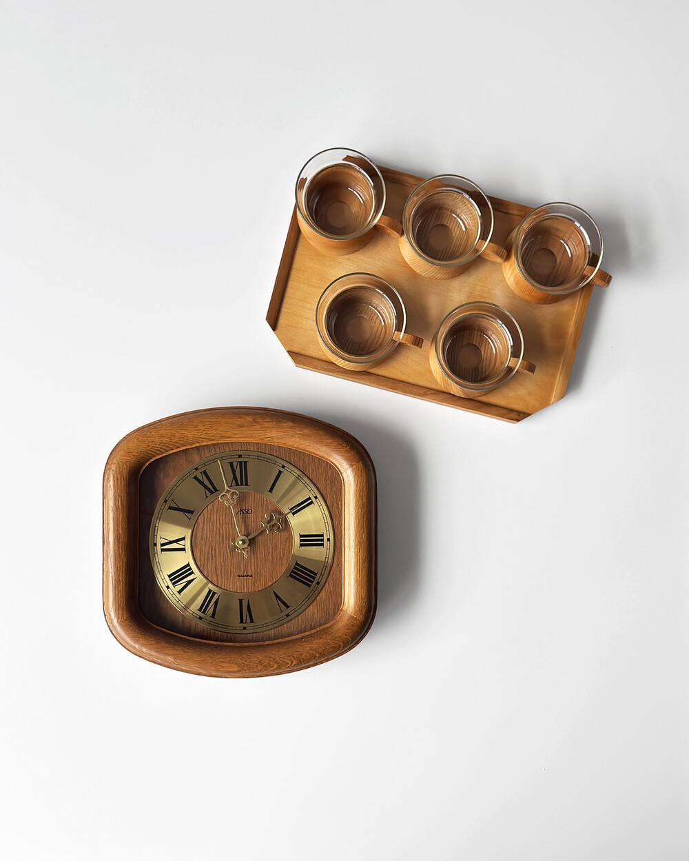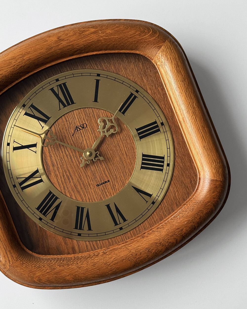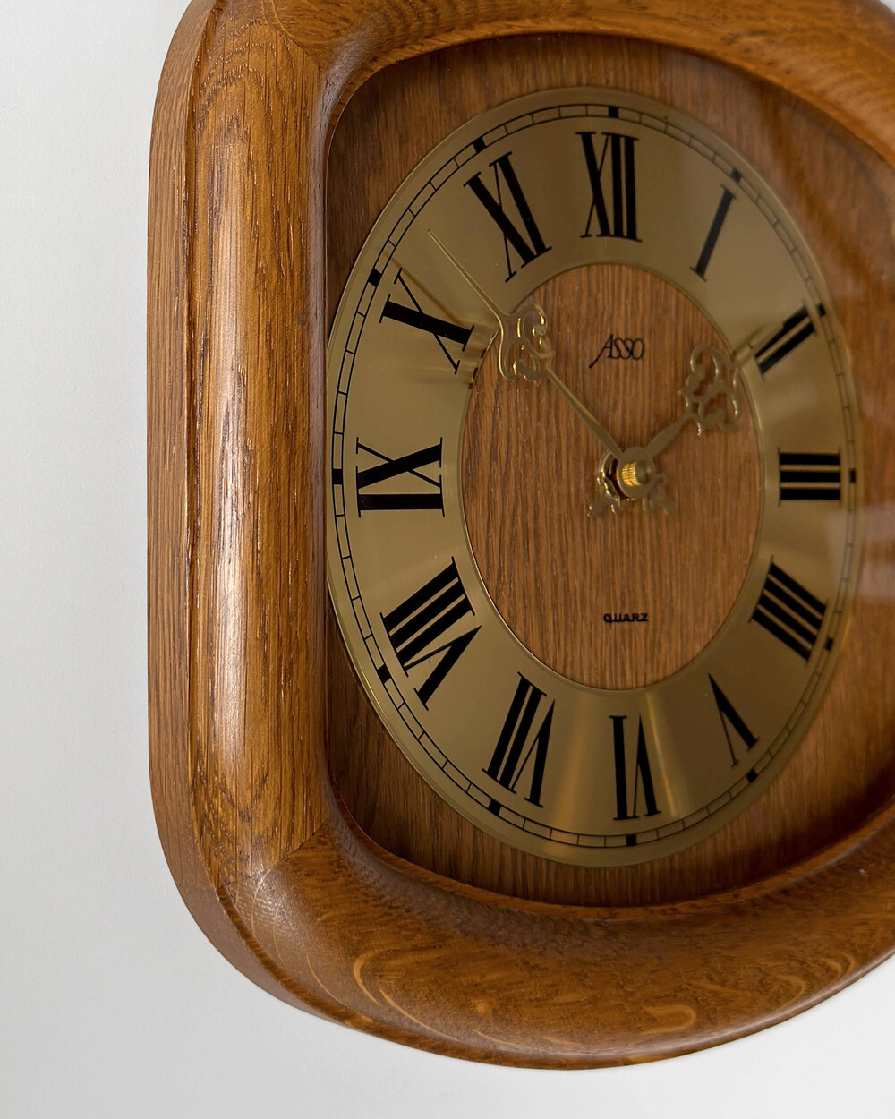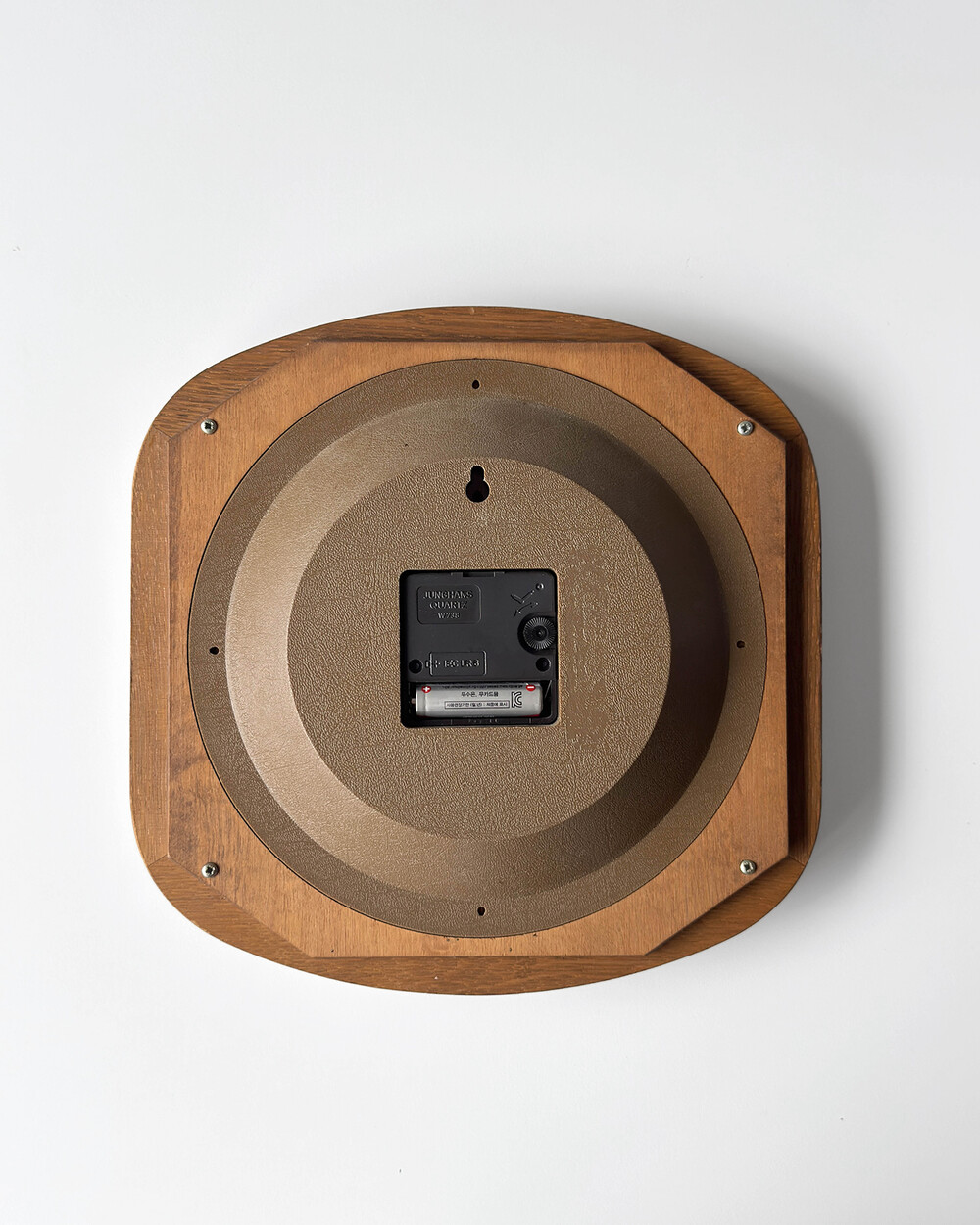 클래식한 아름다움을 지닌 브라운 우드 프레임과 브라스 메탈 다이얼이 어우러진 1970년대 독일의 시계회사 ASSO의 벽시계입니다. 부드러운 곡선으로 이어지는 담대한 실루엣과 시간이 깊이가 느껴지는 베이스에 장식적인 로만 인덱스와 핸즈가 더해져 시대 특유의 차분하고 고전적인 분위기를 공간에 더합니다.