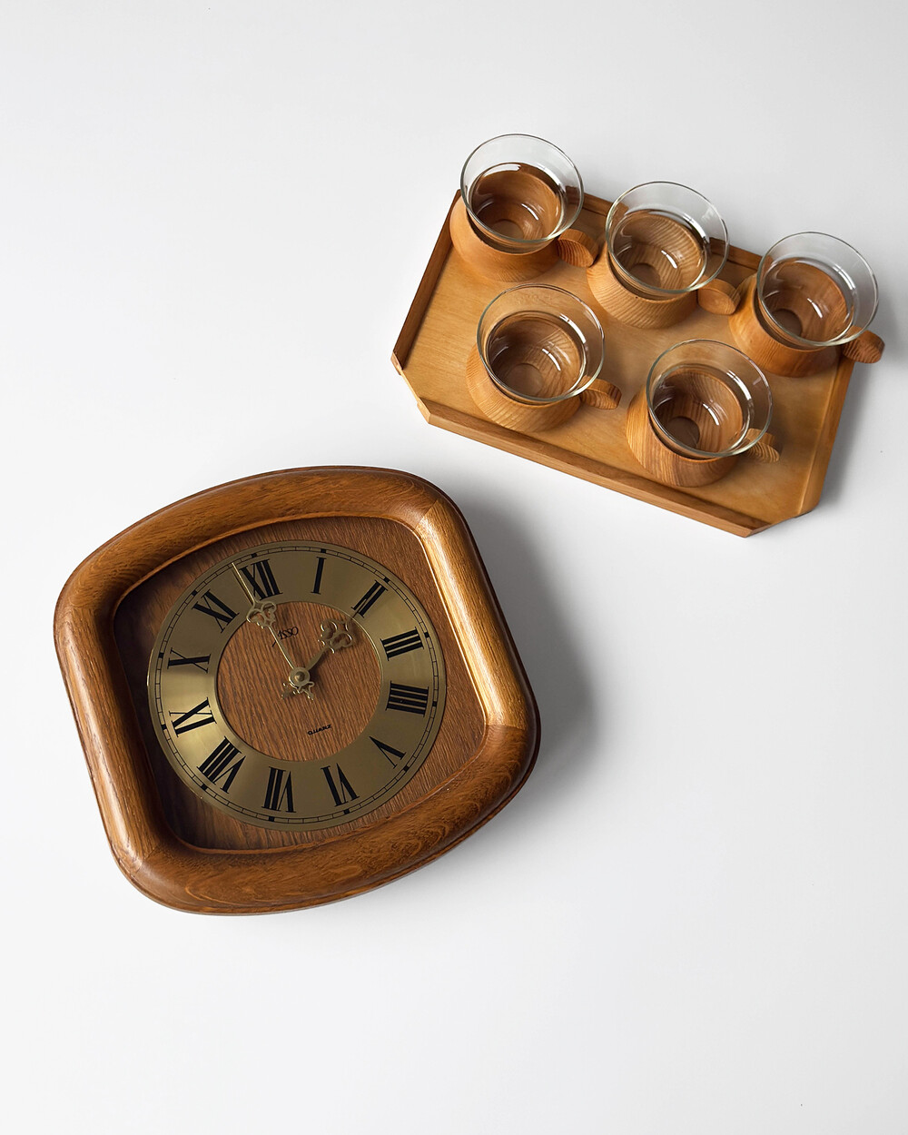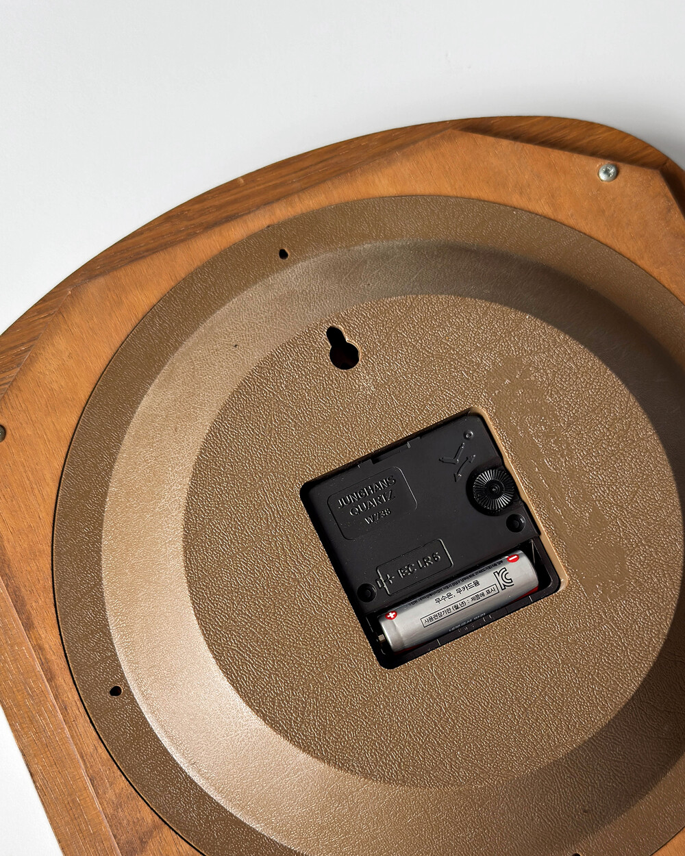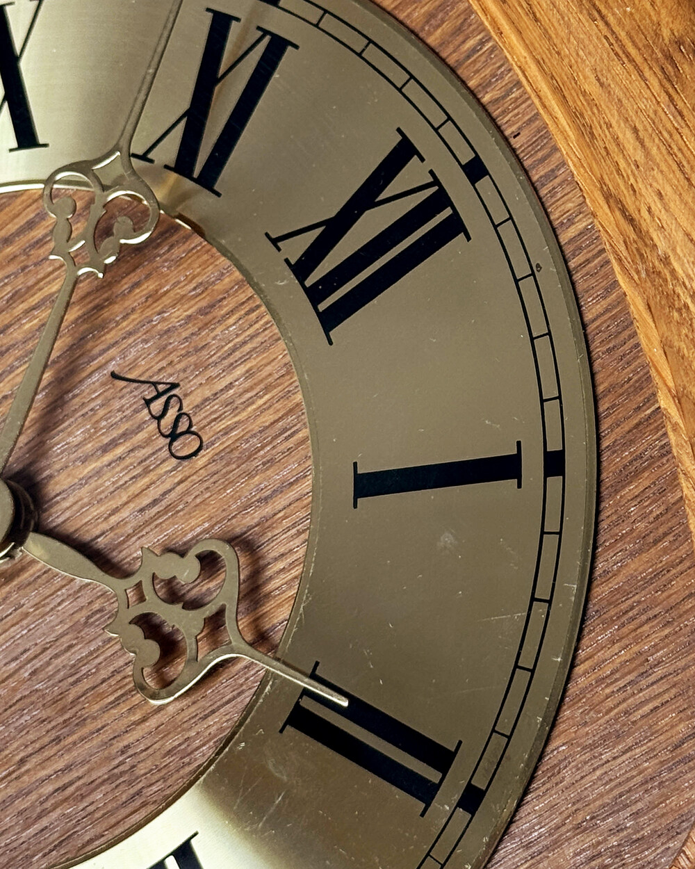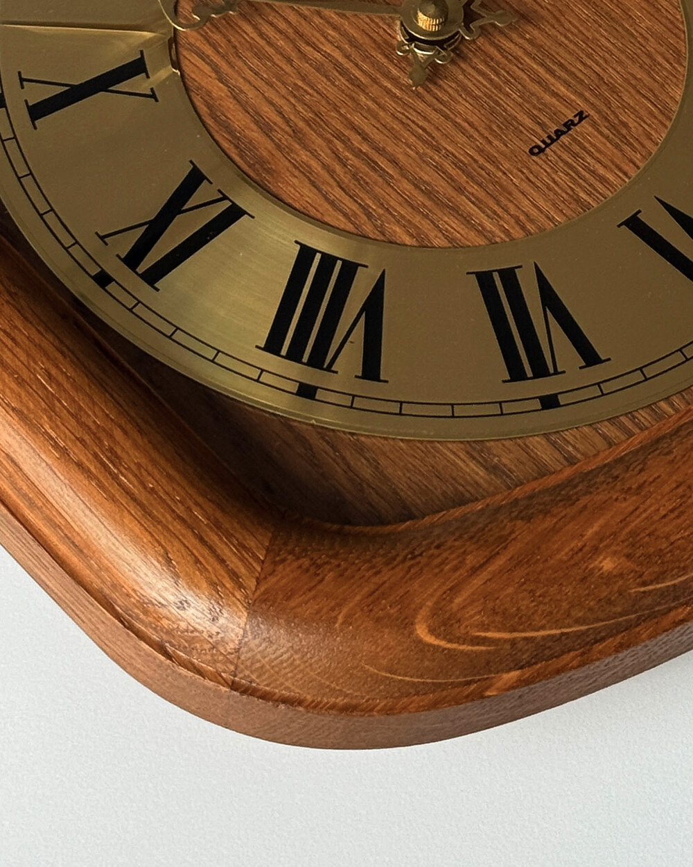 클래식한 아름다움을 지닌 브라운 우드 프레임과 브라스 메탈 다이얼이 어우러진 1970년대 독일의 시계회사 ASSO의 벽시계입니다. 부드러운 곡선으로 이어지는 담대한 실루엣과 시간이 깊이가 느껴지는 베이스에 장식적인 로만 인덱스와 핸즈가 더해져 시대 특유의 차분하고 고전적인 분위기를 공간에 더합니다.