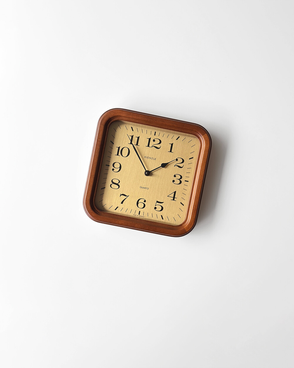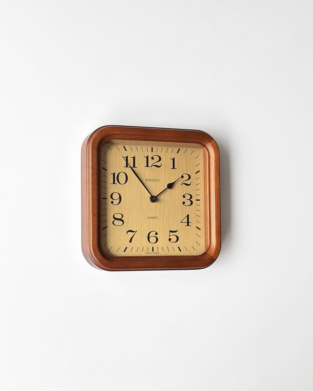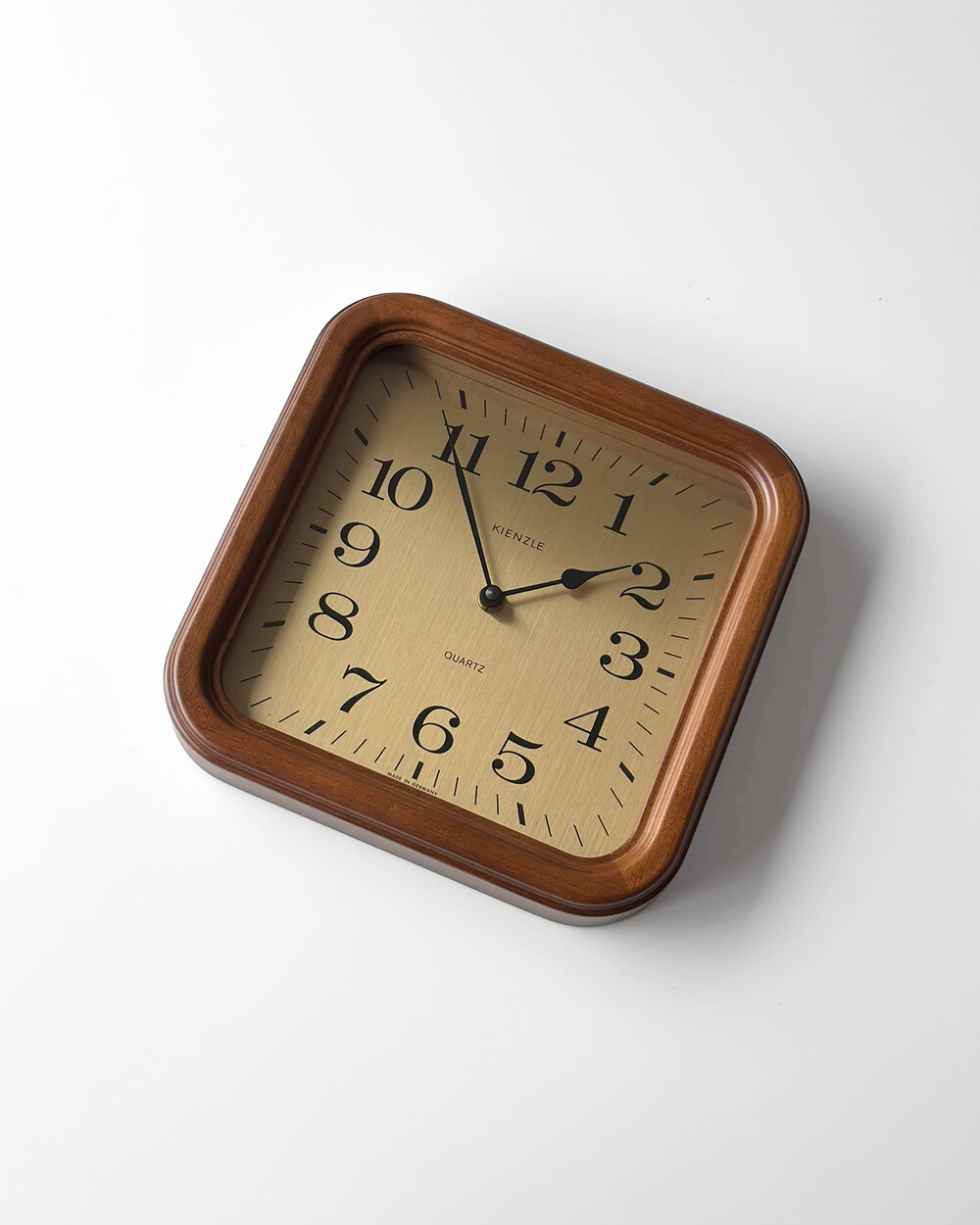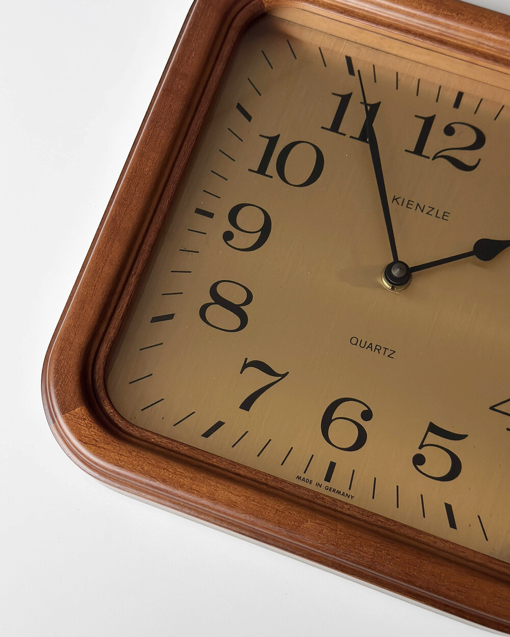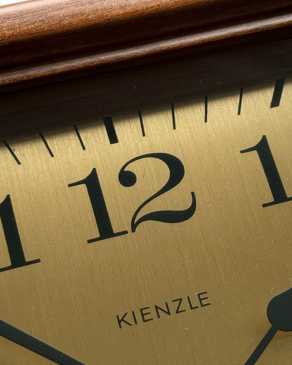 클래식한 아름다움을 지닌 브라운 우드 프레임과 브라스 메탈 다이얼이 어우러진 1970년대 빈티지 벽시계입니다. 1822년 설립된 독일의 시계 브랜드 Kienzle에서 제작된 모델로, 박스에 보관된 미사용 상태로 입고되었습니다. 부드러운 곡선으로 이어지는 단정한 실루엣과 시간의 깊이가 느껴지는 소재가 조화를 이루는 디자인입니다.