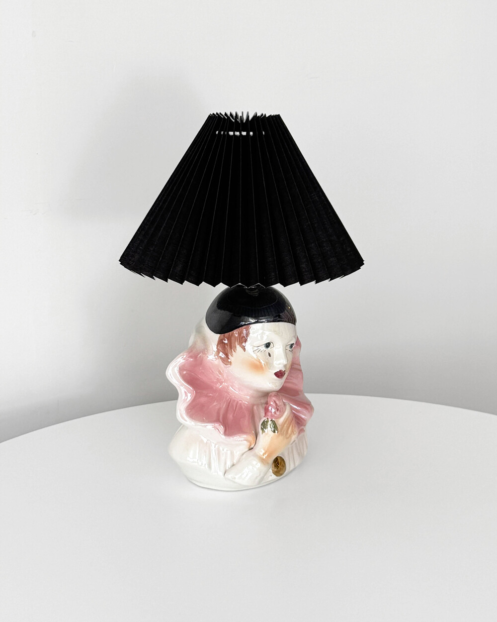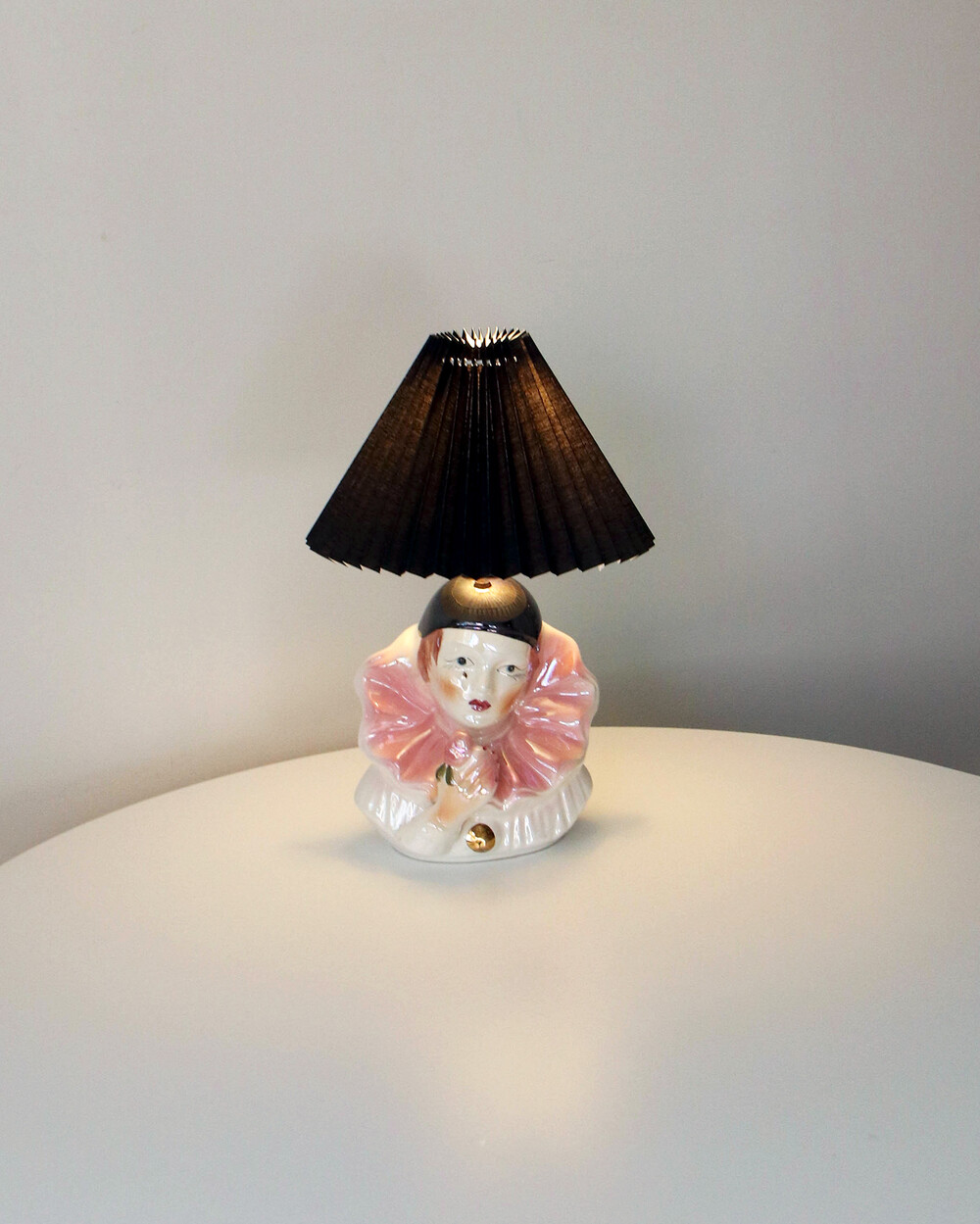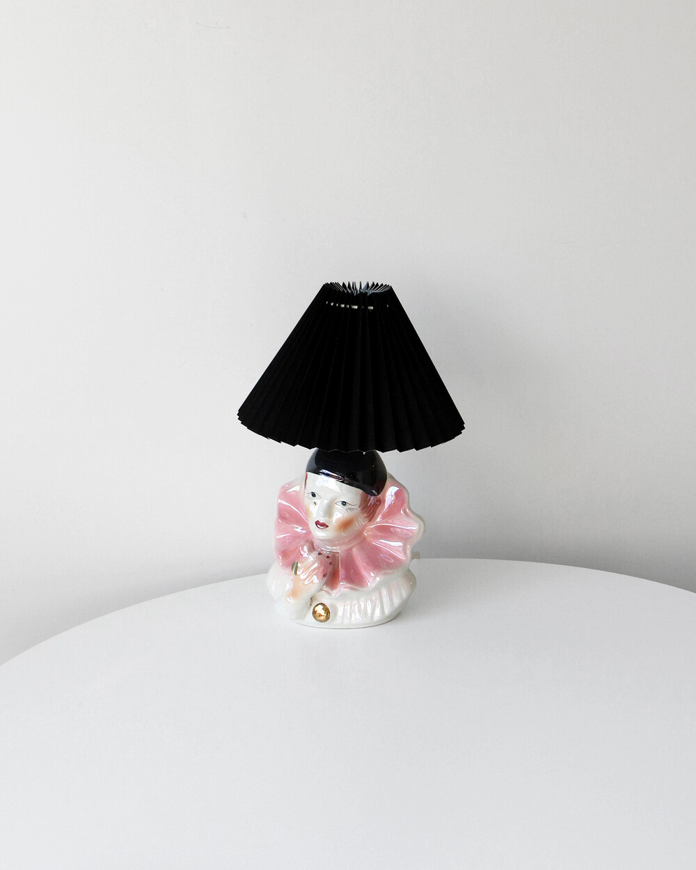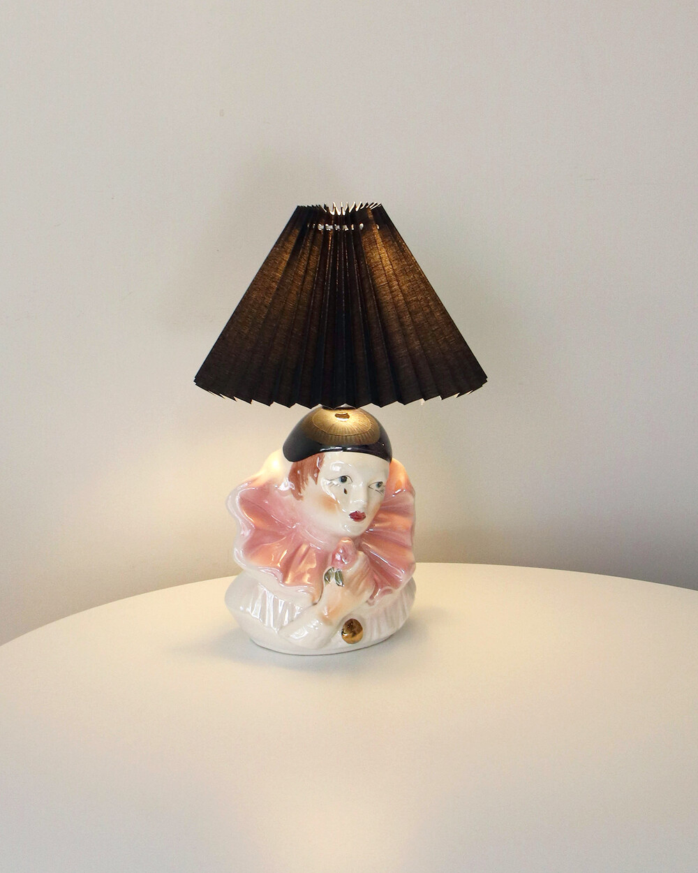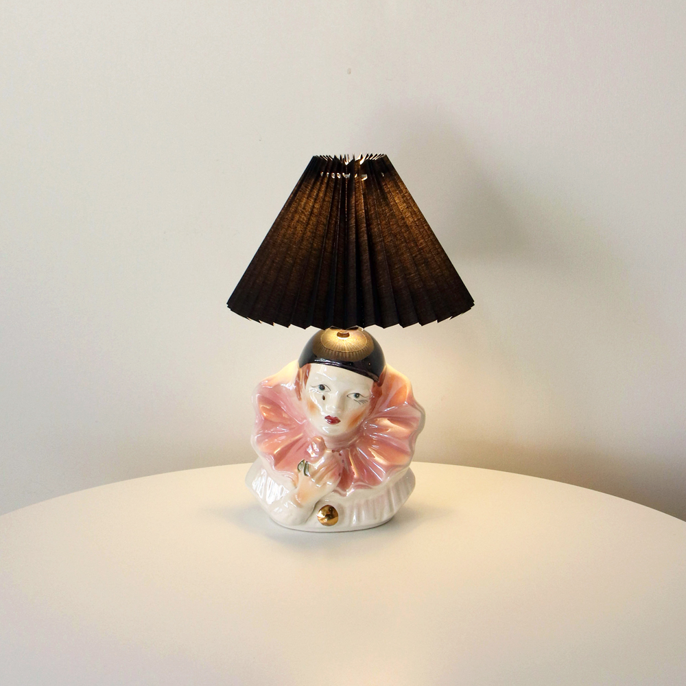 핑크 톤의 러플 칼라와 섬세하게 표현된 얼굴과 손 디테일, 골드 컬러 포인트가 어우러진 삐에로 테이블 조명입니다. 광택감이 뛰어난 세라믹 베이스와 블랙 플리츠 패브릭 셰이드가 대비를 이루며, 점등 시에는 빛이 부드럽게 퍼져 삐에로의 표정이 자연스럽게 드러납니다. 독일에서 제작된 1980년대 빈티지 조명으로, 공간에 위트를 더해줄 키치한 매력의 아트 오브제입니다.