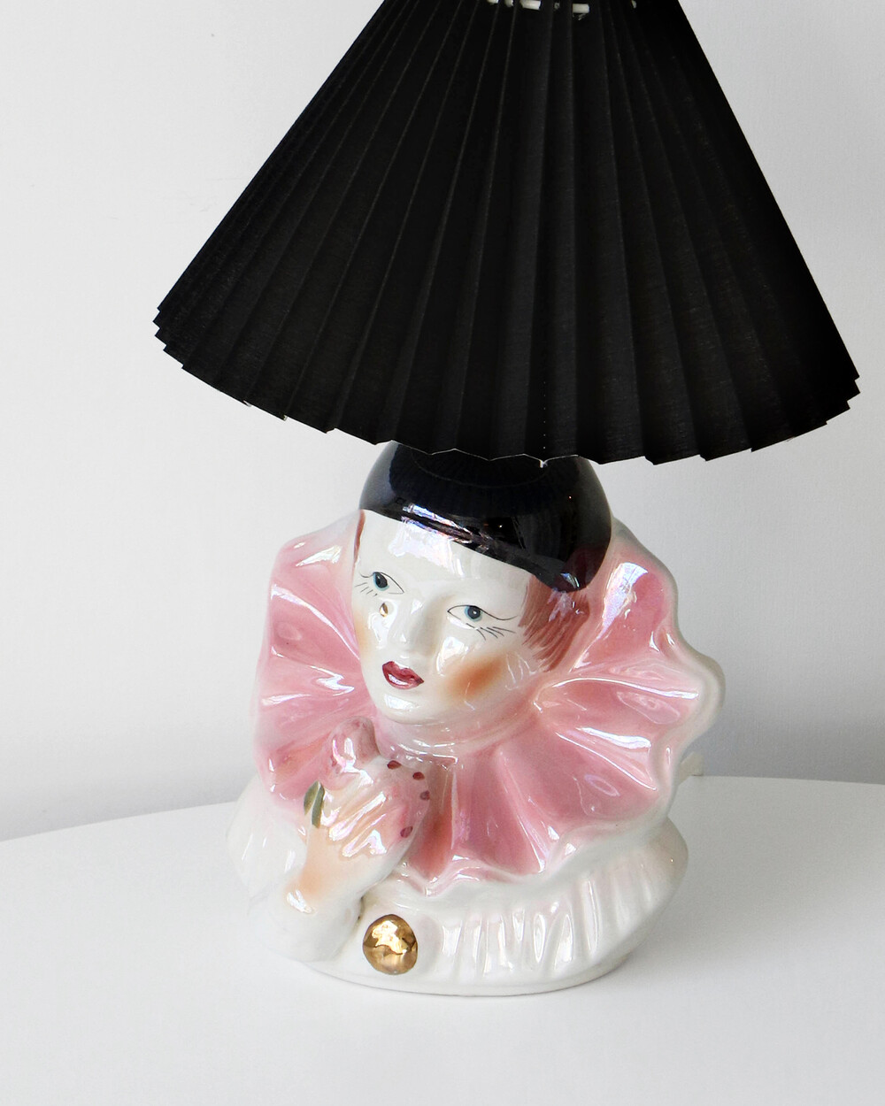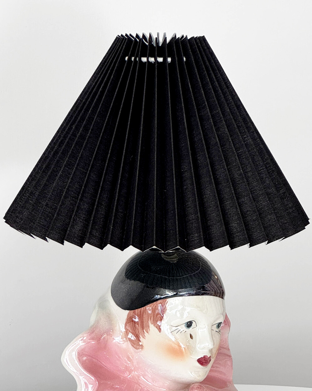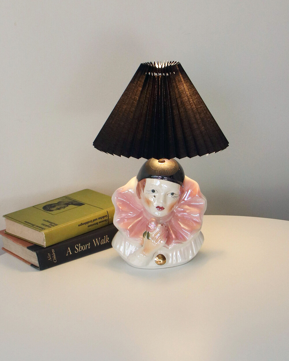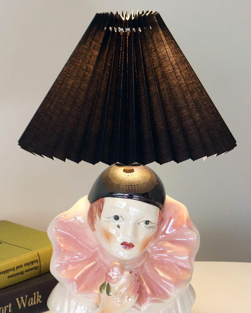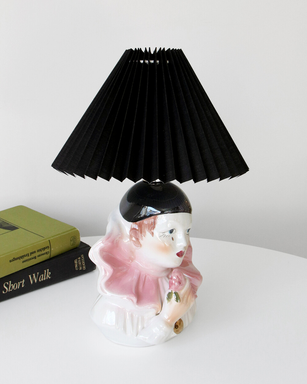 핑크 톤의 러플 칼라와 섬세하게 표현된 얼굴과 손 디테일, 골드 컬러 포인트가 어우러진 삐에로 테이블 조명입니다. 광택감이 뛰어난 세라믹 베이스와 블랙 플리츠 패브릭 셰이드가 대비를 이루며, 점등 시에는 빛이 부드럽게 퍼져 삐에로의 표정이 자연스럽게 드러납니다. 독일에서 제작된 1980년대 빈티지 조명으로, 공간에 위트를 더해줄 키치한 매력의 아트 오브제입니다.