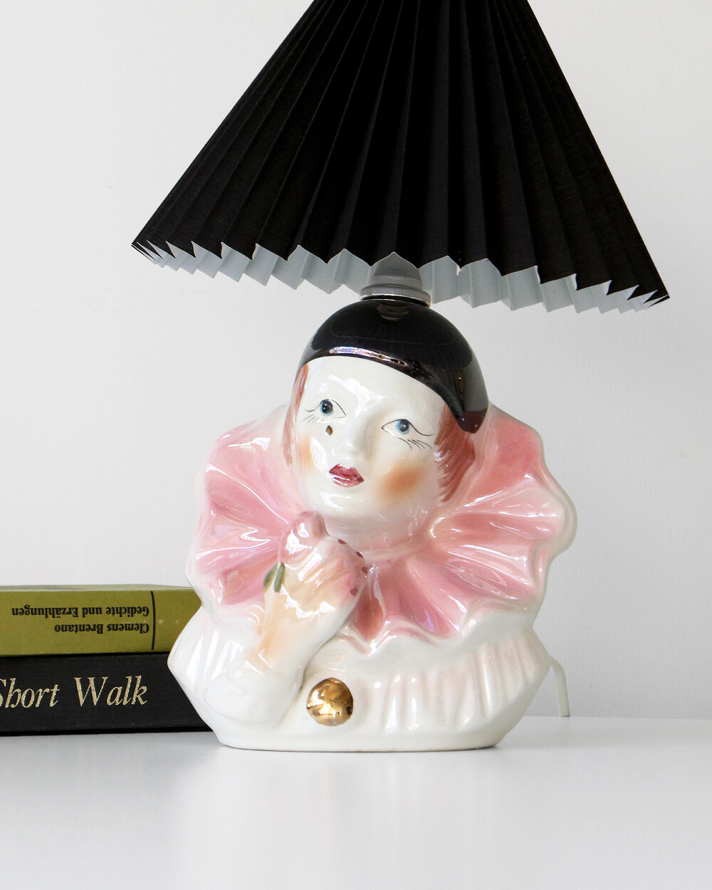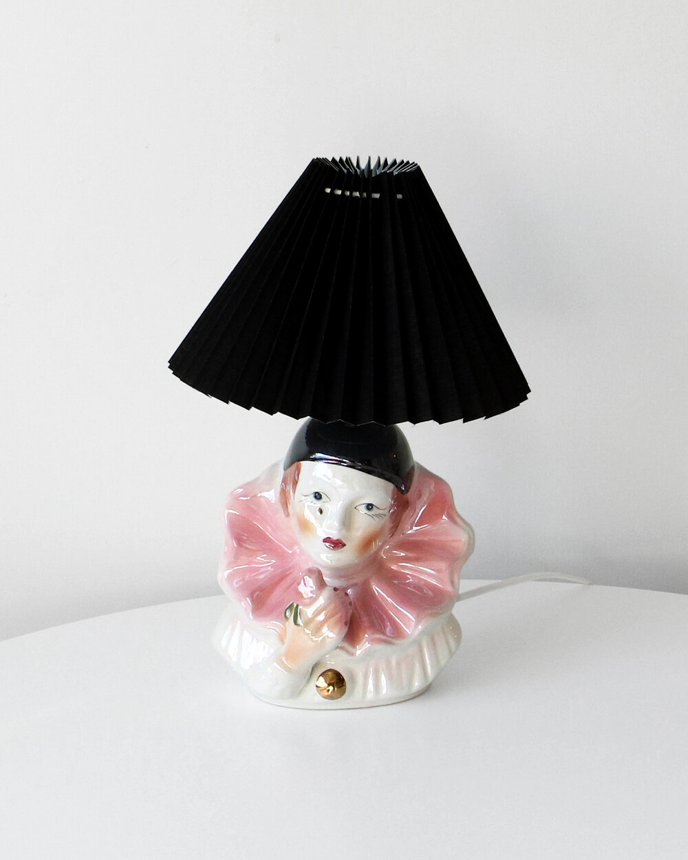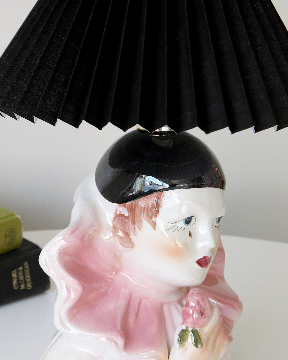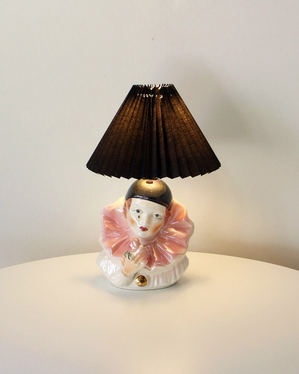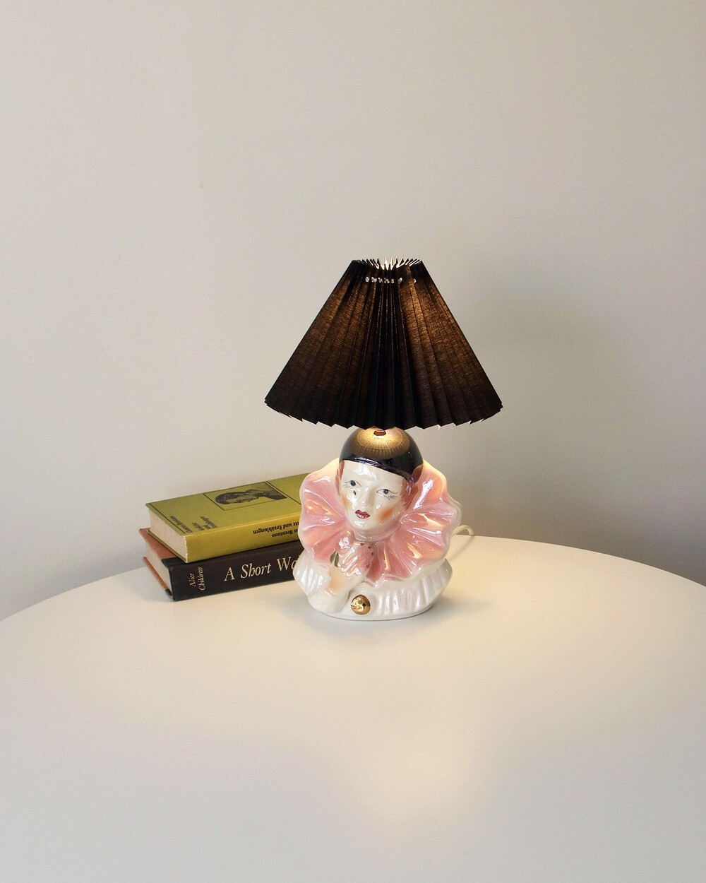 핑크 톤의 러플 칼라와 섬세하게 표현된 얼굴과 손 디테일, 골드 컬러 포인트가 어우러진 삐에로 테이블 조명입니다. 광택감이 뛰어난 세라믹 베이스와 블랙 플리츠 패브릭 셰이드가 대비를 이루며, 점등 시에는 빛이 부드럽게 퍼져 삐에로의 표정이 자연스럽게 드러납니다. 독일에서 제작된 1980년대 빈티지 조명으로, 공간에 위트를 더해줄 키치한 매력의 아트 오브제입니다.
