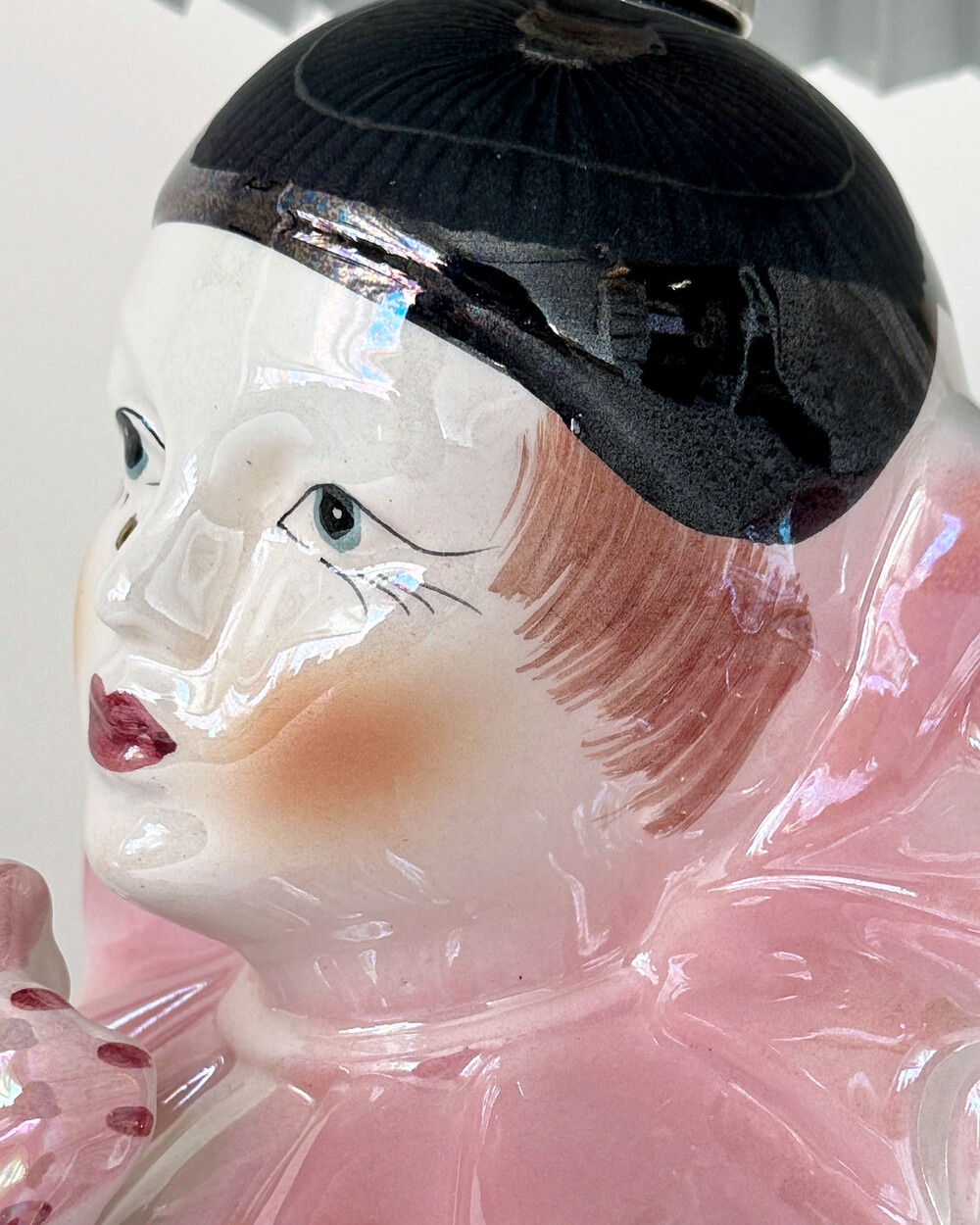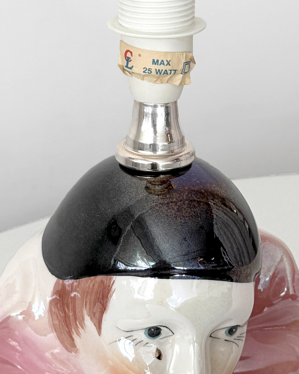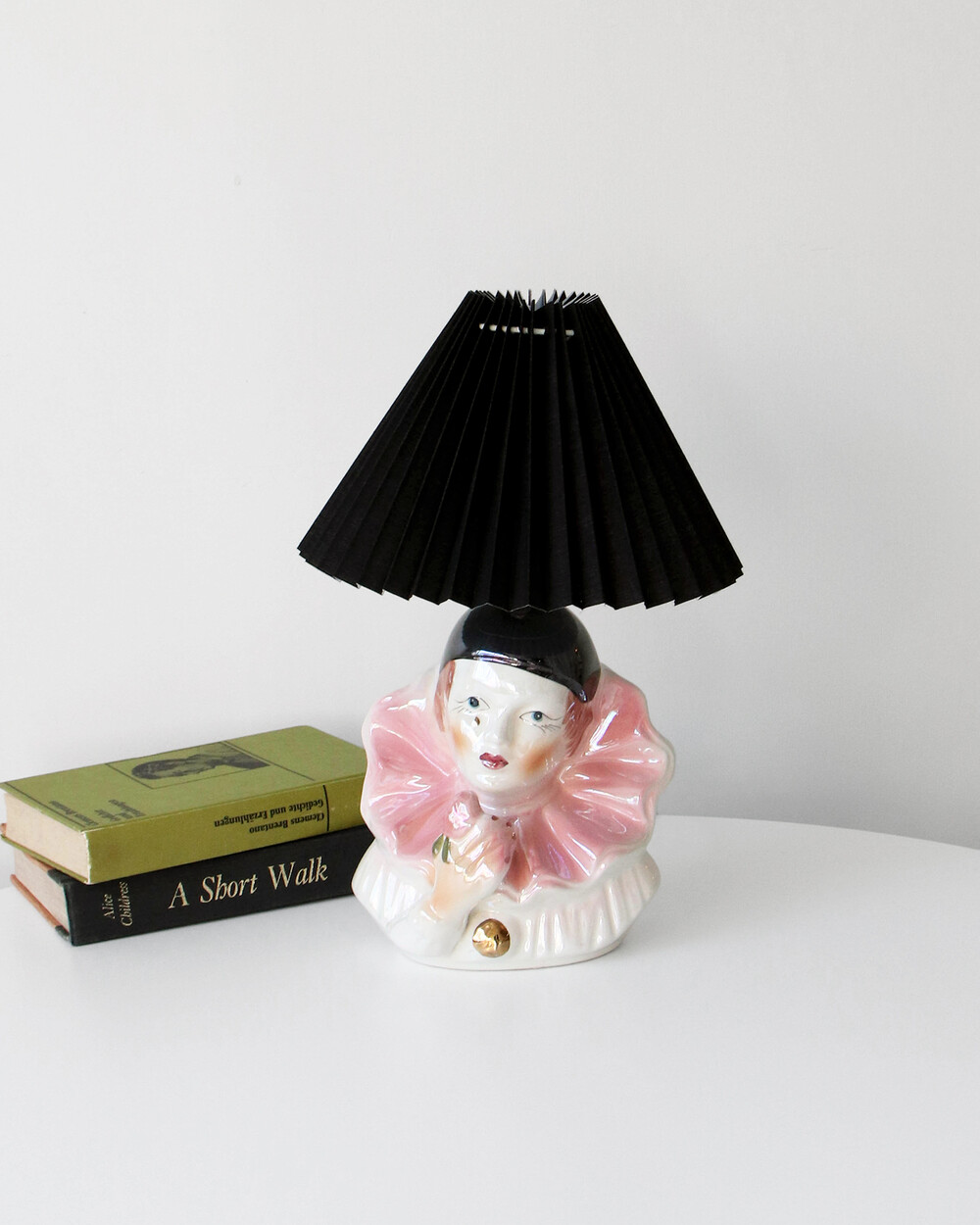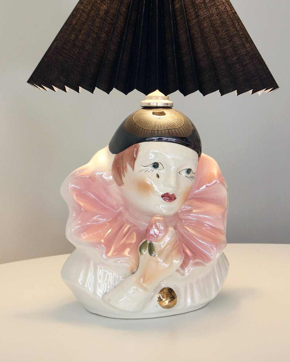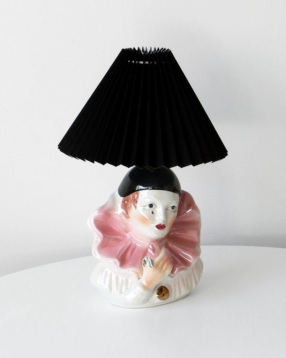 핑크 톤의 러플 칼라와 섬세하게 표현된 얼굴과 손 디테일, 골드 컬러 포인트가 어우러진 삐에로 테이블 조명입니다. 광택감이 뛰어난 세라믹 베이스와 블랙 플리츠 패브릭 셰이드가 대비를 이루며, 점등 시에는 빛이 부드럽게 퍼져 삐에로의 표정이 자연스럽게 드러납니다. 독일에서 제작된 1980년대 빈티지 조명으로, 공간에 위트를 더해줄 키치한 매력의 아트 오브제입니다.